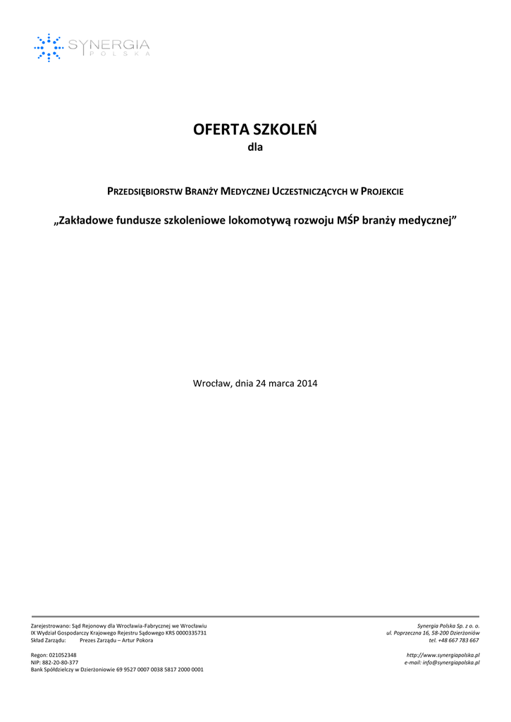 OFERTA SZKOLEŃ dla PRZEDSIĘBIORSTW BRANŻY MEDYCZNEJ UCZESTNICZĄCYCH W PROJEKCIE „Zakładowe fundusze szkoleniowe lokomotywą rozwoju MŚP branży medycznej” Wrocław, dnia 24 marca 2014 Zarejestrowano: Sąd Rejonowy dla Wrocławia-Fabrycznej we Wrocławiu IX Wydział Gospodarczy Krajowego Rejestru Sądowego KRS 0000335731 Skład Zarządu: Prezes Zarządu – Artur Pokora Regon: 021052348 NIP: 882-20-80-377 Bank Spółdzielczy w Dzierżoniowie 69 9527 0007 0038 5817 2000 0001 Synergia Polska Sp. z o. o. ul. Poprzeczna 16, 58-200 Dzierżoniów tel. +48 667 783 667 http://www.synergiapolska.pl e-mail: [email protected] Szanowni Państwo, zapraszamy do zapoznania się z załączoną ofertą szkoleniową przygotowaną przez firmę Synergia Polska, której główną misją jest wspieranie rozwoju placówek medycznych. Specjalnie dla Państwa przygotowaliśmy programy szkoleniowe, które są bezpośrednią odpowiedzią na zgłoszone potrzeby. Mając na uwadze Państwa oczekiwania podjęliśmy współpracę z ekspertami-praktykami, którzy w przystępny i efektywny sposób, przekażą Państwu wiedzę, udzielą praktycznych rad i rozwiną potrzebne umiejętności. Szczególną uwagę zwracamy na kompleksowość naszej oferty, począwszy od obszaru zarządzania z możliwością indywidualnego doradztwa menadżerskiego, szkoleń specjalistycznych dla personelu medycznego i pracowników administracji. Proponujemy szkolenia skoncentrowane wokół 3 poniższych zagadnień: 1. Zarządzanie w tym • zarządzanie zespołem, • rozwój kompetencji osobistych 2. Obsługa pacjenta i sprzedaż usług medycznych 3. Administracja Szczegółowe informacje o tematach, trenerach i kosztach znajdziecie Państwo w załączonej specyfikacji do oferty. Informujemy, że jesteśmy również gotowi przygotować i przeprowadzić dodatkowe szkolenia specjalistyczne związane z branżą medyczną dla osób zainteresowanych. Oprócz przygotowanych programów możemy również przygotować indywidualny program szkoleń dopasowany nie tylko tematycznie ale również zoptymalizowany pod względem budżetowym. Dla Państwa komfortu oferujemy również kompleksową obsługę organizacji powyższych szkoleń czyli wynajmu sal, cateringu, dojazdu itd. Organizujemy również szkolenia wyjazdowe z elementami integracji zespołowej. Polecamy w szczególności szkolenia łączone z eventami typu „team biling”. Zachęcam do skorzystania z przygotowanej specjalnie dla Państwa oferty szkoleniowej Z poważaniem, Artur Pokora - Prezes Zarządu Zarejestrowano: Sąd Rejonowy dla Wrocławia-Fabrycznej we Wrocławiu IX Wydział Gospodarczy Krajowego Rejestru Sądowego KRS 0000335731 Skład Zarządu: Prezes Zarządu – Artur Pokora Regon: 021052348 NIP: 882-20-80-377 Bank Spółdzielczy w Dzierżoniowie 69 9527 0007 0038 5817 2000 0001 Synergia Polska Sp. z o. o. ul. Poprzeczna 16, 58-200 Dzierżoniów tel. +48 667 783 667 http://www.synergiapolska.pl e-mail: [email protected]