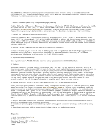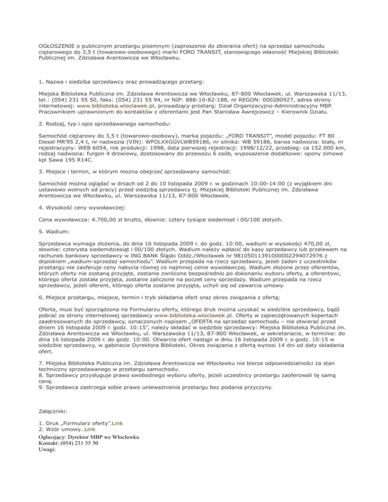 OGŁOSZENIE o publicznym przetargu pisemnym (zaproszenie do zbierania ofert) na sprzedaż samochodu ciężarowego do 3,5 t (towarowo-osobowego) marki FORD TRANSIT, stanowiącego własność Miejskiej Biblioteki Publicznej im. Zdzisława Arentowicza we Włocławku. 1. Nazwa i siedziba sprzedawcy oraz prowadzącego przetarg: Miejska Biblioteka Publiczna im. Zdzisława Arentowicza we Włocławku, 87-800 Włocławek, ul. Warszawska 11/13, tel.: (054) 231 55 50, faks: (054) 231 55 94, nr NIP: 888-10-82-188, nr REGON: 000280927, adres strony internetowej: www.biblioteka.wloclawek.pl, prowadzący przetarg: Dział Organizacyjno-Administracyjny MBP. Pracownikiem uprawnionym do kontaktów z oferentami jest Pan Stanisław Awrejcewicz – Kierownik Działu. 2. Rodzaj, typ i opis sprzedawanego samochodu: Samochód ciężarowy do 3,5 t (towarowo-osobowy), marka pojazdu: „FORD TRANSIT”, model pojazdu: FT 80 Diesel MR’95 2,4 t, nr nadwozia (VIN): WFOLXXGGVLWB59186, nr silnika: WB 59186, barwa nadwozia: biały, nr rejestracyjny: WEB 6054, rok produkcji: 1998, data pierwszej rejestracji: 1998/12/22, przebieg: ca 152.000 km, rodzaj nadwozia: furgon 4 drzwiowy, dostosowany do przewozu 6 osób, wyposażenie dodatkowe: opony zimowe kpl Sawa 195 R14C. 3. Miejsce i termin, w którym można obejrzeć sprzedawany samochód: Samochód można oglądać w dniach od 2 do 10 listopada 2009 r. w godzinach 10:00-14:00 (z wyjątkiem dni ustawowo wolnych od pracy) przed siedzibą sprzedawcy tj. Miejskiej Biblioteki Publicznej im. Zdzisława Arentowicza we Włocławku, ul. Warszawska 11/13, 87-800 Włocławek. 4. Wysokość ceny wywoławczej: Cena wywoławcza: 4.700,00 zł brutto, słownie: cztery tysiące siedemset i 00/100 złotych. 5. Wadium: Sprzedawca wymaga złożenia, do dnia 16 listopada 2009 r. do godz. 10:00, wadium w wysokości 470,00 zł, słownie: czterysta siedemdziesiąt i 00/100 złotych. Wadium należy wpłacić do kasy sprzedawcy lub przelewem na rachunek bankowy sprzedawcy w ING BANK Śląski Oddz./Włocławek nr 98105011391000002294072976 z dopiskiem „wadium-sprzedaż samochodu”. Wadium przepada na rzecz sprzedawcy, jeżeli żaden z uczestników przetargu nie zaoferuje ceny nabycia równej co najmniej cenie wywoławczej. Wadium złożone przez oferentów, których oferty nie zostaną przyjęte, zostanie zwrócone bezpośrednio po dokonaniu wyboru oferty, a oferentowi, którego oferta została przyjęta, zostanie zaliczone na poczet ceny sprzedaży. Wadium przepada na rzecz sprzedawcy, jeżeli oferent, którego oferta zostanie przyjęta, uchyli się od zawarcia umowy. 6. Miejsce przetargu, miejsce, termin i tryb składania ofert oraz okres związania z ofertą: Oferta, musi być sporządzona na Formularzu oferty, którego druk można uzyskać w siedzibie sprzedawcy, bądź pobrać ze strony internetowej sprzedawcy www.biblioteka.wloclawek.pl. Oferty w zapieczętowanych kopertach zaadresowanych do sprzedawcy, oznaczonych napisem „OFERTA na sprzedaż samochodu – nie otwierać przed dniem 16 listopada 2009 r. godz. 10:15”, należy składać w siedzibie sprzedawcy: Miejska Biblioteka Publiczna im. Zdzisława Arentowicza we Włocławku, ul. Warszawska 11/13, 87-800 Włocławek, w sekretariacie, w terminie: do dnia 16 listopada 2009 r. do godz. 10:00. Otwarcie ofert nastąpi w dniu 16 listopada 2009 r. o godz. 10:15 w siedzibie sprzedawcy, w gabinecie Dyrektora Biblioteki. Okres związania z ofertą wynosi 14 dni od daty składania ofert. 7. Miejska Biblioteka Publiczna im. Zdzisława Arentowicza we Włocławku nie bierze odpowiedzialności za stan techniczny sprzedawanego w przetargu samochodu. 8. Sprzedawcy przysługuje prawo swobodnego wyboru oferty, jeżeli uczestnicy przetargu zaoferowali tę samą cenę. 9. Sprzedawca zastrzega sobie prawo unieważnienia przetargu bez podania przyczyny. Załączniki: 1. Druk „Formularz oferty”.Link 2. Wzór umowy..Link Ogłaszjący: Dyrektor MBP we Włocławku Kontakt: (054) 231 55 50 Uwagi: Wyniki przetargu Miejska Biblioteka Publiczna im. Z. Arentowicza we Włocławku, 87-800 Włocławek, ul. Warszawska 11/13, tel.: (054) 231 55 50, zawiadamia, że w publicznym pisemnym przetargu przeprowadzonym na sprzedaż samochodu ciężarowego do 3,5t (towarowo-osobowego) marki FORD TRANSIT, rok produkcji 1998, przebieg: ca 152 tys. km, rodzaj nadwozia: furgon 4 drzwiowy, dostosowany do przewozu 6 osób, wyposażenie dodatkowe: opony zimowe, przyjęła ofertę firmy "ALUMAR" Marek Przyłuski z siedzibą w miejscowości Szczkówek 34, 87-865 Izbica Kujawska (oferta nr 3), która zaoferowała najwyższą cenę tj. 6.500,00 zł brutto, słownie: sześć tysięcy pięćset i 00/100 złotych