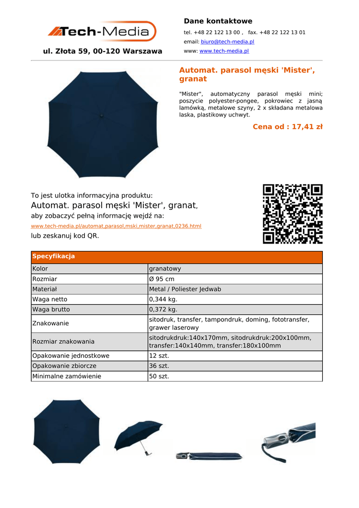 Dane kontaktowe tel. +48 22 122 13 00 , fax. +48 22 122 13 01 email: [email protected] ul. Złota 59, 00-120 Warszawa www: www.tech-media.pl Automat. parasol męski 'Mister', granat "Mister", automatyczny parasol męski mini; poszycie polyester-pongee, pokrowiec z jasną lamówką, metalowe szyny, 2 x składana metalowa laska, plastikowy uchwyt. Cena od : 17,41 zł To jest ulotka informacyjna produktu: Automat. parasol męski 'Mister', granat, aby zobaczyć pełną informację wejdź na: www.tech-media.pl/automat,parasol,mski,mister,granat,0236.html lub zeskanuj kod QR. Specyfikacja Kolor granatowy Rozmiar Ø 95 cm Materiał Metal / Poliester Jedwab Waga netto 0,344 kg. Waga brutto 0,372 kg. Znakowanie sitodruk, transfer, tampondruk, doming, fototransfer, grawer laserowy Rozmiar znakowania sitodrukdruk:140x170mm, sitodrukdruk:200x100mm, transfer:140x140mm, transfer:180x100mm Opakowanie jednostkowe 12 szt. Opakowanie zbiorcze 36 szt. Minimalne zamówienie 50 szt.
