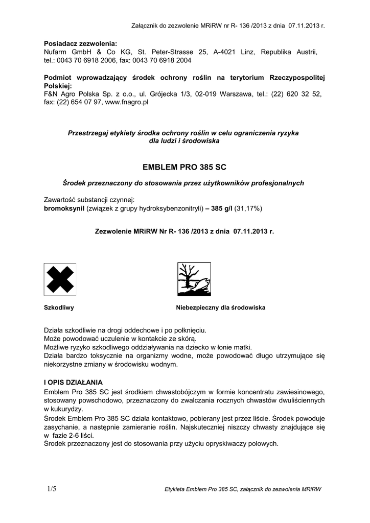 Załącznik do zezwolenie MRiRW nr R- 136 /2013 z dnia 07.11.2013 r. Posiadacz zezwolenia: Nufarm GmbH & Co KG, St. Peter-Strasse 25, A-4021 Linz, Republika Austrii, tel.: 0043 70 6918 2006, fax: 0043 70 6918 2004 Podmiot wprowadzający środek ochrony roślin na terytorium Rzeczypospolitej Polskiej: F&N Agro Polska Sp. z o.o., ul. Grójecka 1/3, 02-019 Warszawa, tel.: (22) 620 32 52, fax: (22) 654 07 97, www.fnagro.pl Przestrzegaj etykiety środka ochrony roślin w celu ograniczenia ryzyka dla ludzi i środowiska EMBLEM PRO 385 SC Środek przeznaczony do stosowania przez użytkowników profesjonalnych Zawartość substancji czynnej: bromoksynil (związek z grupy hydroksybenzonitryli) – 385 g/l (31,17%) Zezwolenie MRiRW Nr R- 136 /2013 z dnia 07.11.2013 r. Szkodliwy Niebezpieczny dla środowiska Działa szkodliwie na drogi oddechowe i po połknięciu. Może powodować uczulenie w kontakcie ze skórą. Możliwe ryzyko szkodliwego oddziaływania na dziecko w łonie matki. Działa bardzo toksycznie na organizmy wodne, może powodować długo utrzymujące się niekorzystne zmiany w środowisku wodnym. I OPIS DZIAŁANIA Emblem Pro 385 SC jest środkiem chwastobójczym w formie koncentratu zawiesinowego, stosowany powschodowo, przeznaczony do zwalczania rocznych chwastów dwuliściennych w kukurydzy. Środek Emblem Pro 385 SC działa kontaktowo, pobierany jest przez liście. Środek powoduje zasychanie, a następnie zamieranie roślin. Najskuteczniej niszczy chwasty znajdujące się w fazie 2-6 liści. Środek przeznaczony jest do stosowania przy użyciu opryskiwaczy polowych. 1/5 Etykieta Emblem Pro 385 SC, załącznik do zezwolenia MRiRW Załącznik do zezwolenie MRiRW nr R- 136 /2013 z dnia 07.11.2013 r. II DZIAŁANIE NA CHWASTY Chwasty wrażliwe: gwiazdnica pospolita, komosa biała, maruna bezwonna, psianka czarna, przetacznik perski, przytulia czepna, rdest plamisty, rumian polny, szarłat szorstki, tasznik pospolity, tobołki polne. Chwasty średnio wrażliwe: bodziszek drobny, jasnota purpurowa, rdest powojowy, rdest ptasi. Chwasty średnio odporne: fiołek polny. Chwasty odporne: chwastnica jednostronna, ostrożeń polny. II ZASTOSOWANIE ŚRODKA Kukurydza Środek stosować po wschodach, najlepiej w fazie 4-6 liści kukurydzy (na rośliny wysokości 15-20 cm), na chwasty w fazie 2-6 liści. Maksymalna dawka dla jednorazowego zastosowania: 1,0 l/ha. Zalecana dawka dla jednorazowego stosowania: 0,7 – 1,0 l/ha. Wyższą dawkę środka (1,0 l/ha) stosować na chwasty w późniejszych fazach rozwojowych (4-6 liści lub rozety) oraz na glebach cięższych. Środek może być stosowany do fazy 8 liści kukurydzy, o ile chwasty nie przekroczyły fazy wrażliwej. W celu rozszerzenia spektrum zwalczanych chwastów dwuliściennych oraz jednoczesnego zwalczania perzu i innych chwastów jednoliściennych można stosować łącznie ze środkiem Titus 25 WG w dawkach: - do zwalczania perzu: Maksymalna dawka dla jednorazowego zastosowania: Emblem Pro 385 SC 1,0 l/ha + Titus 25 WG 60 g/ha Zalecana dawka dla jednorazowego zastosowania: Emblem Pro 385 SC 0,7- 1,0 l/ha + Titus 25 WG 60 g/ha - do zwalczania chwastnicy jednostronnej i pozostałych prosowatych: Maksymalna dawka dla jednorazowego zastosowania: Emblem Pro 385 SC 1,0 l/ha + Titus 25 WG 30 g/ha Zalecana dawka dla jednorazowego zastosowania: Emblem Pro 385 SC 0,7-1,0 l/ha + Titus 25 WG 30 g/ha Maksymalna liczba zabiegów w sezonie wegetacyjnym – 1. Zalecana ilość wody: 200-300 l/ha. Zalecane opryskiwanie: średniokropliste. UWAGA W warunkach niekorzystnych dla wzrostu i rozwoju kukurydzy (przymrozki, duże wahania temperatur pomiędzy nocą i dniem, susza) po zastosowaniu środka mogą wystąpić przemijające uszkodzenia lub przebarwienia liści, które nie mają negatywnego wpływu na jakość i wielkość plonu. NASTĘPSTWO ROŚLIN 2/5 Etykieta Emblem Pro 385 SC, załącznik do zezwolenia MRiRW Załącznik do zezwolenie MRiRW nr R- 136 /2013 z dnia 07.11.2013 r. Środek rozkłada się w glebie wciągu okresu wegetacji do poziomu niestwarzającego zagrożenie dla roślin uprawianych następczo. W przypadku konieczności wcześniejszego zaorania kukurydzy (w wyniku uszkodzenia roślin przez choroby lub szkodniki), na tym samym polu można uprawiać wszystkie rośliny po uprzednim wykonaniu uprawy przedsiewnej. OKRES OD OSTATNIEGO ZASTOSOWANIA ŚRODKA NA ROŚLINY DO DNIA, W KTÓRYM MOŻNA SIAĆ LUB SADZIĆ ROŚLINY UPRAWIANE NASTĘPCZO Nie dotyczy. PRZECIWWSKAZANIA 1. Środka nie stosować: - w kukurydzy cukrowej; - na siewki kukurydzy oraz na rośliny w fazie rozwojowej późniejszej od zalecanej, ze względu na możliwość uszkodzenia roślin; - na rośliny osłabione i uszkodzone przez przymrozek, suszę, zalanie wodą, choroby lub szkodniki; - podczas suszy lub bezpośrednio przed spodziewanym deszczem. Podczas stosowania środka nie dopuścić do: - znoszenia cieczy użytkowej na sąsiednie rośliny uprawne; - nakładania się cieczy użytkowej na stykach pasów zabiegowych i uwrociach. IV SPORZĄDZANIE CIECZY UŻYTKOWEJ Przed przystąpieniem do sporządzenia cieczy użytkowej dokładnie ustalić potrzebną jej ilość. Zawartość opakowania przed użyciem wstrząsnąć. Odmierzoną ilość środka wlać do zbiornika opryskiwacza napełnionego częściowo wodą (z włączonym mieszadłem). Opróżnione opakowania przepłukać trzykrotnie wodą, a popłuczyny wlać do zbiornika opryskiwacza z cieczą użytkową. Następnie zbiornik opryskiwacza uzupełnić wodą do potrzebnej ilości. Po wlaniu środka do zbiornika opryskiwacza niewyposażonego w mieszadło hydrauliczne ciecz w zbiorniku mechanicznie wymieszać. W przypadku przerw w opryskiwaniu przed ponownym przystąpieniem do pracy dokładnie wymieszać ciecz użytkową w zbiorniku opryskiwacza. Po pracy aparaturę dokładnie wymyć. V ŚRODKI OSTROŻNOŚCI 1. OKRES OD ZASTOSOWANIA ŚRODKA DO DNIA, W KTÓRYM NA OBSZAR, NA KTÓRYM ZASTOSOWANO ŚRODEK, MOGĄ WEJŚĆ LUDZIE ORAZ ZOST