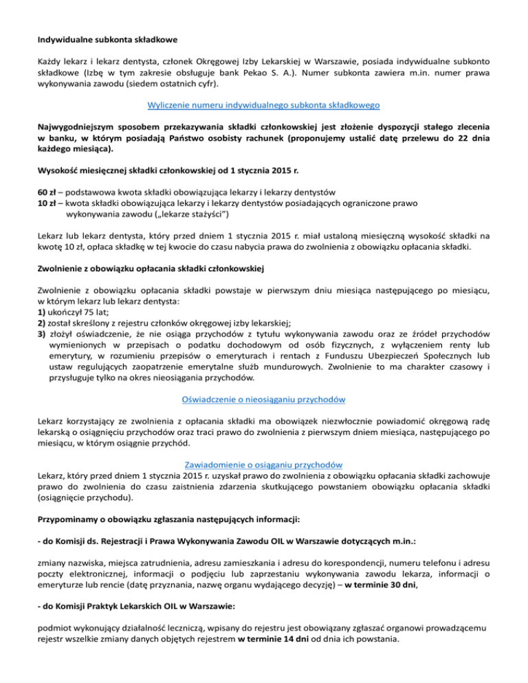 Indywidualne subkonta składkowe Każdy lekarz i lekarz dentysta, członek Okręgowej Izby Lekarskiej w Warszawie, posiada indywidualne subkonto składkowe (Izbę w tym zakresie obsługuje bank Pekao S. A.). Numer subkonta zawiera m.in. numer prawa wykonywania zawodu (siedem ostatnich cyfr). Wyliczenie numeru indywidualnego subkonta składkowego Najwygodniejszym sposobem przekazywania składki członkowskiej jest złożenie dyspozycji stałego zlecenia w banku, w którym posiadają Państwo osobisty rachunek (proponujemy ustalić datę przelewu do 22 dnia każdego miesiąca). Wysokość miesięcznej składki członkowskiej od 1 stycznia 2015 r. 60 zł – podstawowa kwota składki obowiązująca lekarzy i lekarzy dentystów 10 zł – kwota składki obowiązująca lekarzy i lekarzy dentystów posiadających ograniczone prawo wykonywania zawodu („lekarze stażyści”) Lekarz lub lekarz dentysta, który przed dniem 1 stycznia 2015 r. miał ustaloną miesięczną wysokość składki na kwotę 10 zł, opłaca składkę w tej kwocie do czasu nabycia prawa do zwolnienia z obowiązku opłacania składki. Zwolnienie z obowiązku opłacania składki członkowskiej Zwolnienie z obowiązku opłacania składki powstaje w pierwszym dniu miesiąca następującego po miesiącu, w którym lekarz lub lekarz dentysta: 1) ukończył 75 lat; 2) został skreślony z rejestru członków okręgowej izby lekarskiej; 3) złożył oświadczenie, że nie osiąga przychodów z tytułu wykonywania zawodu oraz ze źródeł przychodów wymienionych w przepisach o podatku dochodowym od osób fizycznych, z wyłączeniem renty lub emerytury, w rozumieniu przepisów o emeryturach i rentach z Funduszu Ubezpieczeń Społecznych lub ustaw regulujących zaopatrzenie emerytalne służb mundurowych. Zwolnienie to ma charakter czasowy i przysługuje tylko na okres nieosiągania przychodów. Oświadczenie o nieosiąganiu przychodów Lekarz korzystający ze zwolnienia z opłacania składki ma obowiązek niezwłocznie powiadomić okręgową radę lekarską o osiągnięciu przychodów oraz traci prawo do zwolnienia z pierwszym dniem miesiąca, następującego po miesiącu, w którym osiągnie przychód. Zawiadomienie o osiąganiu przychodów Lekarz, który przed dniem 1 stycznia 2015 r. uzyskał prawo do zwolnienia z obowiązku opłacania składki zachowuje prawo do zwolnienia do czasu zaistnienia zdarzenia skutkującego powstaniem obowiązku opłacania składki (osiągnięcie przychodu). Przypominamy o obowiązku zgłaszania następujących informacji: - do Komisji ds. Rejestracji i Prawa Wykonywania Zawodu OIL w Warszawie dotyczących m.in.: zmiany nazwiska, miejsca zatrudnienia, adresu zamieszkania i adresu do korespondencji, numeru telefonu i adresu poczty elektronicznej, informacji o podjęciu lub zaprzestaniu wykonywania zawodu lekarza, informacji o emeryturze lub rencie (datę przyznania, nazwę organu wydającego decyzję) – w terminie 30 dni, - do Komisji Praktyk Lekarskich OIL w Warszawie: podmiot wykonujący działalność leczniczą, wpisany do rejestru jest obowiązany zgłaszać organowi prowadzącemu rejestr wszelkie zmiany danych objętych rejestrem w terminie 14 dni od dnia ich powstania.
