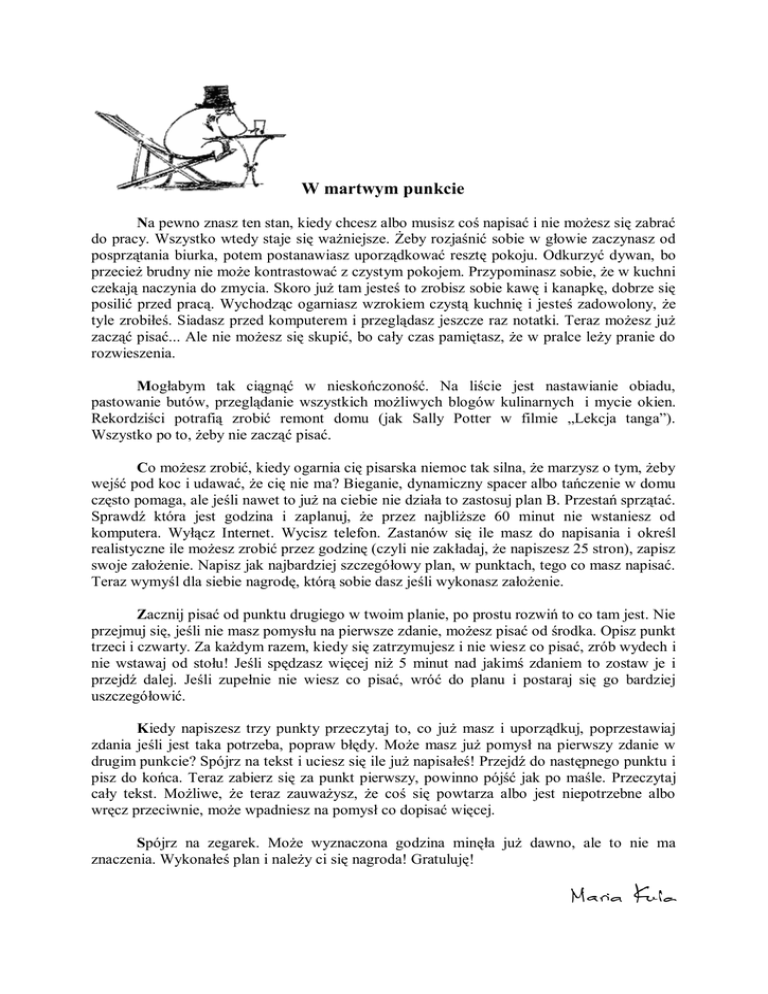 W martwym punkcie Na pewno znasz ten stan, kiedy chcesz albo musisz coś napisać i nie możesz się zabrać do pracy. Wszystko wtedy staje się ważniejsze. Żeby rozjaśnić sobie w głowie zaczynasz od posprzątania biurka, potem postanawiasz uporządkować resztę pokoju. Odkurzyć dywan, bo przecież brudny nie może kontrastować z czystym pokojem. Przypominasz sobie, że w kuchni czekają naczynia do zmycia. Skoro już tam jesteś to zrobisz sobie kawę i kanapkę, dobrze się posilić przed pracą. Wychodząc ogarniasz wzrokiem czystą kuchnię i jesteś zadowolony, że tyle zrobiłeś. Siadasz przed komputerem i przeglądasz jeszcze raz notatki. Teraz możesz już zacząć pisać... Ale nie możesz się skupić, bo cały czas pamiętasz, że w pralce leży pranie do rozwieszenia. Mogłabym tak ciągnąć w nieskończoność. Na liście jest nastawianie obiadu, pastowanie butów, przeglądanie wszystkich możliwych blogów kulinarnych i mycie okien. Rekordziści potrafią zrobić remont domu (jak Sally Potter w filmie „Lekcja tanga”). Wszystko po to, żeby nie zacząć pisać. Co możesz zrobić, kiedy ogarnia cię pisarska niemoc tak silna, że marzysz o tym, żeby wejść pod koc i udawać, że cię nie ma? Bieganie, dynamiczny spacer albo tańczenie w domu często pomaga, ale jeśli nawet to już na ciebie nie działa to zastosuj plan B. Przestań sprzątać. Sprawdź która jest godzina i zaplanuj, że przez najbliższe 60 minut nie wstaniesz od komputera. Wyłącz Internet. Wycisz telefon. Zastanów się ile masz do napisania i określ realistyczne ile możesz zrobić przez godzinę (czyli nie zakładaj, że napiszesz 25 stron), zapisz swoje założenie. Napisz jak najbardziej szczegółowy plan, w punktach, tego co masz napisać. Teraz wymyśl dla siebie nagrodę, którą sobie dasz jeśli wykonasz założenie. Zacznij pisać od punktu drugiego w twoim planie, po prostu rozwiń to co tam jest. Nie przejmuj się, jeśli nie masz pomysłu na pierwsze zdanie, możesz pisać od środka. Opisz punkt trzeci i czwarty. Za każdym razem, kiedy się zatrzymujesz i nie wiesz co pisać, zrób wydech i nie wstawaj od stołu! Jeśli spędzasz więcej niż 5 minut nad jakimś zdaniem to zostaw je i przejdź dalej. Jeśli zupełnie nie wiesz co pisać, wróć do planu i postaraj się go bardziej uszczegółowić. Kiedy napiszesz trzy punkty przeczytaj to, co już masz i uporządkuj, poprzestawiaj zdania jeśli jest taka potrzeba, popraw błędy. Może masz już pomysł na pierwszy zdanie w drugim punkcie? Spójrz na tekst i uciesz się ile już napisałeś! Przejdź do następnego punktu i pisz do końca. Teraz zabierz się za punkt pierwszy, powinno pójść jak po maśle. Przeczytaj cały tekst. Możliwe, że teraz zauważysz, że coś się powtarza albo jest niepotrzebne albo wręcz przeciwnie, może wpadniesz na pomysł co dopisać więcej. Spójrz na zegarek. Może wyznaczona godzina minęła już dawno, ale to nie ma znaczenia. Wykonałeś plan i należy ci się nagroda! Gratuluję!