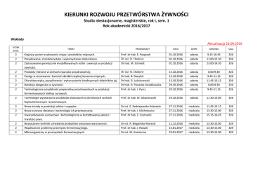 KIERUNKI ROZWOJU PRZETWÓRSTWA ŻYWNOŚCI Studia niestacjonarne, magisterskie, rok I, sem. 1 Rok akademicki 2016/2017 Wykłady Aktualizacja 26.09.2016 LICZBA GODZ. 2 2 2 2 2 2 2 2 2 2 2 2 2 2 2 TEMAT Krajowy system znakowania mięsa i produktów mięsnych. Pozyskiwanie, charakterystyka i wykorzystanie mleka klaczy. Zastosowanie genetycznie modyfikowanych roślin i zwierząt w produkcji żywności. Produkty mleczne w cechach żywności prozdrowotnej. Postęp w sterowaniu i kontroli obróbki cieplnej konserw mięsnych. Charakterystyka, pozyskiwanie i wykorzystanie bioaktywnych składników jaj. Detekcja alergenów w żywności. Technologiczna przydatność preparatów prozdrowotnych w produkcji fermentowanych kiełbas surowych. Technologie wytwarzania produktów zbożowych o określonych cechach fizykochemicznych i żywieniowych. Nowe trendy w produkcji soków i napojów. Nowe surowce zbożowe i technologie ich przetwarzania. Uwarunkowania surowcowe i technologiczne w kształtowaniu jakości i trwałości piwa. Nowoczesne techniki utrwalania produktów owocowo-warzywnych. Współczesne problemy przemysłu fermentacyjnego. Mikroorganizmy w przemysłach fermentacyjnych. PROWADZĄCY DATA DZIEŃ GODZINA SALA Prof. dr hab. E. Pospiech Dr inż. R. Danków Dr hab. M. Schmidt 01.10.2016 01.10.2016 01.10.2016 sobota sobota sobota 9.15-10.45 11.00-12.30 13.00-14.30 326 326 326 Dr inż. R. Danków Dr hab. B. Danyluk Dr hab. G. Leśnierowski Dr hab. D. Piasecka-Kwiatkowska Prof. dr hab. J. Pyrcz 15.10.2016 15.10.2016 15.10.2016 29.10.2016 29.10.2016 sobota sobota sobota sobota sobota 8.00-9.30 9.45-11.15 11.45-13.15 8.00-9.30 9.45-11.15 326 326 326 326 326 Prof. dr hab. W. Obuchowski 29.10.2016 sobota 11.30-13.00 326 Dr inż. E. Radziejewska-Kubzdela Prof. dr hab. J. Michniewicz Prof. dr hab. Z. Czarnecki 27.11.2016 27.11.2016 27.11.2016 niedziela niedziela niedziela 11.45-13.15 13.30-15.00 15.15-16.45 326 326 326 Dr inż. R. Biegańska-Marecik Prof. dr hab. J. Nowak Dr inż. M. Gumienna 11.12.2016 15.01.2017 29.01.2017 niedziela niedziela niedziela 13.30-15.00 13.30-15.00 13.30-15.00 329 329 329
