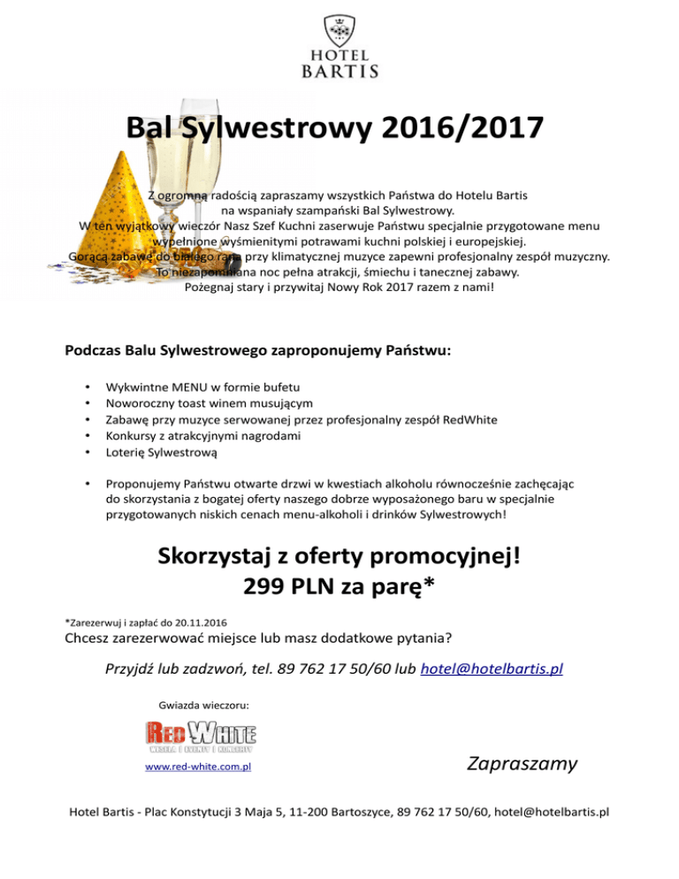 Bal Sylwestrowy 2016/2017 Z ogromną radością zapraszamy wszystkich Państwa do Hotelu Bartis na wspaniały szampański Bal Sylwestrowy. W ten wyjątkowy wieczór Nasz Szef Kuchni zaserwuje Państwu specjalnie przygotowane menu wypełnione wyśmienitymi potrawami kuchni polskiej i europejskiej. Gorącą zabawę do białego rana przy klimatycznej muzyce zapewni profesjonalny zespół muzyczny. To niezapomniana noc pełna atrakcji, śmiechu i tanecznej zabawy. Pożegnaj stary i przywitaj Nowy Rok 2017 razem z nami! Podczas Balu Sylwestrowego zaproponujemy Państwu: • • • • • Wykwintne MENU w formie bufetu Noworoczny toast winem musującym Zabawę przy muzyce serwowanej przez profesjonalny zespół RedWhite Konkursy z atrakcyjnymi nagrodami Loterię Sylwestrową • Proponujemy Państwu otwarte drzwi w kwestiach alkoholu równocześnie zachęcając do skorzystania z bogatej oferty naszego dobrze wyposażonego baru w specjalnie przygotowanych niskich cenach menu-alkoholi i drinków Sylwestrowych! Skorzystaj z oferty promocyjnej! 299 PLN za parę* *Zarezerwuj i zapłać do 20.11.2016 Chcesz zarezerwować miejsce lub masz dodatkowe pytania? Przyjdź lub zadzwoń, tel. 89 762 17 50/60 lub [email protected] Gwiazda wieczoru: www.red-white.com.pl Zapraszamy Hotel Bartis - Plac Konstytucji 3 Maja 5, 11-200 Bartoszyce, 89 762 17 50/60, [email protected]