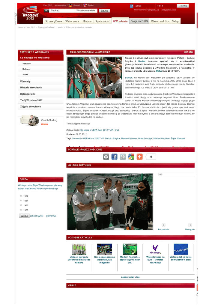 Euro 2012 Mapa serwisu Szukaj Deutsch English Email ●●●● Nie masz konta? Zarejestruj się W całym serwisie Przypomnij hasło Jesteś tu: euro 2012 › Artykuły o Wrocławiu › Miasto › Piłkarze z uczniami na stadionie Co nowego we Wrocławiu Trener Orest Lenczyk oraz zawodnicy mistrzów Polski – Dariusz Sztylka i Marian Kelemen spotkali się z wrocławskimi > Miasto gimnazjalistami i licealistami na nowym wrocławskim stadionie. Kultura Była też nauka dopingu z „Wielkim Śląskiem”, a wszystko w ram ach projektu „Co wiesz o UEFA Euro 2012 TM?”. Sport Stadion, na którym dziś wieczorem po zaleceniu UEFA zacznie się Wywiady kładzenie murawy (więcej o tym na naszym portalu jutro), drugi dzień z rzędu był miejscem akcji finału projektu edukacyjnego miasta Wrocław Historia Wrocławia zatytułowanego „Co wiesz o UEFA Euro 2012 TM?” Kalendarium Podczas drugiego dnia, poświęconego Śląskowi Wrocław gimnazjaliści i licealiści mieli okazję m.in. zobaczyć fragment filmu „Przełamywanie Twój Wroclove2012 barier” o Klubie Kibiców Niepełnosprawnych, zobaczyć występ grupy Cheerleaders Wrocław oraz nauczyć się dopingu prowadzonego przez stowarzyszenie „Wielki Śląsk”. Na koniec treningu dopingu Zdjęcia Wrocławia wspólnie z uczniami zaprezentowano olbrzymią flagę, tzw. sektorówkę. Po tym na stadionie pojawili się goście specjalni trener mistrzów Polski, Śląska Wrocław - Orest Lenczyk oraz zawodnicy - Dariusz Sztylka i Marian Kelemen. Wieloletni kapitan WKS-u nie chciał zdradzić jak długo piłkarze wspólnie bawili się po wczorajszej fecie na Rynku, a trener Lenczyk zachęcał młodych kibiców, by jak najczęściej przychodzili na stadion. Couch Surfing Zobacz Tekst i zdjęcia: Redakcja Zobacz także: Co wiesz o UEFA Euro 2012 TM? - finał Dodano: 09.05.2012 Tagi: Co wiesz o UEFA Euro 2012TM?, Dariusz Sztylka, Marian Kelemen, Orest Lenczyk, Stadion Wrocław, Śląsk Wrocław Reklam y Google Euro 2012 PC Euro 2012 Euro 2012 Dates Śląsk Wrocław 2/10 W którym roku Śląsk Wrocław po raz pierwszy zdobył Mistrzostwo Polski w piłce nożnej? 1982 1984 1977 1975 zobacz wyniki skomentuj Poprzednie Zobacz, jak będą ubrani wolontariusze na Euro Koniec zgłoszeń na wolontariuszy miejskich Modern Football..., czyli o wyzwaniach piłki zobacz wszystkie Wolontariusze na Euro – wkrótce rekrutacja Następne Wolontariat na Euro od kwietnia w sieci