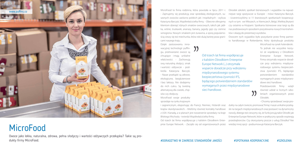 www.puffins.co MicroFood Owoce jako lekka, naturalna, zdrowa, pełna słodyczy i wartości odżywczych przekąska? Takie są produkty firmy MicroFood. MicroFood to firma rodzinna, która powstała w lipcu 2011 r. Ośrodek szkoleń, spotkań biznesowych i wyjazdów na najważ- Zajmujemy się produkcją oraz sprzedażą ekologicznych, su- niejsze targi spożywcze w Europie - mówi Katarzyna Barczyk. szonych owoców zarówno polskich jak i tropikalnych - wylicza - Uczestniczyliśmy w 11 branżowych spotkaniach kooperacyjKatarzyna Barczyk, Współwłaścicielka firmy. - Obecnie oferujemy nych w tym: we Włoszech, w Niemczech, Belgii, Wielkiej Brytanii klientom dziesięć różnych smaków owocowych, takich jak: jabł- czy ostatnio w Hiszpanii. Spotkania biznesowe oraz targi są dla ka, wiśnie, truskawki, ananasy, banany, jagody goji czy ciemne nas podstawowym sposobem pozyskiwania nowych kontrahenwinogrona. Nowym smakiem jest żurawina, a sporą popularno- tów i okazją do prezentacji wyrobów. ścią cieszy się też miechunka, która robi dużą karierę poza grani- Owocem tych wyjazdów było pozyskanie przez firmę partnecami naszego kraju. ra handlowego w Rotterdamie, który dystrybuuje produkty Dzięki zastosowaniu innoMicroFood na rynek holenderski. wacyjnej technologii puffinTo jednak nie wszystkie korzygu, przetwarzane owoce są ści ze współpracy z Ośrodkiem Od trzech lat firma współpracuje chrupiące i mają unikalne Enterprise Europe Network. właściwości. - Zachowują Firma otrzymała wsparcie doradz kaliskim Ośrodkiem Enterprise swą naturalną słodycz, smak cze przy wdrożeniu międzynaEurope Network (...) otrzymała i wartości odżywcze - podrodowego systemu bezpieczeńwsparcie doradcze przy wdrożeniu kreśla Katarzyna Barczyk. stwa żywności IFS, będącego międzynarodowego systemu - Nasze przekąski są zdrowe, potwierdzeniem standardów bezpieczeństwa żywności IFS, ekologiczne, bezglutenowe wymaganych przez międzynarobędącego potwierdzeniem standardów i bez laktozy. Nie dodajemy dowe sieci handlowe. wymaganych przez międzynarodowe do nich cukru. Są świetną Przedstawiciele firmy wzięli sieci handlowe. alternatywą dla ciastek, chiprównież udział w licznych szkosów czy słodyczy. leniach organizowanych przez MicroFood swoje produkty Ośrodek. sprzedaje na rynku krajowym - Chcemy sprzedawać swoje proi zagranicznym, eksportując do Francji, Niemiec, Holandii oraz dukty na całym świecie, promować firmę i nasze unikalne przekąkrajów skandynawskich. - Mieliśmy również kontakty handlowe ski na targach międzynarodowych oraz postawić na dynamiczny z USA i Kanadą, a w planach jest rozszerzenie sprzedaży na kraje rozwój, dlatego też cieszymy się, że funkcjonują takie Ośrodki jak Bliskiego Wschodu - twierdzi Współwłaścicielka firmy. Enterprise Europe Network, które w praktyczny sposób wspierają Od trzech lat firma współpracuje z kaliskim Ośrodkiem Enter- przedsiębiorców. Czy skorzystamy jeszcze z usług Ośrodka? Nie prise Europe Network. - Zaczęło się od organizowanych przez wiedzę innej opcji - podsumowuje Katarzyna Barczyk. #DORADZTWO W ZAKRESIE STANDARDÓW JAKOŚCI #SPOTKANIA KOOPERACYJNE #SZKOLENIA