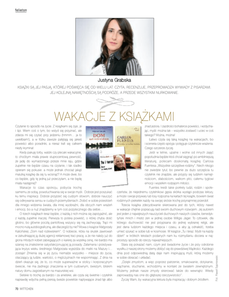 felieton Justyna Grabska KSIĄŻKI SĄ JEJ PASJĄ, KTÓREJ POŚWIĘCA SIĘ OD WIELU LAT. CZYTA, RECENZUJE, PRZEPROWADZA WYWIADY Z PISARZAMI. JEJ KOLEJNĄ NAMIĘTNOŚCIĄ SĄ PODRÓŻE, A PRZEDE WSZYSTKIM NURKOWANIE. Czytanie to sposób na życie. Z książkami się żyje, je i śpi. Wiem coś o tym, bo wstyd się przyznać, ale zdarza mi się czytać przy jedzeniu (hmmm… ja to uwielbiam!), a w łóżku zawsze pałętają się jakieś powieści albo poradniki, a nieraz trafi się całkiem niezły kryminał. Kiedy pakuję torby, walizki czy plecaki wakacyjnie, to choćbym miała prawie stuprocentową pewność, że jadę do wymarzonego przeze mnie raju, gdzie zupełnie nie będzie czasu na czytanie, i tak rzadko opieram się pokusie: a może jednak chociaż jakąś malutką książkę da się tu wcisnąć? A może dwie, bo co będzie, gdy tę jedną już przeczytam, a nie będę miała następnej? Wakacje to czas spokoju, pobycia trochę samemu ze sobą, powsłuchiwania się w swoje myśli. Dobrze jest poszukać ku temu inspiracji. Dobrze przyjrzeć się cudzym słowom, dobrze nauczyć się odkrywania sensu w cudzych przemyśleniach. Zrobić w sobie przestrzeń dla innego widzenia świata, dla innej wyobraźni, dla obcych nam wrażeń i emocji, bo a nuż znajdziemy w tym coś pożytecznego dla siebie… O trzech książkach teraz będzie, z każdą z nich można się zaprzyjaźnić, ale z każdą zupełnie inaczej. Pierwsza to polska powieść, o której chyba dość głośno, bo głównie pocztą pantoflową wszyscy się nią zachwycają. Trąci mi mocno nutą autobiograficzną, ale dlaczegóż by nie? Mowa o książce Małgorzaty Kalicińskiej „Dom nad rozlewiskiem”. O kobiecie, która na skutek zawirowań w zatrudniającej ją dużej agencji reklamowej traci pracę, a że nie należy już do grona młodych kobiet zabiegających o karierę za wszelką cenę, nie bardzo ma szansę na znalezienie satysfakcjonującej ją posady. Załamana i przeżywająca kryzys wieku średniego Małgorzata wyjeżdża do matki na Mazury i… zostaje! Zmienia się w jej życiu niemalże wszystko – miejsce do życia, otaczający ją ludzie, wartości, o mężczyznach nie wspominając. Z dnia na dzień okazuje się, że to, co może superważne w stolicy i korporacyjnym świecie, nie ma żadnego znaczenia w tym cudownym, świeżym, bliskim natury domu zagrzebanym na mazurskiej wsi. Sielskie to trochę za bardzo i za anielskie, ale czyta się świetnie i czytelnik naprawdę wdycha pełną piersią świeże powietrze napływające znad łąk albo 70 WITTCHEN znad jeziora. I zazdrości bohaterce powieści, i wzdychając, myśli: można tak – wszystko zostawić i uciec w coś takiego? Można, można! Łatwo czyta się taką książkę na wakacjach, bo i sceneria często sprzyja i potęguje czytelnicze wrażenia. Czego szczerze życzę. Jeśli w letnie, upalne i wolne od innych zajęć popołudnia będzie ktoś chciał sięgnąć po ambitniejszą literaturę, polecam doskonałą książkę Carlosa Fuentesa „Wszystkie szczęśliwe rodziny”. Niech nikogo nie zwiedzie tytuł, bo pewnie za dużo szczęścia tu czytelnik nie znajdzie, ale przyjrzy się ludzkim namiętnościom, słabościom, walkom płci, całemu tyglowi emocji i wszelkim rodzajom miłości. Fuentes kreśli takie portrety ludzi, rodzin i społeczeństw, że niejednemu czytelnikowi gęsia skórka wystąpi podczas lektury, a może i swoje przywary lub losy rozpozna na kartach tej książki, bowiem świat rodzinnych piekiełek każdy na swojej skórze trochę przynajmniej przerobił. Trzecia książka zdecydowanie skierowana jest do tych, którzy nawet w wakacje chętnie popracują nad swoim duchowym rozwojem. Jej autorem jest jeden z największych nauczycieli duchowych naszych czasów, benedyktyński mnich i mistrz zen w jednej osobie Willigis Jäger. To człowiek, dla którego duchowość nie jest przypisana do jednej wybranej religii, ale jest dana ludziom każdego miejsca i czasu, a aby ją odnaleźć, trzeba umieć szukać w sobie lub w kosmosie. W książce „Tu i teraz. Myśli na każdy dzień” w krótkich tekstach podanych nam ku rozmyślaniu dociera w najprostszy sposób do rzeczy najważniejszych. Stara się pokazać nam, czym jest świadome życie i że przy odrobinie wysiłku z naszej strony możemy zbliżyć się do prawdziwej Mądrości. Każdego dnia pod odpowiednią datą daje nam inspirującą myśl, którą możemy w sobie obracać i układać. „Dzięki zmysłom, a więc poprzez patrzenie, smakowanie, dotykanie, wąchanie, słuchanie, wchodzimy w kontakt ze światem zewnętrznym. Możemy jednak nasze zmysły skierować także do wewnątrz. Wtedy zaprowadzą nas one do głębszej rzeczywistości”. Życzę Wam, by wakacyjna lektura była inspiracją i dobrym źródłem. Fot. Paweł Sypniewski WAKACJE Z KSIĄŻKAMI