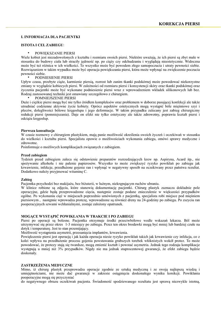 KOREKCJA PIERSI ! ! ! I. INFORMACJA DLA PACJENTKI ISTOTA I CEL ZABIEGU: • POWIĘKSZANIE PIERSI Wiele kobiet jest niezadowolonych z kształtu i rozmiaru swoich piersi. Niektóre uważają, że ich piersi są zbyt małe w stosunku do budowy ciała lub straciły jędrność np. po ciąży czy odchudzaniu i wyglądają nieestetycznie. Widoczna może być też różnica w ich wielkości. To wszystko może być powodem złego samopoczucia i utraty pewności siebie. Rozwiązaniem w takim wypadku może być operacja powiększania piersi, która może wpłynąć na zwiększenie poczucia pewności siebie. • PODNIESIENIE PIERSI Upływ czasu, przebyte ciąże, karmienie piersią, rozrost lub zanim tkanki podskórnej może powodować niekorzystne zmiany w wyglądzie kobiecych piersi. W zależności od rozmiaru piersi i konsystencji skóry oraz tkanki podskórnej oraz życzenia pacjentki może być wykonane podniesienie piersi wraz z wprowadzeniem wkładek silikonowych lub bez. Rodzaj zastosowanej techniki jest omawiany szczegółowo z chirurgiem. • POMNIEJSZENIE PIERSI Duże i ciężkie piersi mogą być nie tylko źródłem kompleksów oraz problemem w doborze pasującej konfekcji ale także utrudniać codzienne aktywne życie kobiety. Oprócz aspektów estetycznych mogą wystąpić bóle mięśniowe szyi i pleców, dolegliwości bólowe kręgosłupa i jego deformacje. W takim przypadku zalecany jest zabieg chirurgiczny redukcji piersi (pomniejszania). Daje on efekt nie tylko estetyczny ale także zdrowotny, poprawia kształt piersi i odciąża kręgosłup. ! ! Pierwsza konsultacja W czasie rozmowy z chirurgiem plastykiem, mają panie możliwość określenia swoich życzeń i oczekiwań w stosunku do wielkości i kształtu piersi. Specjalista opowie o możliwościach wykonania zabiegu, omówi sprawy medyczne i zdrowotne. Poinformuje o możliwych komplikacjach związanych z zabiegiem. ! Przed zabiegiem Tydzień przed zabiegiem zaleca się odstawienie preparatów rozrzedzających krew np. Aspiryna, Acard itp., nie spożywanie alkoholu i nie palenie papierosów. Wszystko to może zwiększyć ryzyko powikłań po zabiegu jak krwawienie, infekcje, przedłużone gojenie ran i wpłynąć w negatywny sposób na oczekiwany przez państwa rezultat. Dodatkowo należy przyjmować witaminę C. ! Zabieg Pacjentka przychodzi bez makijażu, bez biżuterii, w luźnym, niekrępującym ruchów ubraniu. W klinice robione są zdjęcia, które stanowią dokumentację pacjentki. Chirurg plastyk zaznacza dokładnie pole operacyjne, gdzie będą przeprowadzone cięcia, następnie zostaje podane znieczulenie w większości przypadków ogólne. Po wykonaniu cięć w miejscach poprzednio umówionych z pacjentką, specjalista robi miejsce pod mięśniem piersiowym , następnie wprowadza protezę, wprowadzone są również dreny na 24-godziny po zabiegu. Po zszyciu ran pooperacyjnych szwami wchłanialnymi, zostaje założony opatrunek. !! MOGĄCE WYSTĄPIĆ POWIKŁANIA W TRAKCIE I PO ZABIEGU Piersi po operacji są bolesne. Pacjentka otrzymuje środki przeciwbólowe wedle wskazań lekarza. Ból może utrzymywać się przez okres 1-3 miesięcy po zabiegu. Przez ten okres brodawki mogą być mniej lub bardziej czułe na dotyk i temperaturę. Jest to stan przemijający. Możliwość wystąpienia asymetrii, przesunięcia implantów, krwawienia. Powiększenie piersi jest operacją i jak każda operacja niesie ryzyko powikłań takich jak krwawienie czy infekcja, co z kolei wpływa na przedłużenie procesu gojenia powstawania grubszych torebek włóknistych wokół protez. To może powodować, że protezy stają się twardsze, mogą zmienić kształt i powstać asymetria. Jednak tego rodzaju komplikacje występują u mniej niż 3% przypadków. Nigdy nie ma jednak stuprocentowej gwarancji, że efekt zabiegu będzie doskonały. !! ZASTRZEŻENIA MEDYCZNE Mimo, iż chirurg plastyk przeprowadza operacje zgodnie ze sztuką medyczną i ze swoją najlepszą wiedzą i umiejętnościami, nie może dać gwarancji w zakresie osiągnięcia doskonałego wyniku korekcji. Powikłania pooperacyjne mogą się przyczyniać do negatywnego obrazu oczekiwań pacjenta. Świadomość spodziewanego rezultatu jest sprawą niezwykle istotną, dlatego tak ważna jest wcześniejsza konsultacja ze specjalistą, podczas której zostaną omówione wszelkie wady, zalety i oczekiwania przewidzianej korekcji. !! !! ! ZALECENIA PO ZABIEGU: ! Można swobodnie się poruszać i wykonywać podstawowe czynności domowe jednak nie nadwyrężając sił. Na 3 dzień po zabiegu można zdjąć bandaż, umyć się mydłem w płynie pod prysznicem. Plasterki na ranach pooperacyjnych w razie mocnego zamoczenia należy dobrze wysuszyć np. suszarką do włosów. Nie wolno zdejmować plasterków pooperacyjnych. Celem stabilizacji wkładek i utrzymania ich w odpowiednim miejscu do momentu wygojenia się piersi należy nosić zakupiony wcześniej biustonosz sportowy /bez usztywnień/. Należy zwrócić uwagę aby biustonosz był równo założony i nie był za ciasny, gdyż może to spowodować przemieszczenie się wkładek. Powinno chodzić się w biustonoszu 2 tygodnie bez przerwy (dzień i noc). Przez następne 2 tygodnie należy nosić biustonosz w dzień, a na noc można zakładać opaskę nad biust tak by przyciskać go do dołu. O konieczności zakładania opaski decyduje chirurg plastyk. Przez okres 7-10 dni zaleca się spanie na plecach aby uniknąć przemieszczania się wkładek lub innych komplikacji. W razie wystąpienia po operacji znacznej asymetrii spowodowanej np. obrzękiem lub krwawieniem jednej lub obu piersi lub też gorączki należy bezwzględnie skontaktować się z kliniką w celu uzyskania dalszych wskazówek. Po 7-9 dniach należy przyjść do kliniki na kontrolę i usunięcie szwów oraz po dalsze instrukcje postępowania po zabiegu. Istotne jest, aby po zabiegu ograniczyć wysiłek fizyczny na okres 3-4 tygodni w tym sprzątanie, podnoszenie ciężkich