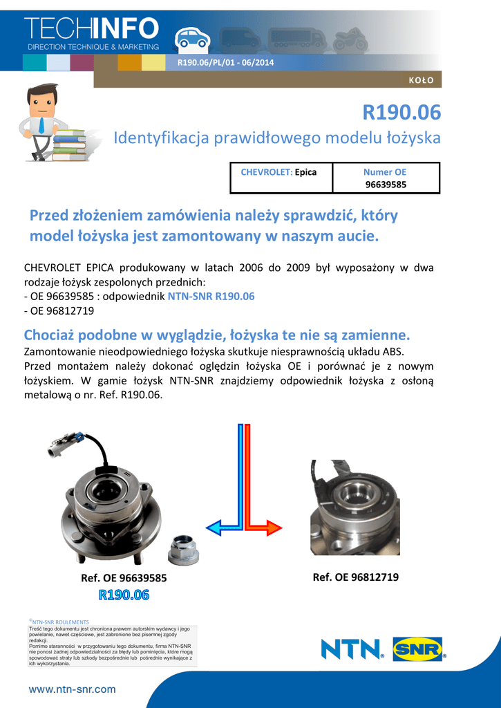 R190.06/PL/01 - 06/2014 KOŁO R190.06 Identyfikacja prawidłowego modelu łożyska CHEVROLET: Epica Numer OE 96639585 Przed złożeniem zamówienia należy sprawdzić, który model łożyska jest zamontowany w naszym aucie. CHEVROLET EPICA produkowany w latach 2006 do 2009 był wyposażony w dwa rodzaje łożysk zespolonych przednich: - OE 96639585 : odpowiednik NTN-SNR R190.06 - OE 96812719 Chociaż podobne w wyglądzie, łożyska te nie są zamienne. Zamontowanie nieodpowiedniego łożyska skutkuje niesprawnością układu ABS. Przed montażem należy dokonać oględzin łożyska OE i porównać je z nowym łożyskiem. W gamie łożysk NTN-SNR znajdziemy odpowiednik łożyska z osłoną metalową o nr. Ref. R190.06. Ref. OE 96639585 © NTN-SNR ROULEMENTS Treść tego dokumentu jest chroniona prawem autorskim wydawcy i jego powielanie, nawet częściowe, jest zabronione bez pisemnej zgody redakcji. Pomimo staranności w przygotowaniu tego dokumentu, firma NTN-SNR nie ponosi żadnej odpowiedzialności za błędy lub pominięcia, które mogą spowodować straty lub szkody bezpośrednie lub pośrednie wynikające z ich wykorzystania. Ref. OE 96812719