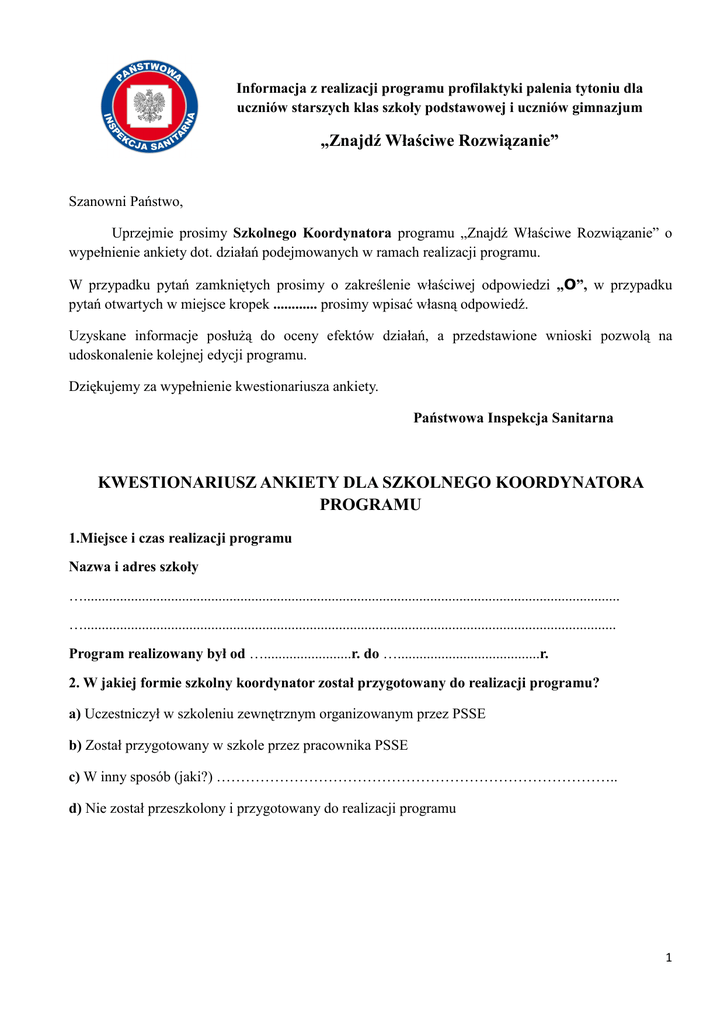 Informacja z realizacji programu profilaktyki palenia tytoniu dla uczniów starszych klas szkoły podstawowej i uczniów gimnazjum „Znajdź Właściwe Rozwiązanie” Szanowni Państwo, Uprzejmie prosimy Szkolnego Koordynatora programu „Znajdź Właściwe Rozwiązanie” o wypełnienie ankiety dot. działań podejmowanych w ramach realizacji programu. W przypadku pytań zamkniętych prosimy o zakreślenie właściwej odpowiedzi „O”, w przypadku pytań otwartych w miejsce kropek ............ prosimy wpisać własną odpowiedź. Uzyskane informacje posłużą do oceny efektów działań, a przedstawione wnioski pozwolą na udoskonalenie kolejnej edycji programu. Dziękujemy za wypełnienie kwestionariusza ankiety. Państwowa Inspekcja Sanitarna KWESTIONARIUSZ ANKIETY DLA SZKOLNEGO KOORDYNATORA PROGRAMU 1.Miejsce i czas realizacji programu Nazwa i adres szkoły …................................................................................................................................................... ….................................................................................................................................................. Program realizowany był od …........................r. do ….......................................r. 2. W jakiej formie szkolny koordynator został przygotowany do realizacji programu? a) Uczestniczył w szkoleniu zewnętrznym organizowanym przez PSSE b) Został przygotowany w szkole przez pracownika PSSE c) W inny sposób (jaki?) ……………………………………………………………………….. d) Nie został przeszkolony i przygotowany do realizacji programu 1 3. W jaki sposób szkolny koordynator poinformował realizatorów programu o założeniach i sposobie jego realizacji? a) Przekazał informacje na Radzie Pedagogicznej b) Przekazał informację indywidualnie zainteresowanym nauczycielom c) W inny sposób(jaki?)................................................................................................................ d) Poinformował i zaprosił do współpracy pielęgniarkę szkolną e) Nie poinformował realizatorów 4. Czy do pomocy w prowadzeniu zajęć programowych zaangażowani zostali liderzy młodzieżowi? a) Tak b) Nie 5. Czy rodzice wyrazili zgodę na realizację programu? a) Tak b) Nie (dlaczego?)……………………………………………………………………………… 6.Czy rodzice brali udział w działaniach realizowanych w ramach programu? a) Tak (jakich?)............................................................................................................................. …................................................................................................................................................... b) Nie 7. Liczba rodziców biorących udział w programie.................................................................. 8. Liczba uczniów uczestniczących w programie ogółem: …...................... w tym, w klasach: (wymienić klasy i liczbę uczniów) ...................................... ...................................... ..................................... .................................... 9. W jaki sposób przebiegała realizacja programu? a) Program został zrealizowany w formie zaproponowanych 5 zajęć warsztatowych b) Program nie został zrealizowany w całości 10. Czy metodyka zajęć została zmieniona? a) Tak b) Nie (proszę przejść do pytania 12) 2 11. Które z zajęć zostały zmienione (z jakiego powodu, w jakim zakresie)? a) Zajęcia 1.................................................................................................................................... …............................................................................................................................................................... b) Zajęcia 2................................................................................................................................... …............................................................................................................................................................... c) Zajęcia 3 ................................................................................................................................... …............................................................................................................................................................... d) Zajęcia 4................................................................................................................................... …............................................................................................................................................................... e) Zajęcia 5.................................................................................................................................... …............................................................................................................................................................... 12. Czy program był rozszerzony o dodatkowe działania? a) Tak (jakie?)............................................................................................................................... …................................................................................................................................................... b) Nie 13. Czy uzyskano pomoc lokalnych partnerów, sojuszników, darczyńców na rzecz realizacji działań? a) Tak (jaką?)............................................................................................................................... …................................................................................................................................................... b) Nie 14. Ocena programu (skala: 1 – ocena najniższa 6 – ocena najwyższa) a) Odbiór programu przez uczniów 1 2 3 4 5 6 b) O