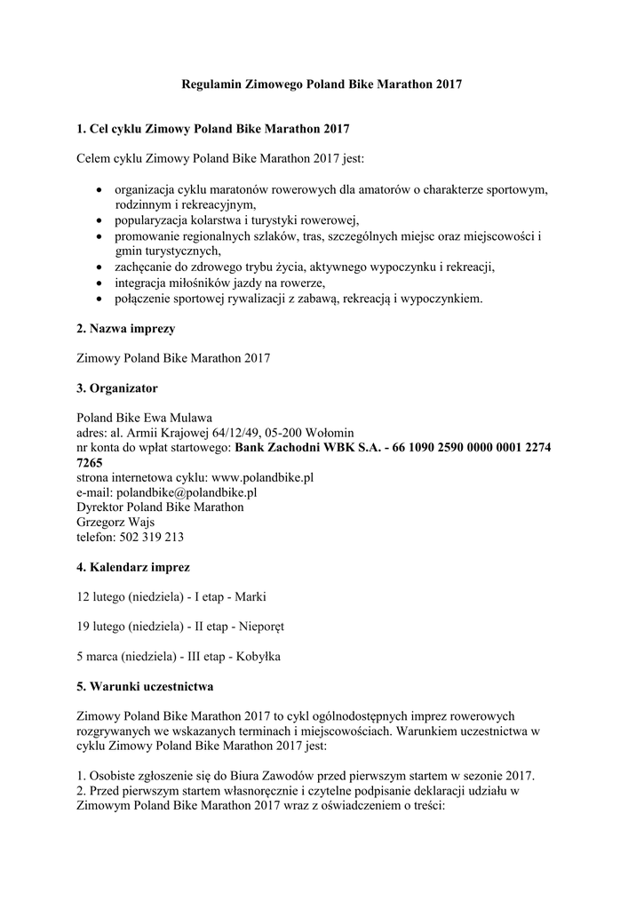 Regulamin Zimowego Poland Bike Marathon 2017 1. Cel cyklu Zimowy Poland Bike Marathon 2017 Celem cyklu Zimowy Poland Bike Marathon 2017 jest: organizacja cyklu maratonów rowerowych dla amatorów o charakterze sportowym, rodzinnym i rekreacyjnym, popularyzacja kolarstwa i turystyki rowerowej, promowanie regionalnych szlaków, tras, szczególnych miejsc oraz miejscowości i gmin turystycznych, zachęcanie do zdrowego trybu życia, aktywnego wypoczynku i rekreacji, integracja miłośników jazdy na rowerze, połączenie sportowej rywalizacji z zabawą, rekreacją i wypoczynkiem. 2. Nazwa imprezy Zimowy Poland Bike Marathon 2017 3. Organizator Poland Bike Ewa Mulawa adres: al. Armii Krajowej 64/12/49, 05-200 Wołomin nr konta do wpłat startowego: Bank Zachodni WBK S.A. - 66 1090 2590 0000 0001 2274 7265 strona internetowa cyklu: www.polandbike.pl e-mail: [email protected] Dyrektor Poland Bike Marathon Grzegorz Wajs telefon: 502 319 213 4. Kalendarz imprez 12 lutego (niedziela) - I etap - Marki 19 lutego (niedziela) - II etap - Nieporęt 5 marca (niedziela) - III etap - Kobyłka 5. Warunki uczestnictwa Zimowy Poland Bike Marathon 2017 to cykl ogólnodostępnych imprez rowerowych rozgrywanych we wskazanych terminach i miejscowościach. Warunkiem uczestnictwa w cyklu Zimowy Poland Bike Marathon 2017 jest: 1. Osobiste zgłoszenie się do Biura Zawodów przed pierwszym startem w sezonie 2017. 2. Przed pierwszym startem własnoręcznie i czytelne podpisanie deklaracji udziału w Zimowym Poland Bike Marathon 2017 wraz z oświadczeniem o treści: „Znane mi są reguły i zasady uprawiania kolarstwa i zobowiązuję się do ich przestrzegania w trakcie trwania zawodów. Znane mi jest ryzyko związane z udziałem w zawodach, jestem świadomy szkód (w tym polegających na naruszeniu nietykalności cielesnej, uszkodzeniu ciała lub rozstroju zdrowia) jakie mogą powstać w czasie i w związku z rywalizacją sportową i podejmuję ją w sposób świadomy i dobrowolny. Biorąc udział w zawodach na własne ryzyko przyjmuję jednocześnie do wiadomości i oświadczam, iż ponoszę wyłączną odpowiedzialność za wszelkie szkody mogące powstać wskutek mojego uczestnictwa w zawodach, w szczególności w przypadku naruszenia przeze mnie reguł sportowych. Przyjmuję do wiadomości, iż w razie wypadku, w szczególności spowodowanego przez innego uczestnika zawodów, nie przysługują mi jakiekolwiek roszczenia w stosunku do organizatora zawodów. Przyjmuję do wiadomości, iż odpowiedzialność organizatora zawodów jest określona przepisami prawa, a jej zakres nie jest rozszerzony umownie w żaden sposób, dorozumiany lub bezpośredni. Oświadczam również, iż mój stan zdrowia pozwala mi na wzięcie udziału w zawodach. Przyjmuję do wiadomości, że należy przestrzegać zarządzeń służb porządkowych oraz warunków regulaminu. Zapoznałem się z trasą i zgadzam się z warunkami uczestnictwa i zgłaszam swoje uczestnictwo w zawodach pod nazwą Zimowy Poland Bike Marathon 2017. W przypadku startu młodzieży poniżej 18 lat wymagana jest zgoda rodzica lub opiekuna prawnego, poprzez złożenie podpisu. Zdjęcia, nagrania filmowe oraz wywiady z moją osobą, a także wyniki z moimi danymi osobowymi mogą być wykorzystane przez prasę, radio i telewizję. Swoim podpisem zapewniam, że zapoznałem się z wszystkimi warunkami regulaminu zawodów i wypełniłem formularz zgłoszeniowy zgodnie z prawdą oraz kompletnie. Wyrażam zgodę na przetwarzanie moich danych osobowych przez Poland Bike Ewa Mulawa z siedzibą w Wołominie zgodnie z ustawą z dnia 29 sierpnia 1997 r. o ochronie danych osobowych dla potrzeb związanych z organizacją i przeprowadzeniem zawodów sportowych pod nazwą Zimowy Poland Bike Marathon 2017. Niniejsza deklaracja obowiązuje na wszystkich edycjach tegorocznego cyklu.” Deklarację udziału w cyklu Zimowy Poland Bike Marathon 2017 wypełnia się tylko jeden raz w sezonie. Deklaracja obowiązuje przez wszystkie edycje. 3. Dokonanie opłaty startowej w wysokości zgodnej z niniejszym regulaminem. Oryginał dowodu opłaty startowej należy zachować do wglądu w Biurze Zawodów podczas rejestracji. Potwierdzeniem udziału w poszczególnych edycjach cyklu Zimowy Poland Bike Marathon 2017 jest rejestracja, dokonanie opłaty wpisowego oraz start w danej edycji. Impreza ma charakter otwarty. Prawo udziału w zawodach mają osoby nie posiadające licencji PZKol jak również zawodnicy z licencjami PZKol. Zabrania się udziału w cyklu Zimowy Poland Bike Marathon 2017 zawodnikom odbywającym karę zawieszenia przez Polski Związek Kolarski i inne związki sportowe. Każdy uczestnik startuje na własną odpowiedzialność. Zawodnicy niepełnoletni dopuszczeni są do startu po złożeniu w Biurze Zawodów pisemnej zgody rodzica lub opiekuna prawnego na start w wyścigu. Zawodnicy w wieku poniżej 16 lat dopuszczeni są do startu wyłącznie w towarzystwie rodzica lub opiekuna prawnego, albo podczas jego pobytu w miasteczku sportowym w czasie wyścigu. Każdy uczestnik cyklu Zimowy Poland Bike Marathon 2017 jest zobowiązany do jazdy na sprawnym rowerze w kasku sztywnym. Rower powinien posiadać dzwonek, oświetlenie oraz odblaski. Start zawodnika w zawodach jest równoznaczny z wyrażeniem przez niego zgody na stosowanie się do zasad opisanych w niniejszym Regulaminie. Zawodnik powinien zanotować sobie i pamiętać nr alarmowy: 501 869 977. 6. Opłaty startowe Udział w zawodach z cyklu Zimowy Poland Bike Marathon 2017 jest płatny. Wysokość opłaty startowej uzależniona od dystansu na jakim startuje zawodnik i wynosi: 60 zł - opłata za start na dystansie Mini lub Max. W dniu startu opłaty w Biurze Zawodów przyjmowane są do godziny 11.30. 50 zł- opłata na dystansie Mini lub Max dla członków drużyn (obowiązuje przy minimum 10 osobach startujących na danym etapie z jednego zespołu). 30 zł - opłata Senior za start na dystansie Mini lub Max dla osób urodzonych w l