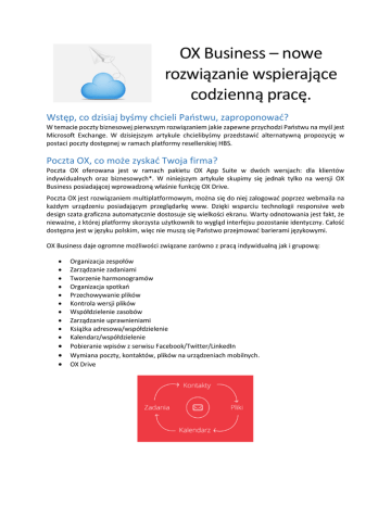 OX Business – nowe rozwiązanie wspierające codzienną pracę. Wstęp, co dzisiaj byśmy chcieli Państwu, zaproponować? W temacie poczty biznesowej pierwszym rozwiązaniem jakie zapewne przychodzi Państwu na myśl jest Microsoft Exchange. W dzisiejszym artykule chcielibyśmy przedstawić alternatywną propozycję w postaci poczty dostępnej w ramach platformy resellerskiej HBS. Poczta OX, co może zyskać Twoja firma? Poczta OX oferowana jest w ramach pakietu OX App Suite w dwóch wersjach: dla klientów indywidualnych oraz biznesowych*. W niniejszym artykule skupimy się jednak tylko na wersji OX Business posiadającej wprowadzoną właśnie funkcję OX Drive. Poczta OX jest rozwiązaniem multiplatformowym, można się do niej zalogować poprzez webmaila na każdym urządzeniu posiadającym przeglądarkę www. Dzięki wsparciu technologii responsive web design szata graficzna automatycznie dostosuje się wielkości ekranu. Warty odnotowania jest fakt, że nieważne, z której platformy skorzysta użytkownik to wygląd interfejsu pozostanie identyczny. Całość dostępna jest w języku polskim, więc nie muszą się Państwo przejmować barierami językowymi. OX Business daje ogromne możliwości związane zarówno z pracą indywidualną jak i grupową: Organizacja zespołów Zarządzanie zadaniami Tworzenie harmonogramów Organizacja spotkań Przechowywanie plików Kontrola wersji plików Współdzielenie zasobów Zarządzanie uprawnieniami Książka adresowa/współdzielenie Kalendarz/współdzielenie Pobieranie wpisów z serwisu Facebook/Twitter/LinkedIn Wymiana poczty, kontaktów, plików na urządzeniach mobilnych. OX Drive Więcej informacji o OX Drive znajdą Państwo w osobnym akapicie tego artykułu poświęconym w całości temu zagadnieniu. HBS, jako jeden z niewielu dostawców, oferuje Pocztę OX w wersji 7.0. Jest to najnowsza wersja dostępna na rynku. *W celu porównania obu wersji zachęcamy do zapoznania się z dokładną specyfikacją zawartą na naszej stronie: https://hbscloud.com/uslugi/poczta/poczta-e-mail OX Drive, czyli przestrzeń w chmurze Przejdziemy teraz do omówienia wspomnianej wcześniej funkcjonalności związanej z synchronizacją plików. OX Drive umożliwia przechowywanie i współdzielenie zdjęć, dokumentów, wideo i innych plików z dowolnego miejsca, w dowolnym czasie. OX Drive jest dostępny jako integralna część OX Business. Wymiana plików pomiędzy klientem a serwerem odbywa się przy pomocy przeglądarki www bądź dedykowanej aplikacji. Oprogramowanie OX Drive można zainstalować na szerokiej gamie systemów operacyjnych: Windows, OS X, iOS oraz Android. Instalacja i konfiguracja aplikacji została przygotowana w taki sposób, żeby nie nastręczać problemów nawet średnio zaawansowanym użytkownikom. Funkcjonalność: Automatyczna synchronizacja – dodajesz pliki w wybranym urządzeniu i widzisz je na innych. Możliwość dowolnej edycji synchronizowanych plików. Współdzielenie plików na Facebooku, Twitterze i innych portalach społecznościowych. Dostępność do historii zmian pliku. Dedykowana aplikacja na komputer, smartfon (rozwiązanie typu ‘drop box’) Aplikacja OX Drive dostępna w serwisie Google Play. Widok na główne okno interfejsu aplikacji w wersji na systemy Android. Interfejs dostępny przy logowaniu przez przeglądarkę