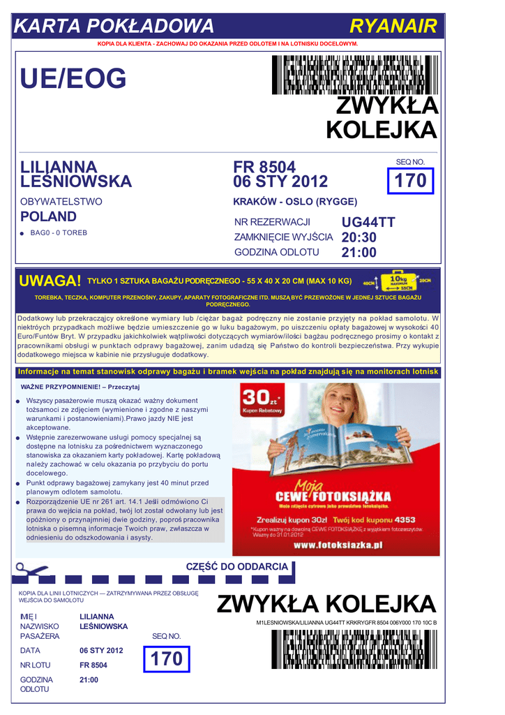 KARTA POKŁADOWA RYANAIR KOPIA DLA KLIENTA ZACHOWAJ DO OKAZANIA PRZED ODLOTEM I NA LOTNISKU DOCELOWYM. UE/EOG ZWYKŁA KOLEJKA SEQ NO. LILIANNA LEŚNIOWSKA FR 8504 06 STY 2012 OBYWATELSTWO KRAKÓW OSLO (RYGGE) POLAND NR REZERWACJI l BAG0 0 TOREB ZAMKNIĘCIE WYJŚCIA GODZINA ODLOTU UWAGA! 170 UG44TT 20:30 21:00 TYLKO 1 SZTUKA BAGAŻU PODRĘCZNEGO 55 X 40 X 20 CM (MAX 10 KG) TOREBKA, TECZKA, KOMPUTER PRZENOŚNY, ZAKUPY, APARATY FOTOGRAFICZNE ITD. MUSZĄ BYĆ PRZEWOŻONE W JEDNEJ SZTUCE BAGAŻU PODRĘCZNEGO. Dodatkowy lub przekracząjcy określone wymiary lub /ciężar bagaż podręczny nie zostanie przyjęty na pokład samolotu. W niektróych przypadkach możliwe będzie umieszczenie go w luku bagażowym, po uiszczeniu opłaty bagażowej w wysokości 40 Euro/Funtów Bryt. W przypadku jakichkolwiek wątpliwości dotyczących wymiarów/ilości bagżau podręcznego prosimy o kontakt z pracownikami obsługi w punktach odprawy bagażowej, zanim udadzą się Państwo do kontroli bezpieczeństwa. Przy wykupie dodatkowego miejsca w kabinie nie przysługuje dodatkowy. Informacje na temat stanowisk odprawy bagażu i bramek wejścia na pokład znajdują się na monitorach lotnisk WAŻNE PRZYPOMNIENIE! – Przeczytaj Wszyscy pasażerowie muszą okazać ważny dokument tożsamoci ze zdjęciem (wymienione i zgodne z naszymi warunkami i postanowieniami).Prawo jazdy NIE jest akceptowane. l Wstępnie zarezerwowane usługi pomocy specjalnej są dostępne na lotnisku za pośrednictwem wyznaczonego stanowiska za okazaniem karty pokładowej. Kartę pokładową należy zachować w celu okazania po przybyciu do portu docelowego. l Punkt odprawy bagażowej zamykany jest 40 minut przed planowym odlotem samolotu. l Rozporządzenie UE nr 261 art. 14.1 Jeśli odmówiono Ci prawa do wejścia na pokład, twój lot został odwołany lub jest opóźniony o przynajmniej dwie godziny, poproś pracownika lotniska o pisemną informacje Twoich praw, zwłaszcza w odniesieniu do odszkodowania i asysty. l CZĘŚĆ DO ODDARCIA KOPIA DLA LINII LOTNICZYCH — ZATRZYMYWANA PRZEZ OBSŁUGĘ WEJŚCIA DO SAMOLOTU IMIĘ I NAZWISKO PASAŻERA LILIANNA LEŚNIOWSKA DATA 06 STY 2012 NR LOTU FR 8504 GODZINA ODLOTU 21:00 ZWYKŁA KOLEJKA M1LESNIOWSKA/LILIANNA UG44TT KRKRYGFR 8504 006Y000 170 10C B SEQ NO. 170 KARTA POKŁADOWA RYANAIR KOPIA DLA KLIENTA ZACHOWAJ DO OKAZANIA PRZED ODLOTEM I NA LOTNISKU DOCELOWYM. UE/EOG ZWYKŁA KOLEJKA SEQ NO. LILIANNA LEŚNIOWSKA FR 8503 09 STY 2012 OBYWATELSTWO OSLO (RYGGE) KRAKÓW POLAND NR REZERWACJI l BAG0 0 TOREB ZAMKNIĘCIE WYJŚCIA GODZINA ODLOTU UWAGA! 10 UG44TT 18:00 18:30 TYLKO 1 SZTUKA BAGAŻU PODRĘCZNEGO 55 X 40 X 20 CM (MAX 10 KG) TOREBKA, TECZKA, KOMPUTER PRZENOŚNY, ZAKUPY, APARATY FOTOGRAFICZNE ITD. MUSZĄ BYĆ PRZEWOŻONE W JEDNEJ SZTUCE BAGAŻU PODRĘCZNEGO. Dodatkowy lub przekracząjcy określone wymiary lub /ciężar bagaż podręczny nie zostanie przyjęty na pokład samolotu. W niektróych przypadkach możliwe będzie umieszczenie go w luku bagażowym, po uiszczeniu opłaty bagażowej w wysokości 40 Euro/Funtów Bryt. W przypadku jakichkolwiek wątpliwości dotyczących wymiarów/ilości bagżau podręcznego prosimy o kontakt z pracownikami obsługi w punktach odprawy bagażowej, zanim udadzą się Państwo do kontroli bezpieczeństwa. Przy wykupie dodatkowego miejsca w kabinie nie przysługuje dodatkowy. Informacje na temat stanowisk odprawy bagażu i bramek wejścia na pokład znajdują się na monitorach lotnisk WAŻNE PRZYPOMNIENIE! – Przeczytaj Wszyscy pasażerowie muszą okazać ważny dokument tożsamoci ze zdjęciem (wymienione i zgodne z naszymi warunkami i postanowieniami).Prawo jazdy NIE jest akceptowane. l Wstępnie zarezerwowane usługi pomocy specjalnej są dostępne na lotnisku za pośrednictwem wyznaczonego stanowiska za okazaniem karty pokładowej. Kartę pokładową należy zachować w celu okazania po przybyciu do portu docelowego. l Punkt odprawy bagażowej zamykany jest 40 minut przed planowym odlotem samolotu. l Rozporządzenie UE nr 261 art. 14.1 Jeśli odmówiono Ci prawa do wejścia na pokład, twój lot został odwołany lub jest opóźniony o przynajmniej dwie godziny, poproś pracownika lotniska o pisemną informacje Twoich praw, zwłaszcza w odniesieniu do odszkodowania i asysty. l CZĘŚĆ DO ODDARCIA KOPIA DLA LINII LOTNICZYCH — ZATRZYMYWANA PRZEZ OBSŁUGĘ WEJŚCIA DO SAMOLOTU IMIĘ I NAZWISKO LILIANNA PASAŻERA LEŚNIOWSKA DATA 09 STY 2012 NR LOTU FR 8503 GODZINA ODLOTU 18:30 ZWYKŁA KOLEJKA M1LESNIOWSKA/LILIANNA UG44TT RYGKRKFR 8503 009Y000 10 10C B SEQ NO. 10 KARTA POKŁADOWA RYANAIR KOPIA DLA KLIENTA ZACHOWAJ DO OKAZANIA PRZED ODLOTEM I NA LOTNISKU DOCELOWYM. UE/EOG ZWYKŁA KOLEJKA SEQ NO. GRZEGORZ LEŚNIOWSKI FR 8504 06 STY 2012 OBYWATELSTWO KRAKÓW OSLO (RYGGE) POLAND NR REZERWACJI l BAG0 0 TOREB ZAMKNIĘCIE WYJŚCIA GODZINA ODLOTU UWAGA! 171 UG44TT 20:30 21:00 TYLKO 1 SZTUKA BAGAŻU PODRĘCZNEGO 55 X 40 X 20 CM (MAX 10 KG) TOREBKA, TECZKA, KOMPUTER PRZENOŚNY, ZAKUPY, APARATY FOTOGRAFICZNE ITD. MUSZĄ BYĆ PRZEWOŻONE W JEDNEJ SZTUCE BAGAŻU PODRĘCZNEGO. Dodatkowy lub przekracząjcy określone wymiary lub /ciężar bagaż podręczny nie zostanie przyjęty na pokład samolotu. W niektróych przypadkach możliwe będzie umieszczenie go w luku bagażowym, po uiszczeniu opłaty bagażowej w wysokości 40 Euro/Funtów Bryt. W przypadku jakichkolwiek wątpliwości dotyczących wymiarów/ilości bagżau podręcznego prosimy o kontakt z pracownikami obsługi w punktach odprawy bagażowej, zanim udadzą się Państwo do kontroli bezpieczeństwa. Przy wykupie dodatkowego miejsca w kabinie nie przysługuje dodatkowy. Informacje na temat stanowisk odprawy bagażu i bramek wejścia na pokład znajdują się na monitorach lotnisk WAŻNE PRZYPOMNIENIE! – Przeczytaj Wszyscy pasażerowie muszą okazać ważny dokument tożsamoci ze zdjęciem (wymienione i zgodne z naszymi warunkami i postanowieniami).Prawo jazdy NIE jest akceptowane. l Wstępnie zarezerwowane us