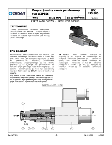 Proporcjonalny zawór przelewowy typ WZPSE6 WK 495 880 WN6 do 60 dm3/min do 35 MPa KARTA KATALOGOWA - INSTRUKCJA OBSŁUGI 10.2015 ZASTOSOWANIE Zawory przelewowe sterowane elektrycznie, proporcjonalnie typ WZPSE6… służą do regulacji ciśnienia w układzie hydraulicznym. Regulowane ciśnienie w układzie hydraulicznym jest funkcją prądu zadającego. OPIS DZIAŁANIA Proporcjonalny zawór przelewowy typ WZPSE6... jest zaworem pośredniego działania. Ciśnienie z kanału 1 (P) przez układ dysz (7) i (8) i dyszę regulacyjną (2) działa na przysłonę (3) połączoną popychaczem elektromagnesu proporcjonalnego (1). Siła docisku przysłony (3) do dyszy (2) jest proporcjonalna do natężenia prądu płynącego przez elektromagnes (1). Do zasilania elektromagnesu (1) może być zastosowany regulator elektroniczny typ 20RE10E wg karty katalogowej UWAGA: Aby zawór działał poprawnie należy go dokładnie odpowietrzyć za pomocą wkręta odpowietrzającego (9). W przypadku wystąpienia drgań należy wyregulować prąd podkładu na regulatorze elektromagnesu. Jeżeli ciśnienie działające na WK 420 820. przysłonę (3) jest większe od nastawionego to następuje odsunięcie przysłony (3) i ciśnienie w górnej części tłoczka (5) spada. Powoduje to przesunięcie tłoczka (5) w tulei (4) i otwarcie przepływu z kanału 1 (P) do 2 (T). Sprężyna (6) utrzymuje tłoczek (5) w położeniu zamknięcia przepływu. WZPSE6 - 02/100 - 24 Z4 7 1 (P) 2 (T) 4 Typ WZPSE6 5 6 8 2 3 1 -1- 9 WK 495 880 10.2015 DANE TECHNICZNE Rodzaj cieczy hydraulicznej Wymagana klasa czystości oleju Lepkość nominalna cieczy hydraulicznej Zakres lepkości cieczy hydraulicznej Zakres temperatury cieczy (w zbiorniku) Zakres temperatury otoczenia Max ciśnienie pracy Przepływ nominalny Pozycja pracy Histereza Powtarzalność nastawianego ciśnienia Napiecie zasilania Prąd sterujący I max Oporność cewki elektromagnesu ( 20oC ) Regulator elektroniczny olej mineralny ISO 4406; klasa 20/18/15 o 37 mm 2 /s w temperaturze 55 C 2,8 do 328 mm2 /s zalecany 40 oC do 55 oC max -20 oC do +70 oC - 20 oC do +50 oC 35 MPa kanał P kanał T 21 MPa 60 dm 3 /min dowolna (zalecana pozioma) 2,5 % max ciśnienia 2% 12V 24V 1,35 A 0,68 A 6Ω 24,2 Ω typ 20RE10 E wg karty katalogowej WK 420 820 (przy zasilaniu napięciem stabilizowanym 12 do 24V DC ustawić wartość maksymalną prądu I max, w zależności od wybranej wersji napięcia zasilania) napięcie sterowania 0 - 5V napięcie sterowania 0 - 10 V typ 20RE10 D wg karty katalogowej WK 420 810 (tylko dla napięcia zasilania 24V należy ustawić wartość maksymalną prądu I max = 0,68 A) SCHEMATY Symbol graficzny zaworu typ WZPSE6... 1 2 WYMAGANIA MONTAŻU I EKSPLOATACJI 1. Zawór należy użytkować tylko w pełni sprawny i prawidłowo przyłączony do instalacji elektrycznej. Przyłączanie lub odłączanie od instalacji elektrycznej musi być wykonywane przez wykwalifikowany personel. 2. Wtyczka elektromagnesu powinna przylegać dokładnie do gniazda i należy ją zabezpieczyć poprzez dokręcenie wkręta mocującego do oporu. Zabrania się eksploatacji zaworu, jeżeli wtyczka nie jest zabezpieczona i nie jest zapewniona szczelność i odpowiedni zacisk kabla w dławnicy wtyczki. 3. Podczas eksploatacji należy utrzymać zalecaną w niniejszej Karcie Katalogowej - Instrukcji Obsługi lepkość cieczy hydraulicznej. 4. Aby zapewnić bezawaryjną i bezpieczną pracę zaworu należy systematycznie sprawdzać: • stan połączenia elektrycznego WK 495 880 10.2015 • działanie zaworu • czystość cieczy hydraulicznej 5. Ze względu na nagrzewanie się cewki elektromagnesu i korpusu zaworu do wysokiej temperatury zawór powinien być umiejscowiony tak, aby wyeliminować możliwość przypadkowego kontaktu z cewką lub korpusem podczas eksploatacji lub należy przewidzieć odpowiednie osłony zgodnie z wymaganiami norm europejskich: PN - EN ISO 13732 -1 i PN - EN ISO 4413. 6. Dla zapewnienia szczelności przyłącza zaworu do układu hydraulicznego należy przestrzegać wymiarów pierścieni uszczelniających, momentów dokręcenia i parametrów pracy zaworu podanych w niniejszej Karcie Katalogowej - Instrukcji Obsługi. 7. Obsługujący zawór musi być zapoznany z treścią niniejszej Karty Katalogowej - Instrukcji Obsługi. -2- Typ WZPSE6 CHARAKTERYSTYKI (dla lepkości cieczy hydraulicznej ν = 41 mm2/s i temperatury t = 50 oC) ciśnienie robocze p w zależności od natężenia prądu I natężenieprzepływu Q = 10 dm3/min 40 35 p [MPa] 30 25 20 15 10 5 0 0,1 0,2 0,2 0,3 0,4 0,4 0,6 0,8 I [mA] 0,5 1,0 0,6 1,2 0,68 1,35 p [MPa] ciśnienie robocze p w zależności od natężenia przepływu Q natężenie prądu I = Imax 45 40 35 30 25 20 15 10 5 0 10 20 30 Q 40 60 50 [dm3/min] minimalne ustawiane ciśnienie p w zależności od natężenia przepływu Q; natężenie prądu I = Imin 2,0 p [MPa] 1,5 1,0 0,5 0 Typ WZPSE6 10 20 40 30 Q [dm3/min] 50 60 -3- WK 495 880 10.2015 WYMIARY GABARYTOWE I PRZYŁĄCZENIOWE 15 wersja WZPSE6...Z4... (z wtyczką typ ISO 4400 (DIN 43650 - A) bez LED) moment dokręcenia 50-55 Nm 1 SW 24 19 M22 x 1,5 35 O O 27 56 2 108 137 1 - Pierścień uszczelniający o-ring 18 x 2,65 2 - Pierścień uszczelniający o-ring 15,6 x 1,78 wersja WZPSE6...EZ4... (z regulatorem typ 20 RE10 E) 96 15 moment dokręcenia 50-55 Nm SW 24 19 M22 x 1,5 1 35 O O 27 2 108 137 175 1 - Pierścień uszczelniający o-ring 18 x 2,65 2 - Pierścień uszczelniający o-ring 15,6 x 1,78 Typ WZPSE6 -4- WK 495 880 10.2015 WYMIARY GABARYTOWE I PRZYŁĄCZENIOWE gniazdo przyłączeniowe M-06-2 (M22 x 1,5; 2-drogowe) moment dokręcenia Md = 50 - 55 Nm aO 0,025 - dotyczy wszystkich średnic otworu głównego i faz O O 28 +0,15 23 0 O +0,05 19 0 n 0,5 * 1,25 a 0,025 A M22 x 1.5 21 15 13 A O 30 ° 2,5 9,5 (max) 33 32 2 9,5 (max) 1 1 O OO szczegół a 9,5 (min) 17 (max) UWAGI: (*) - maksymalna głębokość pogłębienia 4,9 1,25 R 0,1 0,5 X 45° 3,3 ±0,1 1,25 2,5 Typ WZPSE6 45° -5- WK 495 880 