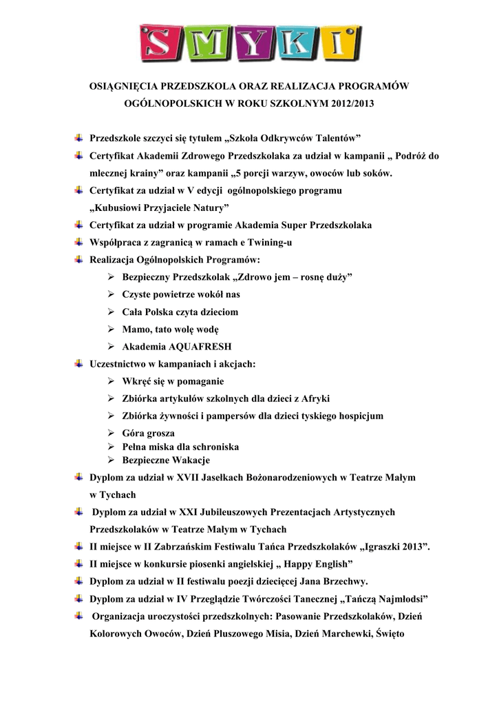 OSIĄGNIĘCIA PRZEDSZKOLA ORAZ REALIZACJA PROGRAMÓW OGÓLNOPOLSKICH W ROKU SZKOLNYM 2012/2013 Przedszkole szczyci się tytułem „Szkoła Odkrywców Talentów” Certyfikat Akademii Zdrowego Przedszkolaka za udział w kampanii „ Podróż do mlecznej krainy” oraz kampanii „5 porcji warzyw, owoców lub soków. Certyfikat za udział w V edycji ogólnopolskiego programu „Kubusiowi Przyjaciele Natury” Certyfikat za udział w programie Akademia Super Przedszkolaka Współpraca z zagranicą w ramach e Twining-u Realizacja Ogólnopolskich Programów:  Bezpieczny Przedszkolak „Zdrowo jem – rosnę duży”  Czyste powietrze wokół nas  Cała Polska czyta dzieciom  Mamo, tato wolę wodę  Akademia AQUAFRESH Uczestnictwo w kampaniach i akcjach:  Wkręć się w pomaganie  Zbiórka artykułów szkolnych dla dzieci z Afryki  Zbiórka żywności i pampersów dla dzieci tyskiego hospicjum  Góra grosza  Pełna miska dla schroniska  Bezpieczne Wakacje Dyplom za udział w XVII Jasełkach Bożonarodzeniowych w Teatrze Małym w Tychach Dyplom za udział w XXI Jubileuszowych Prezentacjach Artystycznych Przedszkolaków w Teatrze Małym w Tychach II miejsce w II Zabrzańskim Festiwalu Tańca Przedszkolaków „Igraszki 2013”. II miejsce w konkursie piosenki angielskiej „ Happy English” Dyplom za udział w II festiwalu poezji dziecięcej Jana Brzechwy. Dyplom za udział w IV Przeglądzie Twórczości Tanecznej „Tańczą Najmłodsi” Organizacja uroczystości przedszkolnych: Pasowanie Przedszkolaków, Dzień Kolorowych Owoców, Dzień Pluszowego Misia, Dzień Marchewki, Święto Krajów Partnerskich, Święto Języków Europejskich, Dzień Zdrowych Warzyw, Wigilia przedszkolna, Walentynki, Dzień górnika, Dzień Dziecka, Dzień Babci i Dziadka, Bal przebierańców, Dzień Matki i Ojca, Andrzejki Nocne, Mikołaj. Udział w konkursach plastycznych:” Ach uśnij, że mi uśnij”, „Akademia zdrowych zuchów- zuch porządniś uczy brudasińskiego”, „Akademia super przedszkolaka”, „Pies, kot mój najlepszy przyjaciel”, „Mama, matusia, mateńka”, Organizacja wycieczek: Chorzów ZOO, Leśny Park Niespodzianek w Ustroniu, zagroda żubrów w Pszczynie, Brenna, Teatr Banialuka w Bielsku Białej, Nibylandia w Katowicach Murcki, Żubrowiska w Jankowicach, Muzeum chleba w Radzionkowie, Organizacja Zielonego Przedszkola do Zawoi. Współpraca z placówkami oświatowymi i środowiskiem: Szkoła STO, ZS nr 5, Filia nr VII Biblioteki Miejskiej dla dzieci, Teatr Mały w Tychach, Policja, Multikino, basen miejski.