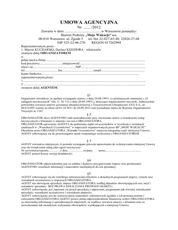 UMOWA AGENCYJNA Nr ......./2012 Zawarta w dniu .........................................w Warszawie pomiędzy: Biurem Podróży „Moje Wakacje” s.c. 00-018 Warszawa ul. Zgoda 5 tel./fax 22-827-65-48; 22826-37-68 NIP 525-22-06-270 REGON 017262994 Reprezentowanym przez : 1. Marcin KUCHARSKI, Dariusz KĘDZIORA - właściciele zwanym dalej ORGANIZATOREM a: pełna nazwa firmy......................................................................................................................... kod pocztowy............................miejscowość............................................................................... ulica i nr....................................................NIP............................................................................... tel.........................................fax......................................email..................................................... konto bankowe....................................................................................................................... reprezentowanym przez: 1 .................................................................................................................................................... 2 .................................................................................................................................................... zwanym dalej AGENTEM. §1 Organizator oświadcza ,że spełnia wymagania ustawy z dnia 29.08.1997r. (z późniejszymi zmianami ) „O usługach turystycznych” (Dz. U. Nr 133 z dnia 29.09.1997r.), dotyczące organizatorów turystyki. Jednocześnie potwierdza zawarcie umowy gwarancji ubezpieczeniowej z Towarzystwem Ubezpieczeń AXA S.A.. nr 00.614.095 ważnej na okres od 01.10.2011 do 30.09.2012 oraz posiadanie wpisu do Rejestru Organizatorów Turystyki nr 1161. §2 ORGANIZATOR zleca AGENTOWI stałe pośredniczenie przy zawieraniu umów o świadczenie usług turystycznych z klientami w imieniu i na rzecz ORGANIZATORA. ORGANIZATOR upoważnia AGENTA do pobierania wpłat od uczestników w wysokości i terminach ustalonych w „Warunkach Uczestnictwa” w imprezach organizowanych przez BP „MOJE WAKACJE”. Określone przez ORGANIZATORA „Warunki Uczestnictwa” stanowią integralną część niniejszej Umowy. AGENT zobowiązuje się do przestrzegania zasad wzajemnego rozliczenia z ORGANIZATOREM. §3 AGENT oświadcza niniejszym, iż posiada wymagane prawem uprawnienia do wykonywania niniejszej Umowy oraz do świadczenia usług jako agent turystyczny: Nr zezwolenia/rejestru................z dnia ....................wydany przez................................................ AGENT ponosi koszty swojej działalności. §4 ORGANIZATOR odpowiedzialny jest za solidne i fachowe przygotowanie imprez oraz przekazanie AGENTOWI wszelkich informacji i materiałów niezbędnych do ich sprzedaży. §5 AGENT zobowiązuje się do rzetelnego informowania klientów o aktualnych programach imprez, cenach oraz warunkach uczestnictwa w imprezach ORGANIZATORA. AGENT ma obowiązek sprzedaży imprez ORGANIZATORA według aktualnie obowiązujących cen, taryf i warunków sprzedaży BEZ PRAWA DOLICZANIA PROWIZJI (MARŻY). AGENT zobowiązany jest zapoznać się przed sprzedażą z imprezami, programami jak również instrukcjami sprzedaży, warunkami uczestnictwa i warunkami płatności. AGENT zobowiązany jest do wykorzystania materiałów reklamowych zgodnie z ich przeznaczeniem i zaleceniem ORGANIZATORA.AGENT ponosi pełną odpowiedzialność finansową wobec ORGANIZATORA za nierzetelną informację o sprzedawanych imprezach, za wadliwe zawarcie umowy z klientem oraz za niewykonanie lub nienależyte wykonanie obowiązków wynikających z niniejszej Umowy. §6 Rezerwacja miejsc przez AGENTA musi mieć formę zgłoszenia pisemnego, zawierającego kompletne dane dotyczące wszystkich uczestników oraz imprezy, którą zainteresowany jest klient (imię i nazwisko uczestników, data i miejsce urodzenia, seria i nr paszportu oraz do kiedy ważny, adres zameldowania z kodem pocztowym, miejsce wsiadania oraz rodzaj i termin imprezy). Wszelkie zmiany i uzupełnienia również wymagają formy pisemnej. Przed dokonaniem sprzedaży AGENT upewnia się telefonicznie (ew. fax, internet) czy oferta jest aktualna oraz czy są wolne miejsca na imprezie, którą klient jest zainteresowany. Umowa z klientem winna być sporządzona na druku dostarczonym przez ORGANIZATORA albo na innym druku zawierającym niezbędne dane do zawarcia umowy i spełniającym wymogi stosowanie do art. 12-14 ustawy „O usługach turystycznych”. AGENT zobowiązuje się do przestrzegania wszelkich zasad dotyczących rezerwacji, narzuconych przez ORGANIZATORA. §7 W przypadku rezygnacji klienta z udziału w imprezie AGENT przyjmuje pisemną rezygnację i powiadamia o tym niezwłocznie ORGANIZATORA. Jednocześnie obciąża klienta kwotą zgodnie z punktem Warunków Uczestnictwa dotyczącym rezygnacji. Jako datę rezygnacji przyjmuje się datę otrzymania pisemnej wiadomości od AGENTA, zawierającej dane klienta oraz rodzaj i termin imprezy, której rezygnacja dotyczy. §8 ORGANIZATOR upoważnia AGENTA do przyjmowania reklamacji dotyczących imprez w terminie 7 dni od daty zakończenia imprezy i niezwłocznego przekazania ich ORGANIZATOROWI. ORGANIZATOR rozpatruje reklamacje w terminie do jednego miesiąca od daty wpłynięcia do ORGANIZATORA. Reklamacje do ofert typu „last minute” są ograniczone. Wszelkie zwroty pieniężne na rzecz klienta mogą być dokonane przez AGENTA po uprzednim uzgodnieniu z ORGANIZATOREM. §9 Z tytułu prowadzonej sprzedaży AGENT otrzymuję prowizję w wysokości określonej przez ORGANIZATORA osobnym komunikatem załączonym do aktualnej oferty. Każdorazowo po dokonaniu pisemnej rezerwacji ORGANIZATOR wystawia AGENTOWI potwierdzenie lub fakturę proforma na łączną kwotę należności za pobrane miejsca, z wyszczególnieniem terminu płatności zaliczki i dopłaty do p