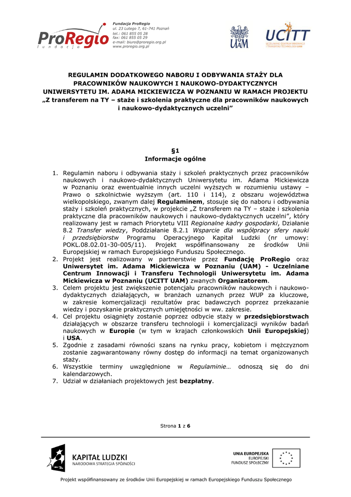 Fundacja ProRegio ul. 23 Lutego 7, 61-741 Poznań tel.: 061 855 05 28 fax: 061 855 05 29 e-mail: [email protected] www.proregio.org.pl REGULAMIN DODATKOWEGO NABORU I ODBYWANIA STAŻY DLA PRACOWNIKÓW NAUKOWYCH I NAUKOWO-DYDAKTYCZNYCH UNIWERSYTETU IM. ADAMA MICKIEWICZA W POZNANIU W RAMACH PROJEKTU „Z transferem na TY – staże i szkolenia praktyczne dla pracowników naukowych i naukowo-dydaktycznych uczelni” §1 Informacje ogólne 1. Regulamin naboru i odbywania staży i szkoleń praktycznych przez pracowników naukowych i naukowo-dydaktycznych Uniwersytetu im. Adama Mickiewicza w Poznaniu oraz ewentualnie innych uczelni wyższych w rozumieniu ustawy – Prawo o szkolnictwie wyższym (art. 110 i 114), z obszaru województwa wielkopolskiego, zwanym dalej Regulaminem, stosuje się do naboru i odbywania staży i szkoleń praktycznych, w projekcie „Z transferem na TY – staże i szkolenia praktyczne dla pracowników naukowych i naukowo-dydaktycznych uczelni”, który realizowany jest w ramach Priorytetu VIII Regionalne kadry gospodarki, Działanie 8.2 Transfer wiedzy, Poddziałanie 8.2.1 Wsparcie dla współpracy sfery nauki i przedsiębiorstw Programu Operacyjnego Kapitał Ludzki (nr umowy: POKL.08.02.01-30-005/11). Projekt współfinansowany ze środków Unii Europejskiej w ramach Europejskiego Funduszu Społecznego. 2. Projekt jest realizowany w partnerstwie przez Fundację ProRegio oraz Uniwersytet im. Adama Mickiewicza w Poznaniu (UAM) - Uczelniane Centrum Innowacji i Transferu Technologii Uniwersytetu im. Adama Mickiewicza w Poznaniu (UCITT UAM) zwanych Organizatorem. 3. Celem projektu jest zwiększenie potencjału pracowników naukowych i naukowodydaktycznych działających, w branżach uznanych przez WUP za kluczowe, w zakresie komercjalizacji rezultatów prac badawczych poprzez przekazanie wiedzy i pozyskanie praktycznych umiejętności w ww. zakresie. 4. Cel projektu osiągnięty zostanie poprzez odbycie staży w przedsiębiorstwach działających w obszarze transferu technologii i komercjalizacji wyników badań naukowych w Europie (w tym w krajach członkowskich Unii Europejskiej) i USA. 5. Zgodnie z zasadami równości szans na rynku pracy, kobietom i mężczyznom zostanie zagwarantowany równy dostęp do informacji na temat organizowanych staży. 6. Wszystkie terminy uwzględnione w Regulaminie… odnoszą się do dni kalendarzowych. 7. Udział w działaniach projektowych jest bezpłatny. Strona 1 z 6 Projekt współfinansowany ze środków Unii Europejskiej w ramach Europejskiego Funduszu Społecznego Fundacja ProRegio ul. 23 Lutego 7, 61-741 Poznań tel.: 061 855 05 28 fax: 061 855 05 29 e-mail: [email protected] www.proregio.org.pl §2 Postanowienia ogólne 1. 2. 3. 4. 5. O udział w stażu ubiegać się mogą etatowi pracownicy naukowi i naukowodydaktyczni UAM w rozumieniu ustawy Prawo o szkolnictwie wyższym (art. 110 i 114). Nabór aplikacji odbywać się będzie od 11 czerwca 2012 do 25 czerwca 2012 r. Kompletną dokumentację rekrutacyjną w formie papierowej należy złożyć w siedzibie Uczelnianego Centrum Innowacji i Transferu Technologii UAM, ul. Zwierzyniecka 7c, 60-813 Poznań, pokój nr 116, do godziny 15.30 dnia 25 czerwca 2012 r. Dokumentację można dostarczyć osobiście lub przesłać pocztą. W przypadku dokumentów nadsyłanych pocztą o przyjęciu dokumentów decyduje data stempla pocztowego. Dokumenty złożone po terminie nie będą rozpatrywane. Dokumenty konieczne do przeprowadzenia rekrutacji: A. Obligatoryjne 1) 2) 3) 4) 5) B. Fakultatywne 1) 2) 3) 4) 6. Formularz zgłoszeniowy (wg załącznika nr 1 – który jest możliwy do pobrania na stronach Organizatora: www.proregio.org.pl, www.ucitt.pl) Życiorys zawodowy zawierający listę publikacji w języku polskim i angielskim Zaświadczenie lub certyfikat potwierdzający znajomość języka angielskiego, niemieckiego lub francuskiego, alternatywnie innego języka obcego, w którym będzie odbywał się staż (zgodnie z listem intencyjnym lub deklaracją jego uzyskania), w stopniu pozwalającym na swobodną komunikację Opinia bezpośredniego przełożonego. Oświadczenie o wyrażeniu zgody na przetwarzanie danych osobowych (wg załącznika nr 6 - do pobrania na stronie: www.proregio.org.pl, www.ucitt.pl). Aktywność kandydata w zakresie współpracy z gospodarką (projekty nauka-gospodarka, staże, praktyki, udokumentowane wdrożenia wyników prac badawczych, inna udokumentowana współpraca z gospodarką) Zgłoszenie patentowe i/lub uzyskane prawa ochronne Deklaracja uzyskania listu intencyjnego od konkretnego przedsiębiorstwa, w którym uczestnik chciałby odbyć staż (do pobrania na stronie Organizatora) lub list intencyjny wystawiony przez przedsiębiorstwo przyjmujące na staż Dokumenty potwierdzające wiedzę kandydata z tematyki komercjalizacji badań, np. ukończone kursy, szkolenia, prowadzona działalność dydaktyczna i publikacyjna. Za spełnienie poszczególnych kryteriów przyznawane będą punkty, których zestawienie znajduje się w §3 pkt. 6. Strona 2 z 6 Projekt współfinansowany ze środków Unii Europejskiej w ramach Europejskiego Funduszu Społecznego Fundacja ProRegio ul. 23 Lutego 7, 61-741 Poznań tel.: 061 855 05 28 fax: 061 855 05 29 e-mail: [email protected] www.proregio.org.pl §3 Zasady rekrutacji 1. 2. Rekrutacja będzie prowadzona zgodnie z zasadami równości szans kobiet i mężczyzn. Udział w stażach skierowany jest do pracowników naukowych i naukowodydaktycznych UAM, a w przypadku niewystarczającego zainteresowania z innych uczelni wyższych z obszaru województwa wielkopolskiego, w wieku 25 – 60 lat działających w branżach uznanych przez WUP w Poznaniu za kluczowe dla rozwoju województwa wielkopolskiego, w tym: 3. 4. 5. 6. budownictwo biotechnologiczna chemiczna elektroniczna farmaceutyczna finanse i ubezpieczenia gastronomiczna handlowa hotelarska ICT logistyczna metalowa motoryzacyjna odzieżowa rolnictwo spożywcza stolarsko-meblarska tu