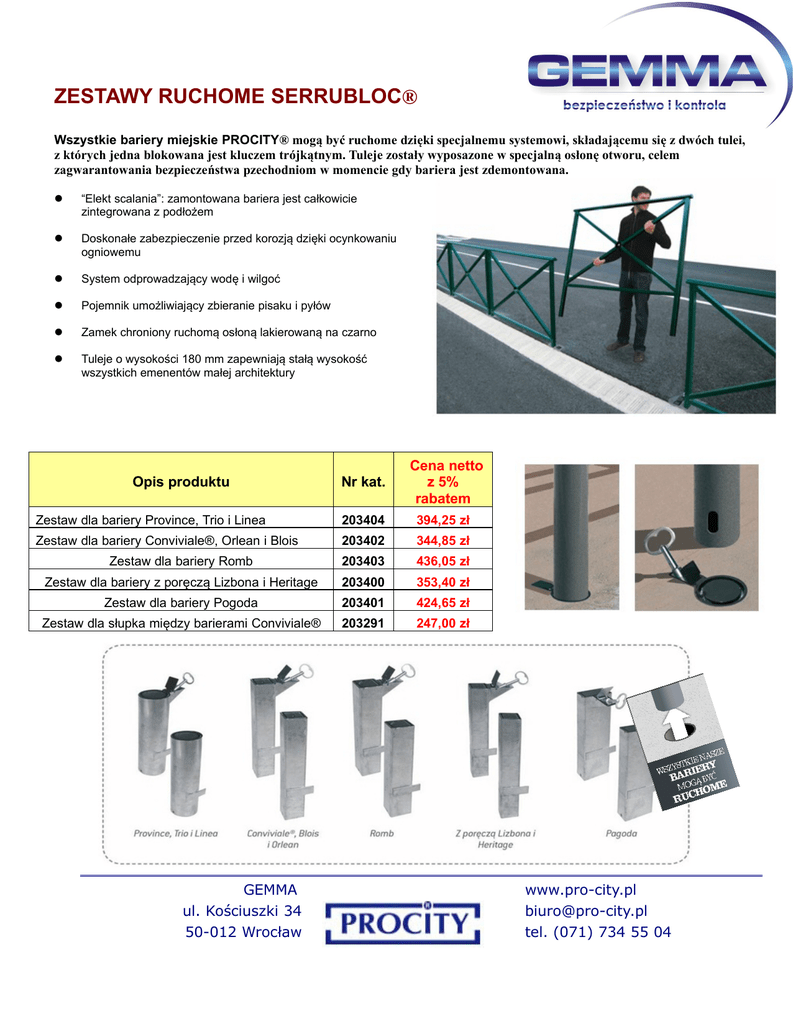 ZESTAWY RUCHOME SERRUBLOC® Wszystkie bariery miejskie PROCITY® mogą być ruchome dzięki specjalnemu systemowi, składającemu się z dwóch tulei, z których jedna blokowana jest kluczem trójkątnym. Tuleje zostały wyposazone w specjalną osłonę otworu, celem zagwarantowania bezpieczeństwa pzechodniom w momencie gdy bariera jest zdemontowana. “Elekt scalania”: zamontowana bariera jest całkowicie zintegrowana z podłożem Doskonałe zabezpieczenie przed korozją dzięki ocynkowaniu ogniowemu System odprowadzający wodę i wilgoć Pojemnik umożliwiający zbieranie pisaku i pyłów Zamek chroniony ruchomą osłoną lakierowaną na czarno Tuleje o wysokości 180 mm zapewniają stałą wysokość wszystkich emenentów małej architektury Nr kat. Cena netto z 5% rabatem Zestaw dla bariery Province, Trio i Linea 203404 394,25 zł Zestaw dla bariery Conviviale®, Orlean i Blois 203402 344,85 zł Zestaw dla bariery Romb 203403 436,05 zł Zestaw dla bariery z poręczą Lizbona i Heritage 203400 353,40 zł Zestaw dla bariery Pogoda 203401 424,65 zł Zestaw dla słupka między barierami Conviviale® 203291 247,00 zł Opis produktu GEMMA ul. Kościuszki 34 50-012 Wrocław www.pro-city.pl [email protected] tel. (071) 734 55 04
