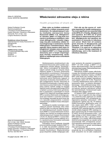 PRACE POGL¥DOWE Wiktor B. SZOSTAK Dorota SZOSTAK-WÊGIEREK W³aciwoci zdrowotne oleju z rekina Health properties of shark oil Zak³ad Profilaktyki Chorób ¯ywieniowozale¿nych z Poradni¹ Chorób Metabolicznych Instytut ¯ywnoci i ¯ywienia w Warszawie Kierownik: Prof. dr hab. med. Longina K³osiewicz-Latoszek Dodatkowe s³owa kluczowe: wielonienasycone kwasy t³uszczowe n-3 alkiloglicerole skwalen olej z w¹troby rekina Additional key words: n-3 polyunsaturated fatty acids alkylglycerols squalene shark liver oil Adres do korespondencji: Prof. dr hab. med. Wiktor Szostak Zak³ad Profilaktyki Chorób ¯ywieniowozale¿nych z Poradni¹ Chorób Metabolicznych Instytut ¯ywnoci i ¯ywienia w Warszawie 02-903 Warszawa, ul. Powsiñska 61/63 Tel./Fax: 022 842 49 47 Przegl¹d Lekarski 2006 / 63 / 4 Oleje rybie s¹ ród³em substancji od¿ywczych o du¿ym znaczeniu prozdrowotnym. Do najwa¿niejszych nale¿¹ niezbêdne nienasycone kwasy t³uszczowe (NNKT n-3), alkiloglicerole i skwalen. NNKT n-3 maj¹ du¿e znaczenie w profilaktyce mia¿d¿ycy, natomiast alkiloglicerole i skwalen odgrywaj¹ rolê jako modulatory uk³adu immunologicznego w zwalczaniu chorób infekcyjnych i nowotworowych. Olej z w¹troby rekina zawiera du¿e iloci alkilogliceroli i skwalen oraz umiarkowane stê¿enia NNKT n-3. Z tego powodu stosowany jest w terapii wspomagaj¹cej choroby nowotworowej, szczególnie w radioterapii oraz w chorobach infekcyjnych. Fish oils are the source of nutrients important for health maintenance. The most significant are essential fatty acids (EFA) of n-3 family, alkylglycerols and squalene. N-3 EFA are of great importance in atherosclerosis prevention. Alkylglycerols and squalene are modulators of immunity to infections and cancer. Shark liver oil contains great amounts of alkylglycerols and squalene, and moderate of n-3 EFA. Therefore, it is used as an adjunctive agent in cancer therapy, especially in radiotherapy, and in the treatment of infectious diseases. Zainteresowanie prozdrowotnymi w³aciwociami t³uszczów rybich zosta³o zapocz¹tkowane pracami Banga, Dyerberga i wsp., którzy w pocz¹tkach lat siedemdziesi¹tych zwrócili uwagê na znacznie ni¿sze stê¿enia lipidów w surowicy Eskimosów grenlandzkich w porównaniu z Duñczykami i Eskimosami ¿yj¹cymi w Danii, co kojarzyli z bardzo rzadkim wystêpowaniem choroby wieñcowej wród Eskimosów ¿yj¹cych w naturalnym rodowisku Grenlandii [2,3]. Niskie wystêpowanie choroby wieñcowej na Grenlandii kontrastowa³o z wysokim spo¿yciem t³uszczu przez Eskimosów. W kolejnej pracy autorzy zwrócili uwagê na wysokie stê¿enie kwasu eikozapentaenowego (EPA) w lipidach surowicy Eskimosów grenlandzkich w porównaniu z populacjami w innych krajach [15]. Zale¿noæ wysokiego stê¿enia EPA w surowicy Eskimosów od du¿ego spo¿ycia tych kwasów w ¿ywnoci pochodzenia morskiego nasuwa³a siê samo przez siê, a to nasuwa³o przypuszczenie o przeciwmia¿d¿ycowym dzia³aniu kwasu eikozapentaenowego. Koncepcja ta zosta³a rozwiniêta w póniejszych pracach Dyerberga, który wskazywa³ nie tylko na znacznie wiêksze spo¿ycie wielonienasyconych kwasów t³uszczowych (NNKT) n-3 przez Eskimosów ni¿ Duñczyków, lecz równie¿ na mniejsze spo¿ycie wielonienasyconych kwasów t³uszczowych n-6 [16,17]. Spo¿ycie NNKT n-3 przez Eskimosów by³o prawie 3-krotnie wiêksze ni¿ n6, a spo¿ycie przez Duñczyków cechowa³o siê proporcj¹ odwrotn¹. Póniejsze liczne publikacje dowiod³y przeciwmia¿d¿ycowego dzia³ania NNKT n3, co sta³o siê powodem ustalenia normy na zalecone spo¿ycie wielonienasyconych kwasów t³uszczowych. Miêdzynarodowa grupa ekspertów ustali³a nastêpuj¹ce zale- cane spo¿ycie dla populacji europejskich: NNKT n-6 4-8% energii, a NNKT n-3 2g kwasu alfa-linolenowego i 200 mg kwasów eikozapentaenowego i dokozaheksaenowego dziennie (DHA) [22]. Naturalnym ród³em kwasu alfa-linolenowego dla cz³owieka s¹ liciaste warzywa i oleje lniany, rzepakowy i sojowy, a ród³em EPA i DHA t³uste ryby morskie, które w razie potrzeby mo¿na zast¹piæ kapsu³kowanymi olejami rybimi [10,14,34]. Pacjentom z chorob¹ niedokrwienn¹ serca zaleca siê spo¿ywanie oko³o 1 g kwasów eikozapentaenowego i dokozaheksaenowego dziennie [34]. Taka iloæ trudna jest do osi¹gniêcia poprzez spo¿ycie naturalnych produktów ¿ywnociowych. Konieczna jest suplementacja diety olejami rybimi. W badaniu DART spo¿ywanie przez 2 lata ryb 2 razy w tygodniu lub oleju rybiego 1,5 g dziennie przez mê¿czyzn po zawale serca spowodowa³o 16% zmniejszenie wystêpowania epizodów wieñcowych i 29% umieralnoci ogólnej [wg 32]. W badaniu GISSI-Prevenzione spo¿ywanie przez 3,5 roku olejów rybich (EPA + DHA 1 g dziennie) przez pacjentów po zawale serca spowodowa³o 30% redukcjê zgonów z powodu chorób uk³adu kr¹¿enia i 45% redukcjê nag³ych zgonów [wg 32]. W Indian Experiment of Infarct Survival spo¿ywanie przez 1 rok oleju rybiego w iloci dostarczaj¹cej 1,08 g EPA dziennie lub oleju z gorczycy dostarczaj¹cego 2,9 g kwasu alfa-linolenowego dziennie przez pacjentów po zawale serca spowodowa³o 30% zmniejszenie ponownych epizodów wieñcowych po oleju rybim i 19% zmniejszeniu w grupie spo¿ywaj¹cej olej z gorczycy [wg 32]. Na podstawie wspó³czesnej wiedzy przyjmuje siê, ¿e w profilaktyce mia¿d¿ycy du¿e znaczenie ma nie tylko zwiêkszone 223 spo¿ycie NNKT n-3, lecz równie¿ niski stosunek NNKT n-6 /NNKT n-3 w ¿ywieniu. Znaczenie profilaktyczne niskiego stosunku wielonienasyconych kwasów t³uszczowych z rodziny n-6 do n-3 t³umaczone jest ró¿nic¹ w intensywnoci dzia³ania eikozanoidów, powstaj¹cych w organizmie cz³owieka z tych kwasów. Zarówno kwas arachidonowy (rodzina n-6), jak i eikozapentaenowy (rodzina n-3) s¹ substratem do syntezy tromboksanów (TXA), prostacyklin (PGI) i leukotrienów (LTB). Kwas arachidonowy, powstaj¹cy w organizmie z kwasu linolowego, ulega przemianom do wysoce aktywnych TXA2, PGI2, LTB4. Natomiast kwas eikoz