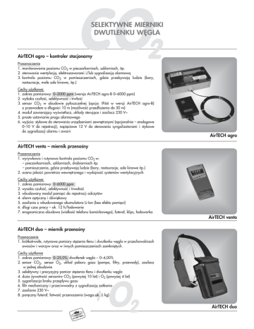 CO2 SELEKTYWNE MIERNIKI DWUTLENKU W¢GLA AirTECH agro – kontroler stacjonarny Przeznaczenie 1. monitorowanie poziomu CO2 w pieczarkarniach, szklarniach, itp. 2. sterowanie wentylacjà, elektrozaworami i/lub sygnalizacjà alarmowà 3. kontrola poziomu CO2 w pomieszczeniach, gdzie przebywajà ludzie (bary, restauracje, ma∏e sale kinowe, itp.) Cechy u˚ytkowe: 1. zakres pomiarowy: 0–2000 ppm (wersja AirTECH agro-B 0–6000 ppm) 2. wykoka czu∏oÊç, selektywnoÊç i trw∏oÊç 3. sensor CO2 w obudowie py∏oszczelnej (opcja: IP44 w wersji AirTECH agro-B) z przewodem o d∏ugoÊci 10 m (mo˚liwoÊç przed∏u˚enia do 50 m) 4. modu∏ zawierajàcy wyÊwietlacz, uk∏ady sterujàce i zasilacz 230 V~ 5. proste ustawianie progu alarmowego 6. wyjÊcia: stykowe do sterowania urzàdzeniami zewn´trznymi (opcjonalnie – analogowe 0–10 V do rejestracji), napi´ciowe 12 V do sterowania syngalizatorami i stykowe do sygnalizacji alarmu i awarii AirTECH agro AirTECH vento – miernik przenoÊny Przeznaczenie 1. wyrywkowa i rutynowa kontrola poziomu CO2 w: – pieczarkarniach, szklarniach, drobiarniach itp. – pomieszczenia, gdzie przebywajà ludzie (bary, restauracje, sale kinowe itp.) 2. ocena jakoÊci powietrza wewn´trznego i wydajnoÊç systemów wentylacyjnych Cechy u˚ytkowe: 1. zakres pomiarowy: 0–6000 ppm 2. wysoka czu∏oÊç, selektywnoÊç i trwa∏oÊç 3. wbudowany modu∏ pami´ci do rejestracji odczytów 4. alarm optyczny i d˝wi´kowy 5. zasilanie z wbudowanego akumulatora Li-Ion (bez efektu pami´ci) 6. d∏ugi czas pracy – ok. 12 h/∏adowanie 7. erognomiczna obudowa (wielkoÊç telefonu komórkowego), futera∏, klips, ∏adowarka AirTECH vento AirTECH duo – miernik przenoÊny Przenaczenie 1. krótkotrwa∏e, rutynowe pomiary st´˚enia tlenu i dwutlenku w´gla w przechowalniach owoców i warzyw oraz w innych pomieszczeniach zamkni´tych. Cechy u˚ytkowe 1. zakres pomiarowy: 0–25,0%; dwutlenek w´gla – 0–4,00% 2. sensor CO2, sensor O2, uk∏ad poboru gazu (pompa, filtry, przewody), zasilacz w jednej obudowie 3. selektywny i precyzyjny pomiar st´˚enia tlenu i dwutlenku w´gla 4. du˚a ˚ywotnoÊç sensorów CO2 (powy˚ej 10 lat) i O2 (powy˚ej 4 lat) 5. syganlizacja braku przep∏ywu gazu 6. filtr mechaniczny i przeciwwodny z sygnalizacjà zatkania 7. zasilanie 230 V~ 8. por´czny futera∏, ∏atwoÊç przenoszenia (waga ok. 1 kg) + EN ISO 900 1 O2 AirTECH duo KONTROLA ST¢˚ENIA DWUTLENKU W¢GLA A ROLNICTWO: produkcja szklarniowa, uprawa grzybów, przechowalnictwo owoców i warzyw Wspó∏czesna produkcja ˝ywnoÊci wymaga na ka˝dym etapie stosowania ró˝norodnej aparatury kontrolno-pomiarowej. Dotyczy to równie˝ specjalistycznych gospodarstw rolnych nastawionych na wysoki plon i jakoÊç produktów. Post´p naukowo-techniczny, a przede wszystkim rozwój technik cyfrowych dokona∏ rewolucji w tej dziedzinie. Nowoczesne urzàdzenia pomiarowe sà nie tylko równie dok∏adne i niezawodne, jak sprz´t stosowany w badaniach naukowych, ale – co najwa˝niejsze – kilkunastokrotnie taƒsze i bardzo proste w obs∏udze. Dzi´ki temu nadajà si´ do powszechnego u˝ytku i nie wymagajà specjalnych kwalifikacji. Urzàdzenia takie to nie tylko termometry, wilgotnoÊciomierze czy pH-metry cyfrowe, to równie˝ mierniki innych wartoÊci fizycznych i chemicznych, w tym analizatory gazów. W biuletynie tym prezentujemy nowoczesne mierniki dwutlenku w´gla niezb´dne w kilku dziedzinach gospodarki rolnej: w produkcji szklarniowej, przy uprawie grzybów i w przechowalnictwie warzyw i owoców. Mierniki oferowane przez GAZEX sà to w pe∏ni cyfrowe urzàdzenia wykorzystujàce pomiar w podczerwieni (NDIR). Sà tanie, proste w obs∏udze i monta˝u oraz dostosowane do pracy w ci´˝kich warunkach, m.in. przy wysokiej wilgotnoÊci. Mogà byç zasilane z sieci 230 V lub z akumulatora. Nie wymagajà kalibracji (zaleca si´ jedynie kontrol´ „zera” raz w roku). Prostot´ i ∏atwoÊç pomiarów osiàgni´to m.in. przez takà konstrukcj´ sensora, która umo˝liwia jego prac´ bez pompy i dodatkowego osprz´tu, suszek, filtrów sprawiajàcych cz´sto u˝ytkownikom wiele k∏opotów. W niektórych zastosowaniach (przechowalnictwo owoców i warzyw) wymagana jest wersja przep∏ywowa miernika – z wymuszonym obiegiem gazu. Ogólne charakterystyki wraz ze zdj´ciami i orientacyjne ceny poszczególnych urzàdzeƒ przedstawiono na wewn´trznych stronach ok∏adki. PRODUKCJA SZKLARNIOWA RoÊliny uprawiane pod os∏onami sà nara˝one na niedobór dwutlenku w´gla, który jest dla nich g∏ównym sk∏adnikiem od˝ywczym. Wi´kszoÊç roÊlin uprawnych wymaga dla maksymalnej produkcji 800 – 1000 ppm CO2 (ppm – jednostka st´˝enia, milionowa cz´Êç obj´toÊci; 1000 ppm = 0.1% obj.), a wi´c st´˝enia wy˝szego ni˝ normalnie wyst´pujàce w powietrzu atmosferycznym (ok. 400 ppm). W szklarni lub w namiocie foliowym, w wyniku fotosyntezy roÊlin, st´˝enie dwutlenku w´gla mo˝e obni˝yç si´ nawet do 200 ppm. Dlatego, aby zwi´kszyç plon upraw szklarniowych, cz´sto stosuje si´ dokarmianie roÊlin dwutlenkim w´gla (spr´˝onym z butli, p∏ynnym ze zbiorników lub zawartym w spalinach pochodzàcych z nagrzewnic gazowych). Zabieg taki pozwala zwi´kszyç plon nawet o kilkadziesiàt procent. EN ISO 900 1 1 Poniewa˝ zbyt du˝e st´˝enie dwutlenku w´gla jest nieuzasadnione ekonomicznie i mo˝e byç dla roÊlin szkodliwe (szczególnie, jeÊli stosuje si´ spaliny) potrzebna jest doÊç precyzyjna kontrola poziomu CO2. Dokarmianie roÊlin dwutlenkiem w´gla mo˝e byç sterowane automatycznie, co wymaga du˝ych inwestycji w system zasilania i skanowania CO2 – jest op∏acalne dopiero przy wi´kszej produkcji. W obiektach mniejszych cz´sto stosowane jest sterowanie r´czne, polegajàce na okresowym dopuszczaniu gazowego CO2 z butli lub podawaniu spalin z nagrzewnicy pod os∏ony. Kontrola poziomu dwutlenku w´gla mo˝e odbywaç si´ automatycznie, z wykorzystaniem mie