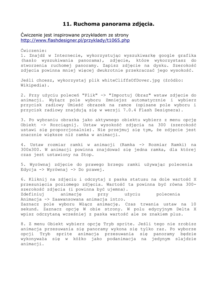 11. Ruchoma panorama zdjęcia. Ćwiczenie jest inspirowane przykładem ze strony http://www.flashdesigner.pl/przyklady/t1065.php Ćwiczenie: 1. Znajdź w Internecie, wykorzystując wyszukiwarkę google grafika (hasło wyszukiwania panorama), zdjęcie, które wykorzystasz do stworzenia ruchomej panoramy. Zapisz zdjęcie na dysku. Szerokość zdjęcia powinna mniej więcej dwukrotnie przekraczać jego wysokość. Jeśli chcesz, wykorzystaj plik whiteCliffsOfDover.jpg (źródło: Wikipedia). 2. Przy użyciu poleceń "Plik" -> "Importuj Obraz" wstaw zdjęcie do animacji. Wyłącz pole wyboru Zmniejsz automatycznie i wybierz przycisk radiowy Umieść obrazek na ramce (opisane pole wyboru i przycisk radiowy znajdują się w wersji 7.0.4 Flash Designera). 3. Po wybraniu obrazka jako aktywnego obiektu wybierz z menu opcję Obiekt -> Rozciągnij. Ustaw wysokość zdjęcia na 300 (szerokość ustawi się proporcjonalnie). Nie przejmuj się tym, że zdjęcie jest znacznie większe niż ramka w animacji. 4. Ustaw rozmiar ramki w animacji (Ramka -> Rozmiar Ramki) na 300x300. W animacji powinna znajdować się jedna ramka, dla której czas jest ustawiony na Stop. 5. Wyrównaj zdjęcie do prawego brzegu ramki używając polecenia Edycja -> Wyrównaj -> Do prawej. 6. Kliknij na zdjęciu i odczytaj z paska statusu na dole wartość X przesunięcia poziomego zdjęcia. Wartość ta powinna być równa 300szerokość zdjęcia (i powinna być ujemna). Zdefiniuj animację przy użyciu polecenia Animacja -> Zaawansowana animacja intro. Zaznacz pole wyboru Włącz animację. Czas trwania ustaw na 10 sekund. Zaznacz opcję W obie strony. W polu edycyjnym Delta X wpisz odczytaną wcześniej z paska wartość ale ze znakiem plus. 8. Z menu Obiekt wybierz opcję Tryb sprite. Jeśli tego nie zrobisz animacja przesuwania się panoramy wykona się tylko raz. Po wyborze opcji Tryb sprite animacja przesuwania się panoramy będzie wykonywała się w kółko jako podanimacja na jedynym slajdzie animacji.