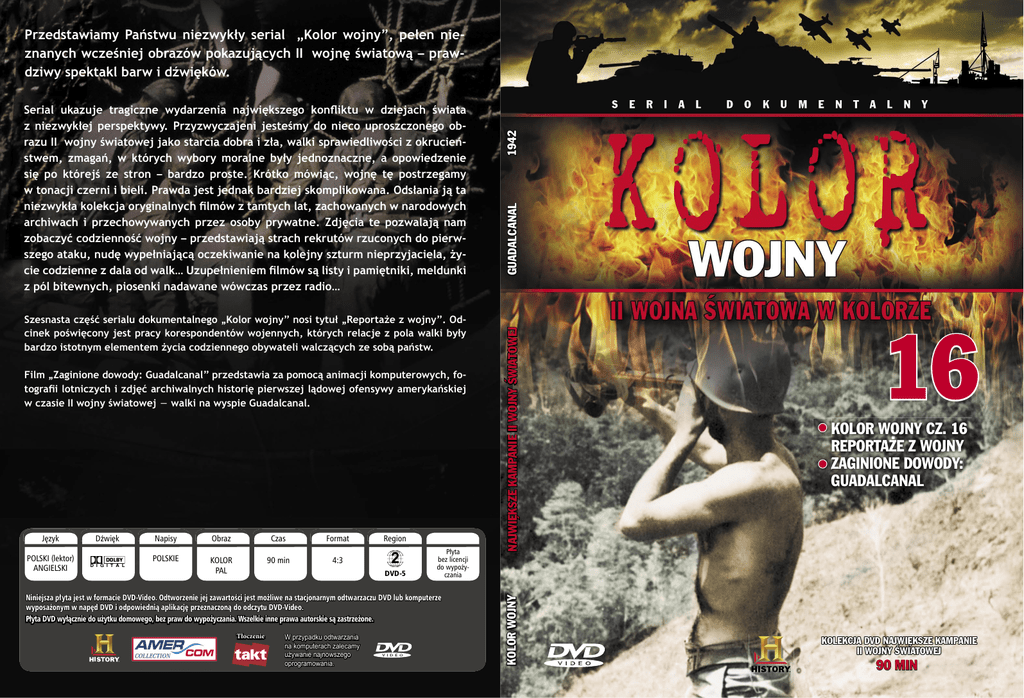 Film „Zaginione dowody: Guadalcanal” przedstawia za pomocą animacji komputerowych, fotografii lotniczych i zdjęć archiwalnych historię pierwszej lądowej ofensywy amerykańskiej w czasie II wojny światowej walki na wyspie Guadalcanal. Język POLSKI (lektor) ANGIELSKI Dźwięk D I G I T A L Napisy POLSKIE Obraz Czas Format KOLOR PAL 90 min 4:3 Region 2 DVD-5 Płyta bez licencji do wypożyczania Niniejsza płyta jest w formacie DVD-Video. Odtworzenie jej zawartości jest możliwe na stacjonarnym odtwarzaczu DVD lub komputerze wyposażonym w napęd DVD i odpowiednią aplikację przeznaczoną do odczytu DVD-Video. Płyta DVD wyłącznie do użytku domowego, bez praw do wypożyczania. Wszelkie inne prawa autorskie są zastrzeżone. Tłoczenie W przypadku odtwarzania na komputerach zalecamy używanie najnowszego oprogramowania. GUADALCANAL ` NAJWIEKSZE KAMPANIE II WOJNY SWIATOWEJ ` Szesnasta część serialu dokumentalnego „Kolor wojny” nosi tytuł „Reportaże z wojny”. Odcinek poświęcony jest pracy korespondentów wojennych, których relacje z pola walki były bardzo istotnym elementem życia codziennego obywateli walczących ze sobą państw. KOLOR WOJNY Serial ukazuje tragiczne wydarzenia największego konfliktu w dziejach świata z niezwykłej perspektywy. Przyzwyczajeni jesteśmy do nieco uproszczonego obrazu II wojny światowej jako starcia dobra i zła, walki sprawiedliwości z okrucieństwem, zmagań, w których wybory moralne były jednoznaczne, a opowiedzenie się po którejś ze stron – bardzo proste. Krótko mówiąc, wojnę tę postrzegamy w tonacji czerni i bieli. Prawda jest jednak bardziej skomplikowana. Odsłania ją ta niezwykła kolekcja oryginalnych filmów z tamtych lat, zachowanych w narodowych archiwach i przechowywanych przez osoby prywatne. Zdjęcia te pozwalają nam zobaczyć codzienność wojny – przedstawiają strach rekrutów rzuconych do pierwszego ataku, nudę wypełniającą oczekiwanie na kolejny szturm nieprzyjaciela, życie codzienne z dala od walk… Uzupełnieniem filmów są listy i pamiętniki, meldunki z pól bitewnych, piosenki nadawane wówczas przez radio… 1942 Przedstawiamy Państwu niezwykły serial „Kolor wojny”, pełen nieznanych wcześniej obrazów pokazujących II wojnę światową – prawdziwy spektakl barw i dźwięków. 16 KOLOR WOJNY . CZ. 16 REPORTAZE Z WOJNY ZAGINIONE DOWODY: GUADALCANAL 90 MIN