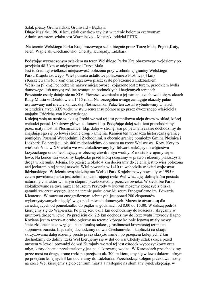 Szlak pieszy Grunwaldzki: Grunwald – Bądzyn. Długość szlaku: 98.10 km, szlak oznakowany jest w terenie kolorem czerwonym Administratorem szlaku jest Warmińsko – Mazurski oddział PTTK. Na terenie Welskiego Parku Krajobrazowego szlak biegnie przez Turzę Małą, Prętki ,Koty, Jeleń, Wąpielsk, Ciechanówko, Chełsty, Kurojady, Lidzbark. Podążając wyznaczonym szlakiem na teren Welskiego Parku Krajobrazowego wejdziemy po przejściu 48.3 km w miejscowości Turza Mała. Jest to średniej wielkości miejscowość położona przy wschodniej granicy Welskiego Parku Krajobrazowego. Wieś posiada asfaltowe połączenie z Płośnicą (4 km) i Koszelewami (6,5 km) oraz częściowo piaszczyste połączenie z Lidzbarkiem Welskim (9 km).Pochodzenie nazwy miejscowości kojarzone jest z turem, przodkiem bydła domowego, lub turzycą rośliną rosnącą na podmokłych i bagiennych terenach. Powstanie osady datuje się na XIV. Pierwsza wzmianka o jej istnieniu zachowała się w aktach Rady Miasta w Działdowie z 1415 roku. Na szczególna uwagę zasługuje okazały pałac usytuowany nad niewielką rzeczką Płośniczanką. Pałac ten został wybudowany w latach osiemdziesiątych XIX wieku w stylu renesansu północnego przez ówczesnego właściciela majątku Fridricha von Kownatzkiego. Kolejną wsią na trasie szlaku są Prętki we wsi tej jest pomnikowa aleja drzew w skład, której wchodzi ponad 180 drzew głównie klonów i lip. Podążając dalej szlakiem przechodzimy przez mały most na Płośniczance. Idąc dalej w stronę lasu po pewnym czasie dochodzimy do znajdującego się po lewej stronie drogi kamienia. Kamień ten wyznacza historyczną granicę pomiędzy Prusami Wschodnimi i Zachodnimi, a obecnie granicę pomiędzy Gminą Płośnica i Lidzbark. Po przejściu ok. 400 m dochodzimy do mostu na rzece Wel we wsi Koty. Koty to wieś założona w XV wieku we wsi zlokalizowany był folwark należący do wójtostwa krzyżackiego oraz nieistniejący w obecnej chwili młyn wodny. Z mostu kierujemy się w lewo. Na końcu wsi widzimy kapliczkę przed którą skręcamy w prawo i idziemy piaszczystą drogą w kierunku Jelenia. Po przejściu około 4 km docieramy do Jelenia jest to wieś położona nad jeziorem o tej samej nazwie. Wieś powstała w 1410 r i wchodziła w skład wójtostwa lidzbarskiego. W Jeleniu swą siedzibę ma Welski Park Krajobrazowy powstały w 1995 r celem powołania parku jest ochrona meandrującej rzeki Wel wraz z jej doliną która posiada naturalny charakter w małym stopniu przekształcony przez człowieka. W siedzibie Parku zlokalizowane są dwa muzea: Muzeum Przyrody w którym możemy zobaczyć z bliska gatunki zwierząt występujące na terenie parku oraz Muzeum Etnograficzne im. Edwarda Klemensa. W muzeum etnograficznym zebranych jest ponad 200 eksponatów wykorzystywanych niegdyś w gospodarstwach domowych. Muzea te otwarte są dla zwiedzających od poniedziałku do piątku w godzinach od 8:00 do 15:00. W dalszą podróż kierujemy się do Wąpierska. Po przejściu ok. 1 km dochodzimy do kościoła i skręcamy w gruntową drogę w lewo. Po przejściu ok. 2,5 km dochodzimy do Rezerwatu Przyrody Bagno Koziana jest to rezerwat ornitologiczny na terenie którego kolonie lęgową miały mewy śmieszki obecnie ze względu na naturalną sukcesję roślinności krzewiastej teren ten stopniowo zarasta. Idąc dalej dochodzimy do wsi Ciechanówko i kapliczki na skraju skrzyżowania dalej idziemy prosto przez skrzyżowanie i po przejściu kolejnych 2 km dochodzimy do doliny rzeki Wel kierujemy się w dół do wsi Chełsty szlak skręca przed mostem w lewo i prowadzi do wsi Kurojady we wsi tej jest ośrodek wypoczynkowy oraz młyn, który obecnie przekształcony jest na elektrownię wodną. W Kurojadach przechodzimy przez most na drugą stronę rzeki po przejściu ok. 300 m kierujemy się w lewo duktem leśnym po przejściu kolejnych 3 km docieramy do Lidzbarka. Przechodząc kolejno przez dwa mosty na rzece Wel kierujemy się do centrum miasta a następnie na słomiany rynek skręcając w prawo wejdziemy na ul. Sądową gdzie swą siedzibę mają władze Gminy Lidzbark. Lidzbark założono w 1301 roku. Po nadaniu ziemi chełmińsko-michałowskiej Krzyżakom w 1303 roku zbudowano tu zamek i ufortyfikowane miasto. Godne zobaczenia są zabytki: kościół św. Wojciecha (patron miasta), pozostałości gotyckiej baszty zamkowej z XIV w, kościół ewangelicko-augsburski z 1829 r. W Lidzbarku warto zwiedzić Muzeum Pożarnictwa. Po minięciu siedziby Urzędu Gminy po przejściu 100 m dochodzimy do schodów prowadzących w dół do J. Lidzbarskiego następnie kierujemy się w lewo wzdłuż brzegu jeziora promenadą. Po lewej stronie kolejna pomnikowa aleja składająca się z ponad 300 drzew przewagę gatunkową stanowią lipy drobnolistne oraz klony. Dochodząc do końca promenady opuszczamy teren Welskiego Parku Krajobrazowego w dalszą drogę kierujemy się podążając za oznaczeniami szlaku.