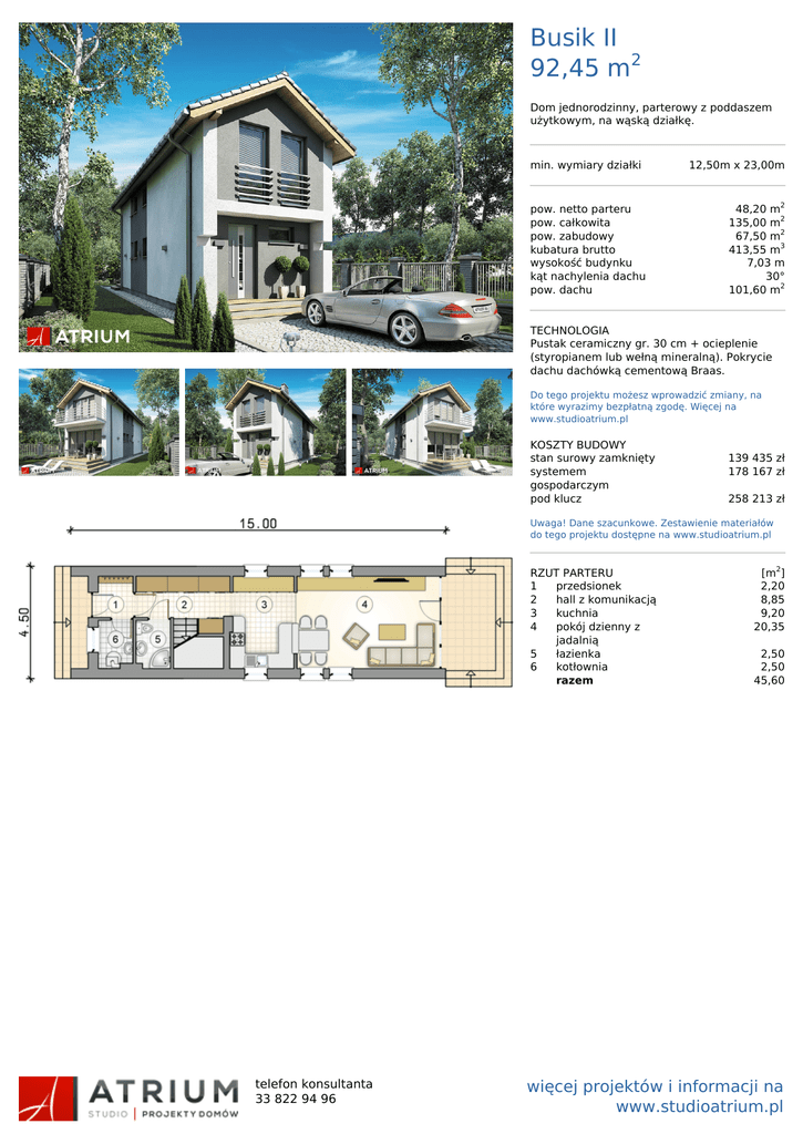 Busik II 92,45 m2 Dom jednorodzinny, parterowy z poddaszem użytkowym, na wąską działkę. min. wymiary działki pow. netto parteru pow. całkowita pow. zabudowy kubatura brutto wysokość budynku kąt nachylenia dachu pow. dachu 12,50m x 23,00m 48,20 m2 135,00 m2 67,50 m2 413,55 m3 7,03 m 30° 101,60 m2 TECHNOLOGIA Pustak ceramiczny gr. 30 cm + ocieplenie (styropianem lub wełną mineralną). Pokrycie dachu dachówką cementową Braas. Do tego projektu możesz wprowadzić zmiany, na które wyrazimy bezpłatną zgodę. Więcej na www.studioatrium.pl KOSZTY BUDOWY stan surowy zamknięty systemem gospodarczym pod klucz 139 435 zł 178 167 zł 258 213 zł Uwaga! Dane szacunkowe. Zestawienie materiałów do tego projektu dostępne na www.studioatrium.pl RZUT PARTERU 1 przedsionek 2 hall z komunikacją 3 kuchnia 4 pokój dzienny z jadalnią 5 łazienka 6 kotłownia razem telefon konsultanta 33 822 94 96 [m2] 2,20 8,85 9,20 20,35 2,50 2,50 45,60 więcej projektów i informacji na www.studioatrium.pl RZUT PODDASZA 1 hall z komunikacją 2 pokój 3 pokój 4 łazienka 5 pokój razem telefon konsultanta 33 822 94 96 Powered by TCPDF (www.tcpdf.org) [m2] 11,30 9,20 7,95 5,55 12,85 46,85 więcej projektów i informacji na www.studioatrium.pl