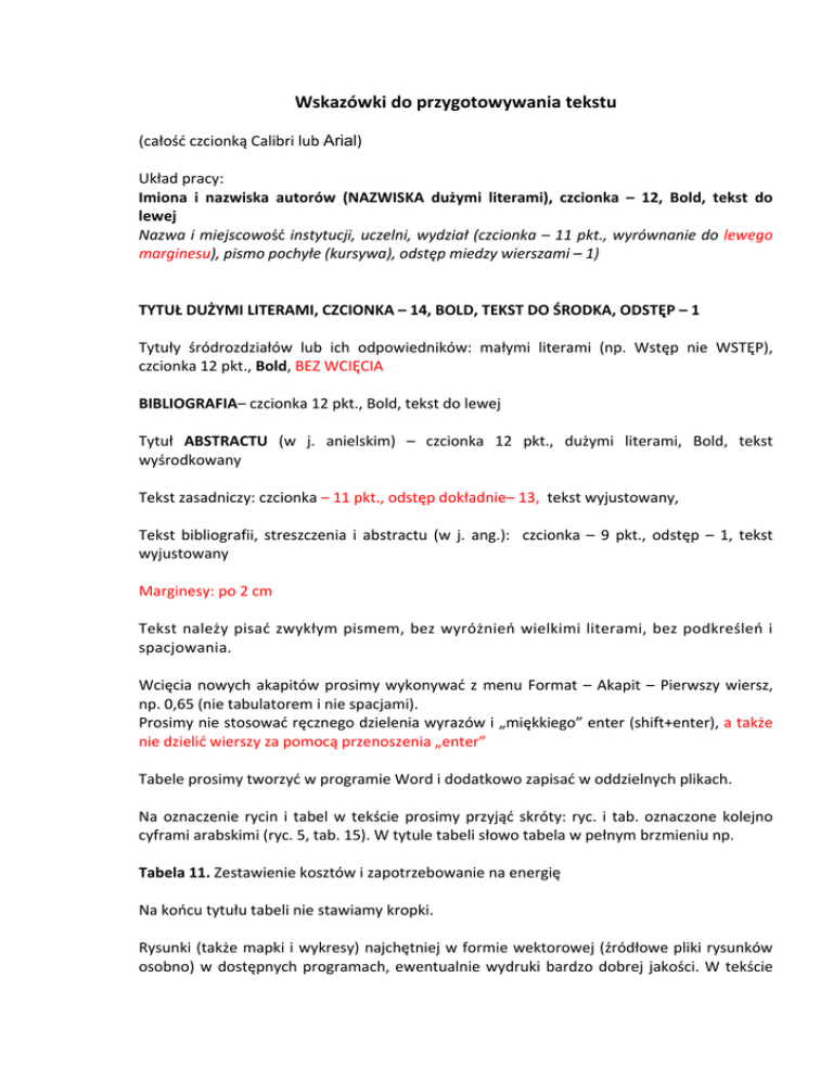 Wskazówki do przygotowywania tekstu (całość czcionką Calibri lub Arial) Układ pracy: Imiona i nazwiska autorów (NAZWISKA dużymi literami), czcionka – 12, Bold, tekst do lewej Nazwa i miejscowość instytucji, uczelni, wydział (czcionka – 11 pkt., wyrównanie do lewego marginesu), pismo pochyłe (kursywa), odstęp miedzy wierszami – 1) TYTUŁ DUŻYMI LITERAMI, CZCIONKA – 14, BOLD, TEKST DO ŚRODKA, ODSTĘP – 1 Tytuły śródrozdziałów lub ich odpowiedników: małymi literami (np. Wstęp nie WSTĘP), czcionka 12 pkt., Bold, BEZ WCIĘCIA BIBLIOGRAFIA– czcionka 12 pkt., Bold, tekst do lewej Tytuł ABSTRACTU (w j. anielskim) – czcionka 12 pkt., dużymi literami, Bold, tekst wyśrodkowany Tekst zasadniczy: czcionka – 11 pkt., odstęp dokładnie– 13, tekst wyjustowany, Tekst bibliografii, streszczenia i abstractu (w j. ang.): czcionka – 9 pkt., odstęp – 1, tekst wyjustowany Marginesy: po 2 cm Tekst należy pisać zwykłym pismem, bez wyróżnień wielkimi literami, bez podkreśleń i spacjowania. Wcięcia nowych akapitów prosimy wykonywać z menu Format – Akapit – Pierwszy wiersz, np. 0,65 (nie tabulatorem i nie spacjami). Prosimy nie stosować ręcznego dzielenia wyrazów i „miękkiego” enter (shift+enter), a także nie dzielić wierszy za pomocą przenoszenia „enter” Tabele prosimy tworzyć w programie Word i dodatkowo zapisać w oddzielnych plikach. Na oznaczenie rycin i tabel w tekście prosimy przyjąć skróty: ryc. i tab. oznaczone kolejno cyframi arabskimi (ryc. 5, tab. 15). W tytule tabeli słowo tabela w pełnym brzmieniu np. Tabela 11. Zestawienie kosztów i zapotrzebowanie na energię Na końcu tytułu tabeli nie stawiamy kropki. Rysunki (także mapki i wykresy) najchętniej w formie wektorowej (źródłowe pliki rysunków osobno) w dostępnych programach, ewentualnie wydruki bardzo dobrej jakości. W tekście prosimy podać podpisy (rysunków, wykresów lub fotografii) w miejscu, gdzie mają się znaleźć, np. Rys. 3.1. Rama portalowa Fot. 12. Modrzejów w lutym 2011 Fotografie prosimy zapisać dodatkowo w odrębnych plikach jako tiff 300 dpi lub wysokiej jakości jpg. W podpisach rysunków i fotografii nie stawiamy na końcu kropki. Wyrazy obcojęzyczne (np. angielskie, łacińskie) należy pisać kursywą. Jednostki prosimy pisać w układzie SI, jednostka zawsze odsunięta jedną spacją od cyfry np. 10 cm a nie 10cm, wyjątek stanowi %, który zawsze piszemy przy cyfrze np. 5% oraz stopień np. 50° C. Do znaków greckich itd. prosimy używać czcionki Symbol np. itp. W tekście należy cytować bibliografię, stosując numer, jaki cytowane źródło zajmuje w pozycji bibliograficznej; numer umieszczać w nawiasie kwadratowym, np. źródło o numerze 1 w pozycji bibliograficznej oznaczamy: [1], np.: [20] Marchwiński J., Zielonko-Jung K.: Współczesna architektura proekologiczna, PWN, Warszawa 2012 Tytuły pozycji cytowanych w bibliografii, kursywą (jw.). Spis bibliograficzny powinien być zestawiony w porządku alfabetycznym wg nazwisk autorów.