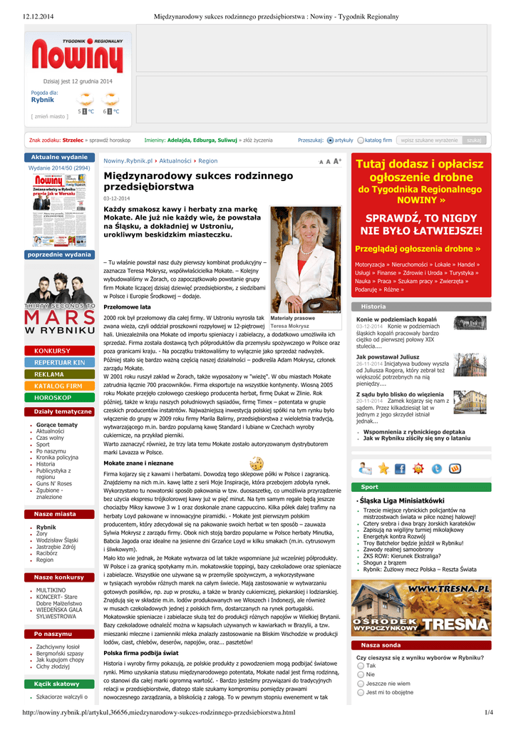 12.12.2014 Międzynarodowy sukces rodzinnego przedsiębiorstwa : Nowiny - Tygodnik Regionalny Dzisiaj jest 12 grudnia 2014 Pogoda dla: Rybnik [ zmień miasto ] 5 1 °C 6 1 °C Znak zodiaku: Strzelec » sprawdź horoskop Aktualne wydanie Wydanie 2014/50 (2994) Imieniny: Adelajda, Edburga, Suliwuj » złóż życzenia Nowiny.Rybnik.pl › Aktualności › Region Przeszukaj: artykuły Międzynarodowy sukces rodzinnego przedsiębiorstwa katalog firm Tutaj dodasz i opłacisz ogłoszenie drobne do Tygodnika Regionalnego NOWINY » 03122014 Każdy smakosz kawy i herbaty zna markę Mokate. Ale już nie każdy wie, że powstała na Śląsku, a dokładniej w Ustroniu, urokliwym beskidzkim miasteczku. – Tu właśnie powstał nasz duży pierwszy kombinat produkcyjny – zaznacza Teresa Mokrysz, współwłaścicielka Mokate. – Kolejny wybudowaliśmy w Żorach, co zapoczątkowało powstanie grupy firm Mokate liczącej dzisiaj dziewięć przedsiębiorstw, z siedzibami w Polsce i Europie Środkowej – dodaje. Przełomowe lata Gorące tematy Aktualności Czas wolny Sport Po naszymu Kronika policyjna Historia Publicystyka z regionu Guns N' Roses Zgubione znalezione Nasze miasta Rybnik Żory Wodzisław Śląski Jastrzębie Zdrój Racibórz Region Nasze konkursy MULTIKINO KONCERT Stare Dobre Małżeństwo WIEDEŃSKA GALA SYLWESTROWA Po naszymu Zachciywny łosioł Bergmoński szpasy Jak kupujom chopy Cichy złodziyj Kącik skatowy Szkaciorze walczyli o SPRAWDŹ, TO NIGDY NIE BYŁO ŁATWIEJSZE! Przeglądaj ogłoszenia drobne » poprzednie wydania Działy tematyczne wpisz szukane wyrażenie... szukaj 2000 rok był przełomowy dla całej firmy. W Ustroniu wyrosła tak Materiały prasowe zwana wieża, czyli oddział proszkowni rozpyłowej w 12piętrowej Teresa Mokrysz hali. Uniezależniła ona Mokate od importu spieniaczy i zabielaczy, a dodatkowo umożliwiła ich sprzedaż. Firma została dostawcą tych półproduktów dla przemysłu spożywczego w Polsce oraz poza granicami kraju. Na początku traktowaliśmy to wyłącznie jako sprzedaż nadwyżek. Później stało się bardzo ważną częścią naszej działalności – podkreśla Adam Mokrysz, członek zarządu Mokate. W 2001 roku ruszył zakład w Żorach, także wyposażony w "wieżę". W obu miastach Mokate zatrudnia łącznie 700 pracowników. Firma eksportuje na wszystkie kontynenty. Wiosną 2005 roku Mokate przejęło czołowego czeskiego producenta herbat, firmę Dukat w Zlinie. Rok później, także w kraju naszych południowych sąsiadów, firmę Timex – potentata w grupie czeskich producentów instatntów. Najważniejszą inwestycją polskiej spółki na tym rynku było włączenie do grupy w 2009 roku firmy Marila Balirny, przedsiębiorstwa z wieloletnia tradycją, wytwarzającego m.in. bardzo popularną kawę Standard i lubiane w Czechach wyroby cukiernicze, na przykład pierniki. Warto zaznaczyć również, że trzy lata temu Mokate zostało autoryzowanym dystrybutorem marki Lavazza w Polsce. Mokate znane i nieznane Motoryzacja » Nieruchomości » Lokale » Handel » Usługi » Finanse » Zdrowie i Uroda » Turystyka » Nauka » Praca » Szukam pracy » Zwierzęta » Podaruję » Różne » Historia Konie w podziemiach kopalń 03122014 Konie w podziemiach śląskich kopalń pracowały bardzo ciężko od pierwszej połowy XIX stulecia.... Jak powstawał Juliusz 26112014 Inicjatywa budowy wyszła od Juliusza Rogera, który zebrał też większość potrzebnych na nią pieniędzy.... Z sądu było blisko do więzienia 20112014 Zamek kojarzy się nam z sądem. Przez kilkadziesiąt lat w jednym z jego skrzydeł istniał jednak... Wspomnienia z rybnickiego deptaka Jak w Rybniku ziściły się sny o lataniu Firma kojarzy się z kawami i herbatami. Dowodzą tego sklepowe półki w Polsce i zagranicą. Znajdziemy na nich m.in. kawę latte z serii Moje Inspiracje, która przebojem zdobyła rynek. Wykorzystano tu nowatorski sposób pakowania w tzw. duosaszetkę, co umożliwia przyrządzenie bez użycia ekspresu trójkolorowej kawy już w pięć minut. Na tym samym regale będą jeszcze chociażby Miksy kawowe 3 w 1 oraz doskonale znane cappuccino. Kilka półek dalej trafimy na herbaty Loyd pakowane w innowacyjne piramidki. Mokate jest pierwszym polskim producentem, który zdecydował się na pakowanie swoich herbat w ten sposób – zauważa Sylwia Mokrysz z zarządu firmy. Obok nich stoją bardzo popularne w Polsce herbaty Minutka, Babcia Jagoda oraz idealne na jesienne dni Grzańce Loyd w kilku smakach (m.in. cytrusowym i śliwkowym). Mało kto wie jednak, że Mokate wytwarza od lat także wspomniane już wcześniej półprodukty. W Polsce i za granicą spotykamy m.in. mokatowskie toppingi, bazy czekoladowe oraz spieniacze i zabielacze. Wszystkie one używane są w przemyśle spożywczym, a wykorzystywane w tysiącach wyrobów różnych marek na całym świecie. Mają zastosowanie w wytwarzaniu gotowych posiłków, np. zup w proszku, a także w branży cukierniczej, piekarskiej i lodziarskiej. Znajdują się w składzie m.in. lodów produkowanych we Włoszech i Indonezji, ale również w musach czekoladowych jednej z polskich firm, dostarczanych na rynek portugalski. Mokatowskie spieniacze i zabielacze służą też do produkcji różnych napojów w Wielkiej Brytanii. Bazy czekoladowe odnaleźć można w kapsułach używanych w kawiarkach w Brazylii, a tzw. mieszanki mleczne i zamienniki mleka znalazły zastosowanie na Bliskim Wschodzie w produkcji lodów, ciast, chlebów, deserów, napojów, oraz... pasztetów! Polska firma podbija świat Historia i wyroby firmy pokazują, ze polskie produkty z powodzeniem mogą podbijać światowe rynki. Mimo uzyskania statusu międzynarodowego potentata, Mokate nadal jest firmą rodzinną, co stanowi dla całej marki ogromną wartość. Bardzo jesteśmy przywiązani do tradycyjnych relacji w przedsiębiorstwie, dlatego stale szukamy kompromisu pomiędzy prawami nowoczesnego zarządzania, a bliskością z zało