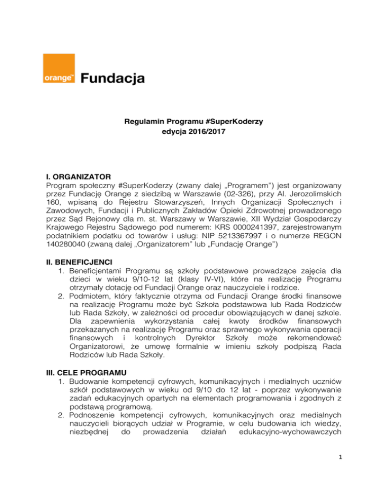 Regulamin Programu #SuperKoderzy edycja 2016/2017 I. ORGANIZATOR Program społeczny #SuperKoderzy (zwany dalej „Programem”) jest organizowany przez Fundację Orange z siedzibą w Warszawie (02-326), przy Al. Jerozolimskich 160, wpisaną do Rejestru Stowarzyszeń, Innych Organizacji Społecznych i Zawodowych, Fundacji i Publicznych Zakładów Opieki Zdrowotnej prowadzonego przez Sąd Rejonowy dla m. st. Warszawy w Warszawie, XII Wydział Gospodarczy Krajowego Rejestru Sądowego pod numerem: KRS 0000241397, zarejestrowanym podatnikiem podatku od towarów i usług: NIP 5213367997 i o numerze REGON 140280040 (zwaną dalej „Organizatorem” lub „Fundację Orange”) II. BENEFICJENCI 1. Beneficjentami Programu są szkoły podstawowe prowadzące zajęcia dla dzieci w wieku 9/10-12 lat (klasy IV-VI), które na realizację Programu otrzymały dotację od Fundacji Orange oraz nauczyciele i rodzice. 2. Podmiotem, który faktycznie otrzyma od Fundacji Orange środki finansowe na realizację Programu może być Szkoła podstawowa lub Rada Rodziców lub Rada Szkoły, w zależności od procedur obowiązujących w danej szkole. Dla zapewnienia wykorzystania całej kwoty środków finansowych przekazanych na realizację Programu oraz sprawnego wykonywania operacji finansowych i kontrolnych Dyrektor Szkoły może rekomendować Organizatorowi, że umowę formalnie w imieniu szkoły podpiszą Rada Rodziców lub Rada Szkoły. III. CELE PROGRAMU 1. Budowanie kompetencji cyfrowych, komunikacyjnych i medialnych uczniów szkół podstawowych w wieku od 9/10 do 12 lat - poprzez wykonywanie zadań edukacyjnych opartych na elementach programowania i zgodnych z podstawą programową. 2. Podnoszenie kompetencji cyfrowych, komunikacyjnych oraz medialnych nauczycieli biorących udział w Programie, w celu budowania ich wiedzy, niezbędnej do prowadzenia działań edukacyjno-wychowawczych 1 związanych z nowymi technologiami - poprzez dostęp do szkoleń i materiałów dydaktycznych. 3. Pogłębianie wiedzy przedmiotowej i interdyscyplinarnej oraz rozwijanie wśród uczniów umiejętności pracy zespołowej, poprzez wspólne wykonywanie zadań w ramach realizowanej ścieżki edukacyjnej wybranej przez szkołę z oferty przedstawionej przez Organizatora Programu. IV. WNIOSKODAWCY 1. Wnioskodawcami w Programie mogą być szkoły podstawowe oraz podmioty prowadzące jednostki edukacyjne mające siedzibę na terytorium Rzeczypospolitej Polskiej (zwana dalej „Szkołą”) 2. W danej edycji Programu Szkoła może złożyć tylko jeden wniosek. 3. Dyrektor Szkoły wskazuje Lidera projektu w danej szkole spośród nauczycieli, członków Rady Pedagogicznej oraz drugiego nauczyciela prowadzącego zajęcia z zakresu nauki informatyki, którego podstawowym zadaniem będzie udzielanie wsparcie Liderowi w pierwszej fazie projektu. 4. Lider projektu dokonuje zgłoszenia udziału Szkoły w Programie w formie elektronicznej, wybierając jedną ze ścieżek edukacyjnych oraz dołączając wszystkie niezbędne dokumenty. 5. Jeśli w imieniu Szkoły umowę podpisywać będzie przedstawiciel Rady Rodziców lub Rady Szkoły, dołącza się do zgłoszenia dokument potwierdzający wolę podpisania umowy przez Radę Rodziców lub Radę Szkoły. 6. Do Wniosku należy załączyć skan wypełnionego i podpisanego porozumienia, pomiędzy Dyrekcją a Radą Rodziców lub Radą Szkoły, którego zawarciem Organizator warunkuje pozytywne zakwalifikowanie Wniosku. 7. Lider projektu wypełnia: wniosek o udział Szkoły w Programie oraz ankietę, na podstawie której nastąpi kwalifikacja do udziału w Programie. 8. Jeśli w danej Szkole Lider projektu będzie chciał realizować wybraną ścieżkę z więcej niż jedną grupą uczniów, ma możliwość wielokrotnego wykonywania zadań. V. HARMONOGRAM PROGRAMU 1. Nabór wniosków do edycji 2016/2017 rozpocznie się 15 sierpnia 2016 r. i potrwa do 7 września 2016 r. 2. Termin składania wniosków przez szkoły upływa 7 września 2016 r. o godzinie 23:59 (decyduje data złożenia Wniosku w formie elektronicznej w systemie on-line) 3. Decyzja o zakwalifikowaniu do Programu i przyznaniu dotacji zostanie przekazana szkołom pocztą elektroniczną na adres e-mail podany we Wniosku najpóźniej do dnia 16 września 2016 r. 4. Ogłoszenie wyników na stronie www Organizatora nastąpi nie później niż do dnia 16 września 2016 r. Lider projektu i Dyrektor Szkoły zostaną powiadomieni o decyzji Organizatora drogą elektroniczną na adresy e-mail podane we wniosku zgłoszeniowym. 2 5. Przygotowanie umów dla Beneficjentów Programu nastąpi do dnia 30 września 2016 r. 6. Zasady korzystania i rozliczenia z otrzymanych środków finansowych są określone w Instrukcji Finansowej załączonej do Regulaminu. 7. Raport merytoryczny (wytworzony produkt) z realizacji wybranej ścieżki edukacyjnej należy złożyć poprzez panel on-line w terminie do dnia 17 marca 2017 r., chyba że zapisy umowy stanowić będą inaczej. 8. Po ogłoszeniu wyników kwalifikacji Lider projektu zakwalifikowany do udziału w Programie zobowiązany jest do przesłania oryginałów następujących dokumentów: podpisanego Wniosku zgłoszeniowego, dokumentu potwierdzającego zgodę Dyrektora Szkoły na udział szkoły w Programie oraz jeżeli będzie zachodzić taka potrzeba, oryginału porozumienia z Radą Rodziców / Radą Szkoły, regulującego zasady realizacji Programu z udziałem Rady Rodziców / Rady Szkoły ( na adres Monika Wrońska Fundacja Orange Al. Jerozolimskie 160 02-326 Warszawa). 9. Brak uzupełnienia zgłoszenia o wymagane oryginały dokumentów do dnia 23 września 2016 r. skutkować będzie nieprzyjęciem Szkoły do udziału w Programie i uzupełnieniem listy zakwalifikowanych Szkół, kolejnym zgłoszeniem z listy rezerwowej. 10. Rozpoczęcie działań merytorycznych w Programie w danej szkole nastąpi 3 października 2016 roku, a zakończenie najpóźniej 28 lutego 2017 roku. 11. W trosce o wysoką jakość 