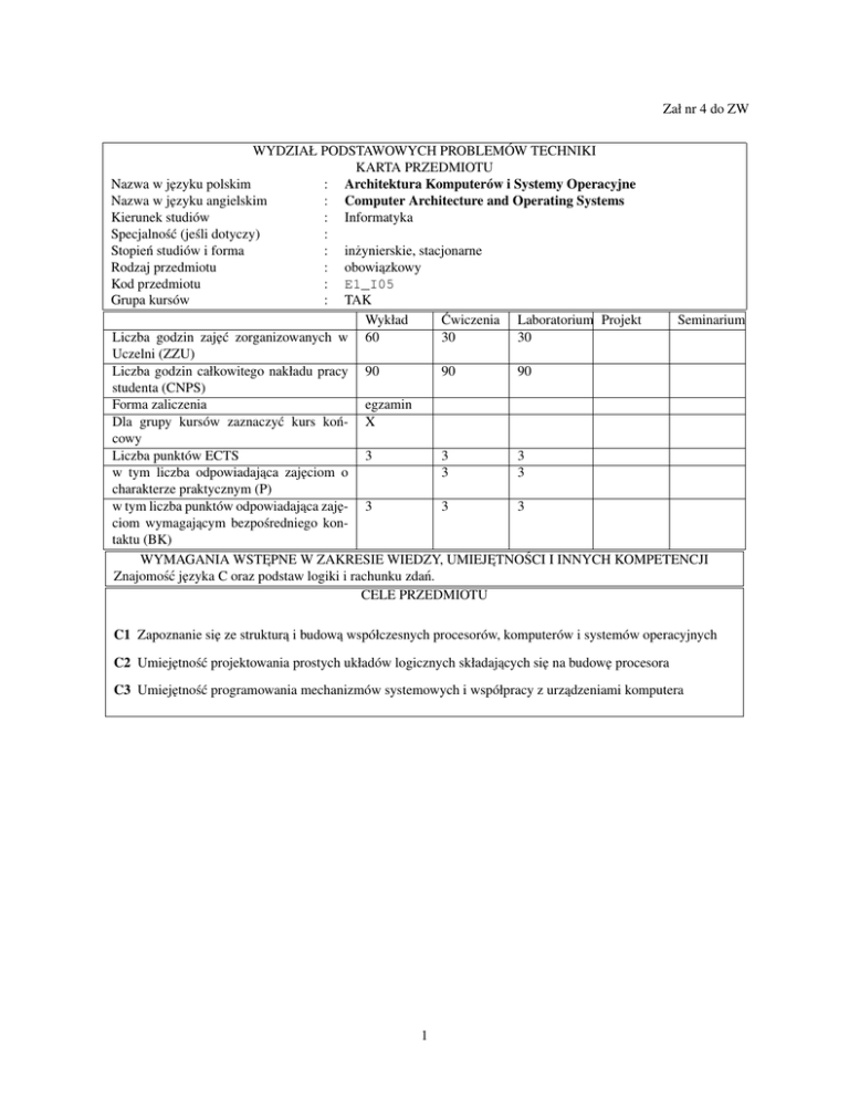 Zał nr 4 do ZW WYDZIAŁ PODSTAWOWYCH PROBLEMÓW TECHNIKI KARTA PRZEDMIOTU Nazwa w j˛ezyku polskim : Architektura Komputerów i Systemy Operacyjne Nazwa w j˛ezyku angielskim : Computer Architecture and Operating Systems Kierunek studiów : Informatyka Specjalność (jeśli dotyczy) : Stopień studiów i forma : inżynierskie, stacjonarne Rodzaj przedmiotu : obowiazkowy ˛ Kod przedmiotu : E1_I05 Grupa kursów : TAK Ćwiczenia Laboratorium Projekt Wykład Seminarium Liczba godzin zaj˛eć zorganizowanych w 60 30 30 Uczelni (ZZU) Liczba godzin całkowitego nakładu pracy 90 90 90 studenta (CNPS) Forma zaliczenia egzamin Dla grupy kursów zaznaczyć kurs koń- X cowy Liczba punktów ECTS 3 3 3 w tym liczba odpowiadajaca ˛ zaj˛eciom o 3 3 charakterze praktycznym (P) w tym liczba punktów odpowiadajaca ˛ zaj˛e- 3 3 3 ciom wymagajacym ˛ bezpośredniego kontaktu (BK) WYMAGANIA WSTEPNE ˛ W ZAKRESIE WIEDZY, UMIEJETNO ˛ ŚCI I INNYCH KOMPETENCJI Znajomość j˛ezyka C oraz podstaw logiki i rachunku zdań. CELE PRZEDMIOTU C1 Zapoznanie si˛e ze struktura˛ i budowa˛ współczesnych procesorów, komputerów i systemów operacyjnych C2 Umiej˛etność projektowania prostych układów logicznych składajacych ˛ si˛e na budow˛e procesora C3 Umiej˛etność programowania mechanizmów systemowych i współpracy z urzadzeniami ˛ komputera 1 PRZEDMIOTOWE EFEKTY KSZTAŁCENIA Z zakresu wiedzy studenta: W1 Zna podstawowe architektury komputerów W2 Zna podstawowe zasady działania układów logicznych komputera W3 Zna podstawowe zadania systemów operacyjnych W4 Zna struktur˛e pami˛eci komputerów i sposoby zarzadzania ˛ nia˛ W5 Zna struktur˛e stosowanych systemów plików W6 Zna podstawowe problemy zwiazane ˛ ze współbieżnościa˛ procesów i ich synchronizacja˛ Z zakresu umiej˛etności studenta: U1 Umie projektować proste układy logiczne i cyfrowe U2 Umie zainstalować i obsłużyć z poziomu konsoli system operacyjny U3 Potrafi opracować i zaimplementować skrypty wykorzystujace ˛ programy systemowe U4 Potrafi wykorzystać mechanizmy systemu operacyjnego w implementacjach w j˛ezykach wysokiego poziomu U5 Potrafi za pomoca˛ programów systemowych zdiagnozować działanie komputera i naprawić system plików Z zakresu kompetencji społecznych studenta: K1 Potrafi w sposób zrozumiały wytłumaczyć budow˛e i zasad˛e działania komputera K2 Potrafi zrozumieć i wytłumaczyć działanie systemu operacyjnego komputera K3 Potrafi zdiagnozować działanie systemu operacyjnego na komputerze K4 Potrafi wytłumaczyć działanie systemów plików i niebezpieczeństwa zwiazane ˛ z bł˛edami w tych systemach TREŚCI PROGRAMOWE 2 Wy1 Wy2 Wy3 Wy4 Wy5 Wy6 Wy7 Wy8 Wy9 Wy10 Wy11 Wy12 Wy13 Wy14 Wy15 Wy16 Wy17 Wy18 Ćw1 Ćw2 Ćw3 Ćw4 Ćw5 Ćw6 Ćw7 Lab1 Lab2 Lab3 Lab4 Lab5 Lab6 Lab7 Lab8 Lab9 Forma zaj˛eć - wykłady Historia obliczeń i architektur komputerowych Reprezentacja danych Budowa procesora, modele CISC i RISC Mikroprogramowanie Struktura potokowa, problemy synchronizacji Modele i struktura pami˛eci, poziomy pami˛eci, pami˛eć wirtualna Komputery wektorowe Procesory wielowatkowe ˛ Maszyny wirtualne Podstawy organizacji wejścia i wyjścia, obsługa urzadzeń ˛ zewn˛etrznych Zadania systemów operacyjnych Procesy i watki, ˛ zakleszczenia Przydział zasobów, buforowanie i synchronizacja Zarzadzanie ˛ pami˛ecia˛ Systemy plików, warstwa logiczna i fizyczna Współbieżność i synchronizacja procesów, przeciwdziałanie zakleszczeniu Sieci komputerowe - protokoły DNS, IP, UDP i TCP Podsumowanie wykładu Forma zaj˛eć - ćwiczenia Układy logiczne Minimalizacja funkcji boolowskich metoda˛ tablic Karnaugha Dekompozycja funkcji boolowskich Układy synchroniczne Minimalizacja liczby stanów automatu Układy asynchroniczne Projektowanie układów cyfrowych Forma zaj˛eć - laboratorium Instalacja systemu operacyjnego, obsługa plików z poziomu konsoli Obsługa procesów w systemie Filtry, strumienie i przetwarzanie potokowe Tworzenie skryptów powłoki systemu operacyjnego Obsługa plików z poziomu j˛ezyka C Obsługa procesów z poziomu j˛ezyka C Obsługa potoków z poziomu j˛ezyka C Tworzenie i obsługa watków ˛ z poziomu j˛ezyka C Komunikacja mi˛edzyprocesorowa w j˛ezyku C: komunikaty, pami˛eć współdzielona, semafory STOSOWANE NARZEDZIA ˛ DYDAKTYCZNE 1. Wykład tradycyjny 2. Wykład multimedialny 3. Rozwiazywanie ˛ zadań i problemów 4. Rozwiazywanie ˛ zadań programistycznych 5. Konsultacje 6. Praca własna studentów 3 2h 2h 4h 2h 4h 4h 2h 2h 2h 4h 2h 4h 6h 4h 6h 4h 4h 2h 4h 4h 4h 4h 4h 4h 6h 4h 2h 2h 4h 2h 4h 2h 4h 6h OCENA OSIAGNI ˛ ECIA ˛ PRZEDMIOTOWYCH EFEKTÓW KSZTAŁCENIA Oceny F1 F2 Numer efektu kształcenia W1-W6, K1-K4 U1-U5, K1-K4 Sposób oceny efektu kształcenia Egzamin pisemny Kartkówki, aktywność przy rozwiazywaniu ˛ problemów Odbiór zadań programistycznych F3 U1-U5, K1-K4 P=40%*F1+30%*F2+30%*F3 LITERATURA PODSTAWOWA I UZUPEŁNIAJACA ˛ 1. D. Patterson, J. Hennessy, Computer Organization and design, Elsevier 2005 2. A. Silberschatz, J.L. Peterson, G. Gagne, Podstawy systemów operacyjnych. WNT, Warszawa 2005. 3. A. S. Tanenbaum, Modern Operating Systems. wydanie 2, Prentice-Hall Inc., 2001 4. W. R. Stevens, Programowania w środowisku systemu UNIX. WNT, Warszawa 2002 5. L. Bic, A. C. Shaw, The Logical Design of Operating Systems. Prentice-Hall Inc., 1988 6. Hennessy, J. L., and D. A. Patterson. Computer Architecture: A Quantitative Approach, 3rd ed. San Mateo, CA: Morgan Kaufman, 2002 OPIEKUN PRZEDMIOTU dr Maciej G˛ebala 4 MACIERZ POWIAZANIA ˛ EFEKTÓW KSZTAŁCENIA DLA PRZEDMIOTU Architektura Komputerów i Systemy Operacyjne Z EFEKTAMI KSZTAŁCENIA NA KIERUNKU INFORMATYKA Przedmiotowy Odniesienie przedmiotowego efektu do Cele przed- Treści proefekt ksz- efektów kształcenia zdefiniowanych dla miotu** gramowe** tałcenia kierunku studiów i specjalności (o ile dotyczy) W1 K1_W02 K1_W13 C1 Wy1-Wy18 W2 K1_W02 K1_W09 K1_W13 C1 W