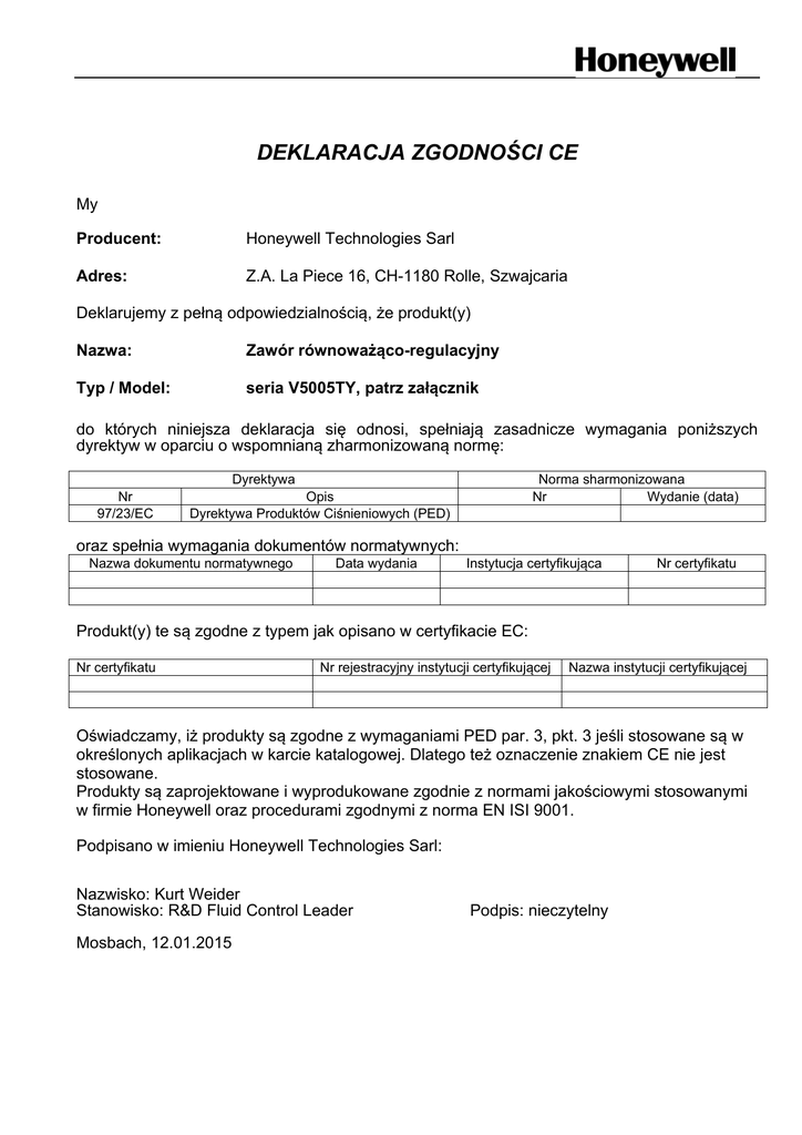 DEKLARACJA ZGODNOŚCI CE My Producent: Honeywell Technologies Sarl Adres: Z.A. La Piece 16, CH-1180 Rolle, Szwajcaria Deklarujemy z pełną odpowiedzialnością, że produkt(y) Nazwa: Zawór równoważąco-regulacyjny Typ / Model: seria V5005TY, patrz załącznik do których niniejsza deklaracja się odnosi, spełniają zasadnicze wymagania poniższych dyrektyw w oparciu o wspomnianą zharmonizowaną normę: Dyrektywa Nr 97/23/EC Norma sharmonizowana Nr Wydanie (data) Opis Dyrektywa Produktów Ciśnieniowych (PED) oraz spełnia wymagania dokumentów normatywnych: Nazwa dokumentu normatywnego Data wydania Instytucja certyfikująca Nr certyfikatu Produkt(y) te są zgodne z typem jak opisano w certyfikacie EC: Nr certyfikatu Nr rejestracyjny instytucji certyfikującej Nazwa instytucji certyfikującej Oświadczamy, iż produkty są zgodne z wymaganiami PED par. 3, pkt. 3 jeśli stosowane są w określonych aplikacjach w karcie katalogowej. Dlatego też oznaczenie znakiem CE nie jest stosowane. Produkty są zaprojektowane i wyprodukowane zgodnie z normami jakościowymi stosowanymi w firmie Honeywell oraz procedurami zgodnymi z norma EN ISI 9001. Podpisano w imieniu Honeywell Technologies Sarl: Nazwisko: Kurt Weider Stanowisko: R&D Fluid Control Leader Mosbach, 12.01.2015 Podpis: nieczytelny Załącznik Nr katalogowy Opis DN PN Diagram Załącznik II Kategoria V5004TY10150150 Zawór liniowy Kombi-QM z gwintem wewnętrznym DN15 25 7 Art. 3 par. 3 V5004TY10150600 Zawór liniowy Kombi-QM z gwintem wewnętrznym DN15 25 7 Art. 3 par. 3 V5004TY10150780 Zawór liniowy Kombi-QM z gwintem wewnętrznym DN15 25 7 Art. 3 par. 3 V5004TY10201000 Zawór liniowy Kombi-QM z gwintem wewnętrznym DN20 25 7 Art. 3 par. 3 V5004TY10201500 Zawór liniowy Kombi-QM z gwintem wewnętrznym DN20 25 7 Art. 3 par. 3 V5004TY10251500 Zawór liniowy Kombi-QM z gwintem wewnętrznym DN25 25 7 Art. 3 par. 3 V5004TY10202200 Zawór liniowy Kombi-QM z gwintem wewnętrznym DN20 25 7 Art. 3 par. 3 V5004TY10202700 Zawór liniowy Kombi-QM z gwintem wewnętrznym DN20 25 7 Art. 3 par. 3 V5004TY10252200 Zawór liniowy Kombi-QM z gwintem wewnętrznym DN25 25 7 Art. 3 par. 3 V5004TY10252700 Zawór liniowy Kombi-QM z gwintem wewnętrznym DN25 25 7 Art. 3 par. 3 V5004TY10322700 Zawór liniowy Kombi-QM z gwintem wewnętrznym DN32 25 7 Art. 3 par. 3 V5004TY10323000 Zawór liniowy Kombi-QM z gwintem wewnętrznym DN32 25 7 Art. 3 par. 3 Koniec tabeli strona 2