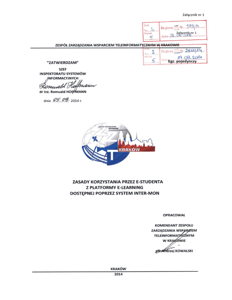 Załącznik nr 1 §1 POSTANOWIENIA OGÓLNE 1. Platforma ma za zadanie: 1.1. Wspieranie procesów edukacyjnych, naukowych i badawczych w SZ RP. 1.2. Pozyskiwanie, współdzielenie i przekazywanie wiedzy, kompetencji oraz umiejętności. 2. Wiedza zamieszczona w szkoleniu na Platformie nie stanowi wykładni prawnej w działalności bieżącej. Autorzy szkoleń, a także wszelkich informacji publikowanych na Platformie i jej zasobach mają obowiązek dołożyć wszelkich starań aby treści w nich zawarte były zgodne z obowiązującymi przepisami prawa. Podane informacje (wiedza) nie stanowią jednak źródła prawa, urzędowej interpretacji, wykładni przepisów prawa w działalności bieżącej, a także nie są oficjalnym stanowiskiem właściwych organów lub władz. Przedstawiane w ramach szkoleń i prezentacji treści i materiały stanowią tylko i wyłącznie indywidualną interpretację autora w zakresie zagadnień prezentowanych na Platformie. 3. Platforma dostępna jest dla uprawnionych osób w sposób ciągły 24/7 (24 godz. na dobę, 7 dni w tygodniu) poprzez INTER-MON z wyłączeniem okresów niezbędnych na przeprowadzenie prac modernizacyjnych lub z wyłączeniem okresów awarii. Platforma dostępna jest pod adresem internetowym elearning.wp.mil.pl. 4. Korzystanie z Platformy wymaga posiadania przez użytkownika aktywnego adresu poczty elektronicznej w domenie: wp.mil.pl, mon.gov.pl, sp.mil.pl, mw.mil.pl lub aon.edu.pl. 5. E-student jest zobowiązany zapoznać się oraz zaakceptować „Zasady korzystania przez e-studenta z Platformy e-learning dostępnej poprzez system INTER-MON”, oraz wszelkie zmiany do obowiązujących Zasad. 6. W przypadku nie zaakceptowania niniejszych Zasad lub wprowadzonych do nich zmian lub też stwierdzenia naruszenia Zasad przez e-studenta Administrator lub Zespół ma prawo zablokować lub trwale usunąć jego konto z Platformy. 7. Korzystanie ze szkoleń, zasobów i Platformy jest nieodpłatne. 8. Słowniczek: Zespół - odpowiadający za funkcjonowanie i obsługę Platformy jest Zespół Zarządzania Wsparciem Teleinformatycznym w Krakowie, ul. Rakowicka 29, 31-901 Kraków. Platforma - system informatyczny typu LMS (ang. Learning Management System), funkcjonujący w domenie elearning.ron.int dostępny po zalogowaniu się użytkownika, przeznaczony do nauki online, udostępniający szkolenia (lekcje, wykłady, prezentacje multimedialne, testy itp.) i zasoby, rejestrujący postępy w szkoleniach i zapewniający możliwości współpracy i wymiany wiedzy. Właścicielem Platformy e-learning są Siły Zbrojne Rzeczpospolitej Polskiej. Administrator - osoba będąca pracownikiem Zespołu odpowiedzialna za sprawne działanie Platformy. E-student - osoba (słuchacz, uczestnik szkolenia) posiadająca konto na Platformie, zapisana na zajęcia/szkolenia. str. 2 E-nauczyciel - wyznaczona rozkazem lub decyzją dowódcy, (szefa komendanta) jednostki wojskowej (instytucji) osoba posiadająca konto na Platformie i posiadająca uprawnienia na prowadzenie na niej zajęć/szkoleń. §2 PRAWA I OBOWIĄZKI E-STUDENTA 1. Każdy e-student ma prawo do: 1.1. Korzystania z materiałów i pomocy dydaktycznych publikowanych na Platformie. Ograniczeniem w dostępie mogą być materiały szkoleniowe adresowane do wybranej grupy e-studentów. 1.2. Wsparcia ze strony e-nauczycieli oraz Zespołu odpowiedzialnego za utrzymanie Platformy w zakresie związanym z procesem dydaktycznym realizowanym z wykorzystaniem metod i technik kształcenia na odległość, jeśli takie wsparcie jest przewidziane dla danego kursu. 1.3. Korzystania z e-konsultacji, jeśli takie są przewidziane dla danego kursu. 1.4. Swobodnego korzystania z serwisów udostępnianych konkretnemu e-studentowi na Platformie. 2. Obowiązkiem e-studenta korzystającego z Platformy jest: 2.1. Korzystanie z Platformy zgodnie z obowiązującym prawem, normami społecznymi i obyczajowymi oraz zapisami niniejszych Zasad. 2.2. Przestrzeganie Zasad udziału w zajęciach prowadzonych przy wykorzystaniu metod i technik kształcenia na odległość. Zasady te ustalane są przez e-nauczyciela prowadzącego zajęcia w oparciu o przyjęte normy kształcenia w SZ RP. 2.3. Zgłaszanie e-nauczycielowi prowadzącemu zajęcia lub Zespołowi odpowiedzialnemu za utrzymanie Platformy wszelkich nieprawidłowości (proceduralnych, merytorycznych, technicznych). 2.4. Ochrona swojego loginu i hasła. 2.5. Podanie w formularzu i swoim profilu na Platformie prawdziwych danych. 3. E-student nie ma prawa: 3.1. Korzystać z zasobów Platformy, jeśli nie są one dla niego udostępnione. 3.2. Przenieść praw i obowiązków wynikających z udziału w Platformie na osoby trzecie. 3.3. Umożliwiać lub ułatwiać swoimi działaniami osobom nieupoważnionym dostęp do materiałów dydaktycznych i danych osobowych. 4. Zabrania się wykorzystywania Platformy w sposób odbiegający od jej przeznaczenia, a w szczególności: 4.1. W sposób naruszający dobre imię SZ RP. 4.2. W sposób naruszający prawa autorskie. 4.3. W wypowiedziach nie wolno używać treści nieprzyzwoitych, obscenicznych wulgarnych i obraźliwych (art. 141 Kodeksu Wykroczeń). 4.4. Nadużywać środków komunikacji elektronicznej w sposób powodujący utratę stabilności pracy lub przeciążenie systemów informatycznych. 4.5. Formułowania wypowiedzi naruszających dobra osobiste. 4.6. Umieszczania komercyjnych reklam, ogłoszeń i ofert marketingowych. 4.7. Publikowania treści niezwiązanych ze szkoleniami, w szczególności agitacji politycznych i religijnych. 4.8. Używać loginu jako wyrażenie powszechnie uznane za obraźliwe lub niezgodne z dobrymi obyczajami. str. 3 5. Użytkownik zgłasza wszelkie nieprawidłowości związane z działaniem Platformy za pośrednictwem Serwisu Pomocy Technicznej SPT HELPdesk, dzwoniąc do CallCenter lub bezpośrednio do Administratora Platformy na adres podany na stronie Platformy. 6. Zespół nie gwarantuje, że oprogramowanie i treści 