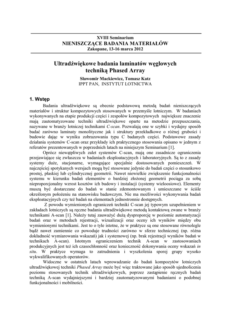XVIII Seminarium NIENISZCZĄCE BADANIA MATERIAŁÓW Zakopane, 13-16 marca 2012 Ultradźwiękowe badania laminatów węglowych techniką Phased Array Sławomir Mackiewicz, Tomasz Katz IPPT PAN, INSTYTUT LOTNICTWA 1. Wstęp Badania ultradźwiękowe są obecnie podstawową metodą badań nieniszczących materiałów i struktur kompozytowych stosowanych w przemyśle lotniczym. W badaniach wykonywanych na etapie produkcji części i zespołów kompozytowych największe znaczenie mają zautomatyzowane techniki ultradźwiękowe oparte na metodzie przepuszczania, nazywane w branży lotniczej technikami C-scan. Pozwalają one w szybki i wydajny sposób badać zarówno laminaty monolityczne jak i struktury przekładkowe o różnej grubości i budowie dając w wyniku zobrazowania typu C badanych części. Podstawowe zasady działania systemów C-scan oraz przykłady ich praktycznego stosowania opisano w jednym z referatów prezentowanych w poprzednich latach na niniejszym Seminarium [1]. Oprócz niewątpliwych zalet systemów C-scan, mają one zasadnicze ograniczenia przejawiające się zwłaszcza w badaniach eksploatacyjnych i laboratoryjnych. Są to z zasady systemy duże, stacjonarne, wymagające specjalnie dostosowanych pomieszczeń. W najczęściej spotykanych wersjach mogą być stosowane jedynie do badań części o stosunkowo prostej, płaskiej lub cylindrycznej geometrii. Nawet niewielkie zwiększenie funkcjonalności systemu w kierunku badań elementów o bardziej złożonej geometrii pociąga za sobą nieproporcjonalny wzrost kosztów ich budowy i instalacji (systemy wieloosiowe). Elementy muszą być dostarczane do badań w stanie zdemontowanym i umieszczane w ściśle określonym położeniu na stanowisku badawczym. Nie ma możliwości wykonywania badań eksploatacyjnych czy też badań na elementach jednostronnie dostępnych. Z powodu wymienionych ograniczeń techniki C-scan jej typowym uzupełnieniem w zakładach lotniczych są ręczne badania ultradźwiękowe metodą kontaktową zwane w branży technikami A-scan [1]. Należy tutaj zauważyć dużą dysproporcję w poziomie automatyzacji badań oraz w metodach rejestracji, wizualizacji oraz oceny ich wyników między obu wymienionymi technikami. Jest to o tyle istotne, że w praktyce są one stosowane równolegle bądź nawet zamiennie co powoduje trudności zarówno w sferze technicznej (np. różna dokładność wymiarowania wskazań) jak i systemowej (np. brak rejestracji wyników badań w technikach A-scan). Istotnym ograniczeniem technik A-scan w zastosowaniach produkcyjnych jest też ich czasochłonność oraz konieczność dokonywania oceny wskazań in situ. W praktyce wymaga to zatrudnienia i wyszkolenia sporej grupy wysoko wykwalifikowanych operatorów. Widoczne w ostatnich latach wprowadzanie do badań kompozytów lotniczych ultradźwiękowej techniki Phased Array może być więc traktowane jako sposób ujednolicenia poziomu stosowanych technik ultradźwiękowych, poprzez zastąpienie ręcznych badań techniką A-scan wydajniejszymi i bardziej zautomatyzowanymi badaniami o podobnej funkcjonalności i mobilności. Podstawy techniki Phased Array oraz jej typowe zastosowania były dość szeroko omawiane na poprzednich Seminariach Badań Nieniszczących w Zakopanem. W szczególności w referatach [2,3] omówiono budowę głowic wieloprzetwornikowych oraz podstawowe zasady kształtowania wiązki ultradźwiękowej poprzez stosowanie odpowiednich praw opóźnień do pobudzania elementów piezoelektrycznych głowicy. W pracy [4] przeprowadzono kompleksowy przegląd dostępnej na rynku aparatury wskazując kluczowe parametry systemów decydujące o ich funkcjonalności i przydatności systemów Phased Array do określonych zastosowań. W pracy [5] przedstawiono pogłębione podstawy fizyczne kształtowania wiązek ultradźwiękowych za pomocą głowic wieloprzetwornikowych uwypuklając zjawiska, które nie występują w przypadku konwencjonalnych głowic ultradźwiękowych. W szczególności omówiono efekt emisji wiązek bocznych (nie mylić z listkami bocznymi) oraz zależność parametrów wiązki ultradźwiękowej od liczby i odległości elementów piezoelektrycznych w głowicy. Ważnym aspektem tej pracy było też przybliżenie praktykom badań nieniszczących szeregu pojęć i określeń związanych z techniką phased array (głowice fazowe, szyki liniowe, profile opóźnień, wiązki boczne, skanowanie elektroniczne, ogniskowanie dynamiczne), które zostały wypracowane głównie na gruncie ultrasonografii medycznej, ale mogą być przeniesione także do badań nieniszczących. W publikacjach [6,7] pokazano przykłady zastosowania techniki PA do badań materiałów kompozytowych. W niniejszym artykule nie powtarzano po raz kolejny znanych już podstaw techniki Phased Array, koncentrując się na bardziej szczegółowym i pogłębionym opisaniu metodyki stosowania tej metody do badań laminatów węglowych stosowanych w przemyśle lotniczym. Opisane problemy zilustrowano przykładowymi wynikami badań kompozytów węglowych uzyskanymi w Instytucie Lotnictwa w ramach realizacji projektu badawczego TEBUK. 2. Sposoby wytwarzania i typowe wady laminatów węglowych Laminaty węglowe stosowane w przemyśle lotniczym CFRP (Carbon Fibre Reinforced Polymers) są to dwuskładnikowe kompozyty złożone z żywicy epoksydowej stanowiącej osnowę oraz włókien węglowych nadających kompozytowi wytrzymałość i sztywność. Określenie laminat oznacza, że jest to kompozyt mający strukturę laminarną, czyli składa się z szeregu połączonych ze sobą cienkich warstw - lamin o identycznych lub zbliżonych właściwościach. Poszczególne warstwy laminatu zawierają zespoły włókien węglowych, które mogą być ułożone jednokierunkowo, tzw. roving lub też mieć postać tkaniny z przeplotem. Grubość pojedynczych włókien węglowych wynosi zaledwie kilka µm, natomiast grubość warstw laminatu jest rzędu dziesiątych czę