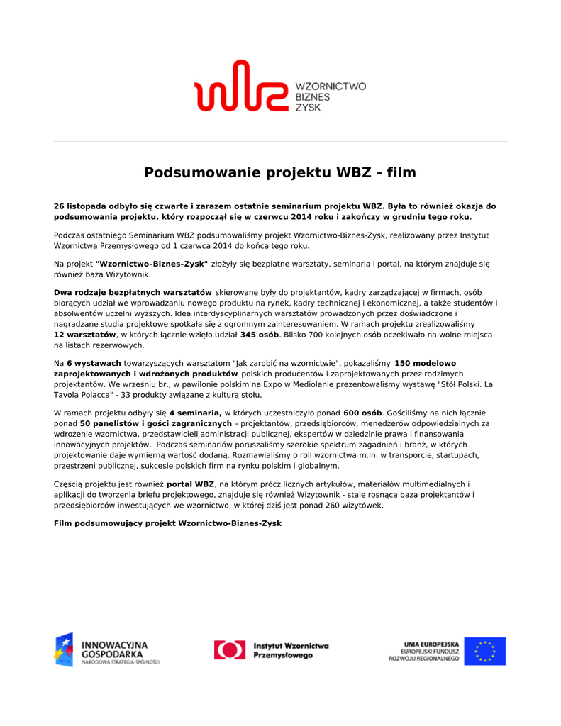 Podsumowanie projektu WBZ - film 26 listopada odbyło się czwarte i zarazem ostatnie seminarium projektu WBZ. Była to również okazja do podsumowania projektu, który rozpoczął się w czerwcu 2014 roku i zakończy w grudniu tego roku. Podczas ostatniego Seminarium WBZ podsumowaliśmy projekt Wzornictwo-Biznes-Zysk, realizowany przez Instytut Wzornictwa Przemysłowego od 1 czerwca 2014 do końca tego roku. Na projekt "Wzornictwo–Biznes–Zysk" złożyły się bezpłatne warsztaty, seminaria i portal, na którym znajduje się również baza Wizytownik. Dwa rodzaje bezpłatnych warsztatów skierowane były do projektantów, kadry zarządzającej w firmach, osób biorących udział we wprowadzaniu nowego produktu na rynek, kadry technicznej i ekonomicznej, a także studentów i absolwentów uczelni wyższych. Idea interdyscyplinarnych warsztatów prowadzonych przez doświadczone i nagradzane studia projektowe spotkała się z ogromnym zainteresowaniem. W ramach projektu zrealizowaliśmy 12 warsztatów, w których łącznie wzięło udział 345 osób. Blisko 700 kolejnych osób oczekiwało na wolne miejsca na listach rezerwowych. Na 6 wystawach towarzyszących warsztatom "Jak zarobić na wzornictwie", pokazaliśmy 150 modelowo zaprojektowanych i wdrożonych produktów polskich producentów i zaprojektowanych przez rodzimych projektantów. We wrześniu br., w pawilonie polskim na Expo w Mediolanie prezentowaliśmy wystawę "Stół Polski. La Tavola Polacca" - 33 produkty związane z kulturą stołu. W ramach projektu odbyły się 4 seminaria, w których uczestniczyło ponad 600 osób. Gościliśmy na nich łącznie ponad 50 panelistów i gości zagranicznych - projektantów, przedsiębiorców, menedżerów odpowiedzialnych za wdrożenie wzornictwa, przedstawicieli administracji publicznej, ekspertów w dziedzinie prawa i finansowania innowacyjnych projektów. Podczas seminariów poruszaliśmy szerokie spektrum zagadnień i branż, w których projektowanie daje wymierną wartość dodaną. Rozmawialiśmy o roli wzornictwa m.in. w transporcie, startupach, przestrzeni publicznej, sukcesie polskich firm na rynku polskim i globalnym. Częścią projektu jest również portal WBZ, na którym prócz licznych artykułów, materiałów multimedialnych i aplikacji do tworzenia briefu projektowego, znajduje się również Wizytownik - stale rosnąca baza projektantów i przedsiębiorców inwestujących we wzornictwo, w której dziś jest ponad 260 wizytówek. Film podsumowujący projekt Wzornictwo-Biznes-Zysk