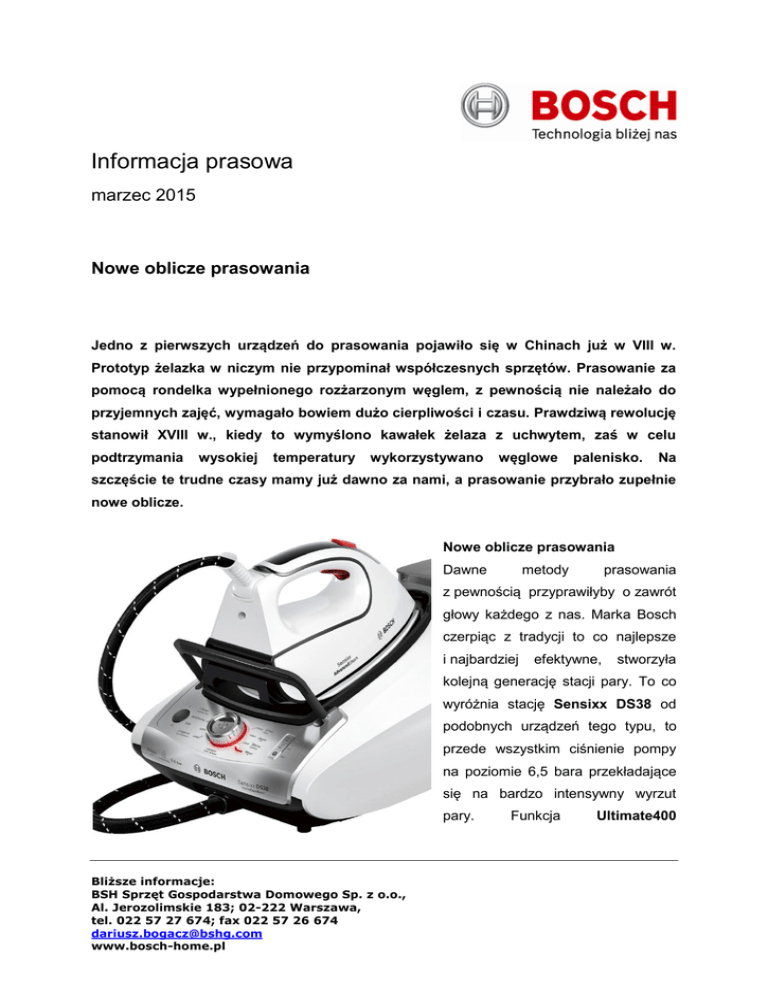 Informacja prasowa marzec 2015 Nowe oblicze prasowania Jedno z pierwszych urządzeń do prasowania pojawiło się w Chinach już w VIII w. Prototyp żelazka w niczym nie przypominał współczesnych sprzętów. Prasowanie za pomocą rondelka wypełnionego rozżarzonym węglem, z pewnością nie należało do przyjemnych zajęć, wymagało bowiem dużo cierpliwości i czasu. Prawdziwą rewolucję stanowił XVIII w., kiedy to wymyślono kawałek żelaza z uchwytem, zaś w celu podtrzymania wysokiej temperatury wykorzystywano węglowe palenisko. Na szczęście te trudne czasy mamy już dawno za nami, a prasowanie przybrało zupełnie nowe oblicze. Nowe oblicze prasowania Dawne metody prasowania z pewnością przyprawiłyby o zawrót głowy każdego z nas. Marka Bosch czerpiąc z tradycji to co najlepsze i najbardziej efektywne, stworzyła kolejną generację stacji pary. To co wyróżnia stację Sensixx DS38 od podobnych urządzeń tego typu, to przede wszystkim ciśnienie pompy na poziomie 6,5 bara przekładające się na bardzo intensywny wyrzut pary. Bliższe informacje: BSH Sprzęt Gospodarstwa Domowego Sp. z o.o., Al. Jerozolimskie 183; 02-222 Warszawa, tel. 022 57 27 674; fax 022 57 26 674 [email protected] www.bosch-home.pl Funkcja Ultimate400 PulseSteam gwarantuje trzykrotnie większy wyrzut pary, w stosunku do tradycyjnego żelazka, znacząco skraca czas prasowania, ale także pozwala na uzyskanie niemal pedantycznego/idealnego efektu prasowania. Trzy intensywne uderzenia pary aż do 400 g, umożliwiają odświeżenie ubrań w pionie lub wygładzenie zagnieceń na zawieszonych już zasłonach. Wydobywająca się pod dużym ciśnieniem para znacznie lepiej zmiękcza i rozprostowuje włókna tkanin, a przez to szybciej i łatwiej uzyskuje się zamierzony efekt. Oznacza to, że wyjątkowo szybko uprasujemy również grube materiały takie jak np. len czy jeans. Z kolei funkcja AntiShine pomaga uniknąć wybłyszczenia ubrań, stwarzając optymalne warunki do prasowania ciemnych tkanin. Jest również bezpieczna dla różnego typu nadruków, dzięki temu nasz ulubiony T-Shirt nie ulegnie zniszczeniu podczas prasowania. Funkcja, na która z pewnością zwrócimy uwagę to i-Temp Advanced, wystarczy tylko włączyć urządzenie i można rozpocząć prasowanie bez konieczności regulacji ustawień. rządzenie samo ustawi optymalne parametry. zięki temu możemy bezpiecznie prasować grube tkaniny, a zaraz po nich delikatne materiały. Istnieje również możliwość zmiany automatycznych parametrów i wprowadzanie własnych, indywidualnych ustawień, najbardziej odpowiadających użytkownikowi. Stacja pary w obsłudze jest i bardzo pielęgnacji. prosta System oczyszczania z kamienia Calc'nClean Perfect, działa zarówno dla zbiornika z wodą jak i samego żelazka. zięki temu rozwiązaniu, nie musimy się więcej martwić białymi śladami kamienia pozostawionymi przez żelazko na ulubionej czarnej bluzce lub najlepszej koszuli. Nowa stacja pary marki Bosch dedykowana jest do osób zwracających szczególną uwagę na detale. Stacja pary Bosch Sensixx to nie tylko doskonała jakość, ale również klasyczny design. rządzenie stanowi odpowiedź na oczekiwania osób ceniących sobie ergonomię zamkniętą w idealnej bryle i wykonaniu. Biały kolor Sensixx DS38 wraz z czarnymi akcentami nawiązuje do czystości i perfekcji, cech z którymi z pewnością chcemy kojarzyć nasze ubrania. Bliższe informacje: BSH Sprzęt Gospodarstwa Domowego Sp. z o.o., Al. Jerozolimskie 183; 02-222 Warszawa, tel. 022 57 27 674; fax 022 57 26 674 [email protected] www.bosch-home.pl Cechy stacji pary Bosch Sensixx DS38 (TDS3831100) Moc: 3100 W max. Ciśnienie pompy: 6.5 bar. "ECO"- energooszczędne ustawienie pozwalające oszczędzić do 30 % energii i do 40 % wody w porównaniu z ustawieniami "MAX". Ultimate400 PulseSteam: ulepszone, ogromne i głębokie przenikanie tkanin przy pomocy 3 uderzeń pary aż do 400 g. System VarioComfort9: łatwy i prosty wybór programów prasowania oraz intuicyjna obsługa urządzenia. Cena: 1039 zł Więcej informacji o AG marki Bosch dostępnych jest na stronie: www.bosch-home.pl [Ilość znaków ze spacjami: 3610] Zapraszamy do nowo otwartego Centrum Domowych Inspiracji, znajdującego się w siedzibie firmy BSH Sprzęt Gospodarstwa Domowego przy Al. Jerozolimskich 183 w Warszawie. Salon ekspozycyjny marki Bosch to doskonała okazja do zapoznania się z najnowszą ofertą produktową marki, którą wyróżnia funkcjonalność i jakość w każdym detalu. Więcej informacji nt. Centrum Domowych Inspiracji na stronie http://www.bosch-home.pl/centrum-domowych-inspiracji.html Bliższe informacje: BSH Sprzęt Gospodarstwa Domowego Sp. z o.o., Al. Jerozolimskie 183; 02-222 Warszawa, tel. 022 57 27 674; fax 022 57 26 674 [email protected] www.bosch-home.pl