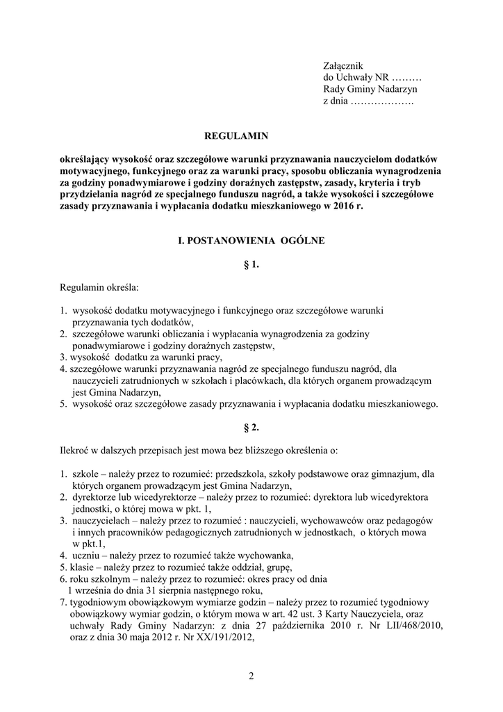 Załącznik do Uchwały NR ……… Rady Gminy Nadarzyn z dnia ………………. REGULAMIN określający wysokość oraz szczegółowe warunki przyznawania nauczycielom dodatków motywacyjnego, funkcyjnego oraz za warunki pracy, sposobu obliczania wynagrodzenia za godziny ponadwymiarowe i godziny doraźnych zastępstw, zasady, kryteria i tryb przydzielania nagród ze specjalnego funduszu nagród, a także wysokości i szczegółowe zasady przyznawania i wypłacania dodatku mieszkaniowego w 2016 r. I. POSTANOWIENIA OGÓLNE § 1. Regulamin określa: 1. wysokość dodatku motywacyjnego i funkcyjnego oraz szczegółowe warunki przyznawania tych dodatków, 2. szczegółowe warunki obliczania i wypłacania wynagrodzenia za godziny ponadwymiarowe i godziny doraźnych zastępstw, 3. wysokość dodatku za warunki pracy, 4. szczegółowe warunki przyznawania nagród ze specjalnego funduszu nagród, dla nauczycieli zatrudnionych w szkołach i placówkach, dla których organem prowadzącym jest Gmina Nadarzyn, 5. wysokość oraz szczegółowe zasady przyznawania i wypłacania dodatku mieszkaniowego. § 2. Ilekroć w dalszych przepisach jest mowa bez bliższego określenia o: 1. szkole – należy przez to rozumieć: przedszkola, szkoły podstawowe oraz gimnazjum, dla których organem prowadzącym jest Gmina Nadarzyn, 2. dyrektorze lub wicedyrektorze – należy przez to rozumieć: dyrektora lub wicedyrektora jednostki, o której mowa w pkt. 1, 3. nauczycielach – należy przez to rozumieć : nauczycieli, wychowawców oraz pedagogów i innych pracowników pedagogicznych zatrudnionych w jednostkach, o których mowa w pkt.1, 4. uczniu – należy przez to rozumieć także wychowanka, 5. klasie – należy przez to rozumieć także oddział, grupę, 6. roku szkolnym – należy przez to rozumieć: okres pracy od dnia 1 września do dnia 31 sierpnia następnego roku, 7. tygodniowym obowiązkowym wymiarze godzin – należy przez to rozumieć tygodniowy obowiązkowy wymiar godzin, o którym mowa w art. 42 ust. 3 Karty Nauczyciela, oraz uchwały Rady Gminy Nadarzyn: z dnia 27 października 2010 r. Nr LII/468/2010, oraz z dnia 30 maja 2012 r. Nr XX/191/2012, 2 8. roku budżetowym – należy przez to rozumieć: okres od 1 stycznia do 31 grudnia każdego roku, 9. Karcie Nauczyciela – rozumie się przez to ustawę z dnia 26 stycznia 1982 r. – Karta Nauczyciela (t.j. Dz. U. z 2014 r., poz. 191 ze zm. ), 10. rozporządzeniu – należy przez to rozumieć: rozporządzenie Ministra Edukacji Narodowej i Sportu z dnia 31 stycznia 2005 r. w sprawie minimalnych stawek wynagrodzenia zasadniczego nauczycieli, ogólnych warunków przyznawania dodatków do wynagrodzenia zasadniczego oraz wynagradzania za pracę w dniu wolnym od pracy ( t.j Dz.U. z 2014 , poz. 416 ze zm.), 11 . kwocie podstawowej – należy przez to rozumieć: wynagrodzenie zasadnicze jakie otrzymuje nauczyciel stażysta z wykształceniem magisterskim i przygotowaniem pedagogicznym, 12. wynagrodzeniu zasadniczym – należy przez to rozumieć: wynagrodzenie zasadnicze nauczycieli określone w rozporządzeniu, o którym mowa w podpunkcie 10, 13. wójcie – należy przez to rozumieć: Wójta Gminy Nadarzyn, 14. gminie – należy przez to rozumieć: Gminę Nadarzyn. § 3. Wynagrodzenie nauczycieli składa się z: 1. 2. 3. 4. wynagrodzenia zasadniczego, dodatków za wysługę lat, motywacyjnego, funkcyjnego oraz za warunki pracy, wynagrodzenia za godziny ponadwymiarowe, godziny zastępstw doraźnych, nagród i innych świadczeń wynikających ze stosunku pracy z wyłączeniem świadczeń z zakładowego funduszu świadczeń socjalnych. § 4. Minimalne stawki wynagrodzenia zasadniczego przyjmuje się zgodnie § 2 ust. 1 rozporządzenia. II. DODATEK MOTYWACYJNY § 5. 1. Nauczycielom, niezależnie od stopnia awansu oraz sposobu nawiązania stosunku pracy może być przyznany dodatek motywacyjny. 2. Dodatek przyznaje się na czas określony, nie krótszy niż 4 miesiące i nie dłuższy niż rok kalendarzowy. 3. W każdej szkole tworzy się fundusz na dodatki motywacyjne w wysokości 7 % planowanych środków na wynagrodzenia osobowe nauczycieli. 4. Dodatek motywacyjny ma charakter uznaniowy. 5. Podstawą przyznania nauczycielowi dodatku motywacyjnego są osiągnięcia w pracy, a w szczególności: 1) osiągnięcia dydaktyczne, wychowawcze i opiekuńcze: a) uzyskiwanie przez uczniów, z uwzględnieniem ich możliwości oraz warunków pracy nauczyciela, dobrych osiągnięć dydaktycznowychowawczych potwierdzonych wynikami klasyfikacji, promocji, 3 efektami sprawdzianów i egzaminów zewnętrznych, wynikami wewnątrzszkolnego badania wyników nauczania, sukcesami w konkursach , zawodach, olimpiadach itp., b) posiadanie udokumentowanych osiągnięć w pracy z uczniami mającymi trudności w nauce lub problemy z adaptacją w środowisku szkolnym; prowadzenie zajęć na rzecz tych uczniów lub posiadanie programu pracy indywidualnej dla danego ucznia, c) umiejętne rozwiązywanie problemów wychowawczych uczniów we współpracy z ich rodzicami, d) pełne rozpoznanie środowiska wychowawczego uczniów, efektywne działanie na rzecz uczniów potrzebujących szczególnej opieki, e) realizowanie zadań edukacyjnych zgodnych z priorytetami polityki oświatowej, f) współpraca z instytucjami działającymi na rzecz dzieci i młodzieży; podnoszenie umiejętności zawodowych poprzez studia podyplomowe, kursy kwalifikacyjne, udział w doskonaleniu nauczycieli 2) jakość świadczonej pracy, w tym związanej z powierzonym stanowiskiem kierowniczym, dodatkowym zadaniem lub zajęciem, a w szczególności: a) systematyczne i efektywne przygotowanie się do realizacji przydzielonych obowiązków, b) wzbogacanie warsztatu pracy, c) ustawiczne podnoszenie kwalifikacji zawodowych poprzez studia podyplomowe, kursy kwalifikacyjne d) dbałość o estetykę i sprawność powierzonych pomieszczeń, pomocy dydaktycznych lub innych urządzeń szkolnych, e) rzetelne i terminowe w
