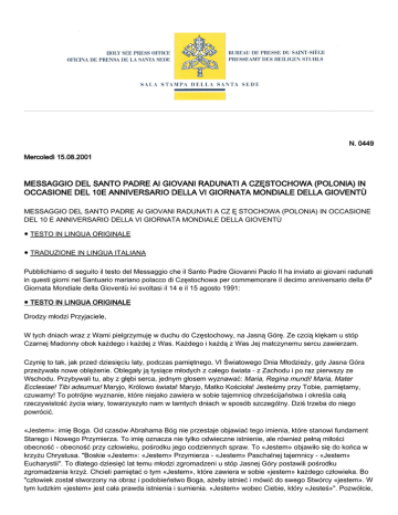 N. 0449 Mercoledì 15.08.2001 MESSAGGIO DEL SANTO PADRE AI GIOVANI RADUNATI A CZĘSTOCHOWA (POLONIA) IN OCCASIONE DEL 10E ANNIVERSARIO DELLA VI GIORNATA MONDIALE DELLA GIOVENTÙ MESSAGGIO DEL SANTO PADRE AI GIOVANI RADUNATI A CZ Ę STOCHOWA (POLONIA) IN OCCASIONE DEL 10 E ANNIVERSARIO DELLA VI GIORNATA MONDIALE DELLA GIOVENTÙ ● TESTO IN LINGUA ORIGINALE ● TRADUZIONE IN LINGUA ITALIANA Pubblichiamo di seguito il testo del Messaggio che il Santo Padre Giovanni Paolo II ha inviato ai giovani radunati in questi giorni nel Santuario mariano polacco di Częstochowa per commemorare il decimo anniversario della 6ª Giornata Mondiale della Gioventù ivi svoltasi il 14 e il 15 agosto 1991: ● TESTO IN LINGUA ORIGINALE Drodzy młodzi Przyjaciele, W tych dniach wraz z Wami pielgrzymuję w duchu do Częstochowy, na Jasną Górę. Ze czcią klękam u stóp Czarnej Madonny obok każdego i każdej z Was. Każdego i każdą z Was Jej matczynemu sercu zawierzam. Czynię to tak, jak przed dziesięciu laty, podczas pamiętnego, VI Światowego Dnia Młodzieży, gdy Jasna Góra przeżywała nowe oblężenie. Oblegały ją tysiące młodych z całego świata - z Zachodu i po raz pierwszy ze Wschodu. Przybywali tu, aby z głębi serca, jednym głosem wyznawać: Maria, Regina mundi! Maria, Mater Ecclesiae! Tibi adsumus! Maryjo, Królowo świata! Maryjo, Matko Kościoła! Jesteśmy przy Tobie, pamiętamy, czuwamy! To potrójne wyznanie, które niejako zawiera w sobie tajemnicę chrześcijaństwa i określa całą rzeczywistość życia wiary, towarzyszyło nam w tamtych dniach w sposób szczególny. Dziś trzeba do niego powrócić. «Jestem»: imię Boga. Od czasów Abrahama Bóg nie przestaje objawiać tego imienia, które stanowi fundament Starego i Nowego Przymierza. To imię oznacza nie tylko odwieczne istnienie, ale również pełną miłości obecność - obecność przy człowieku, pośrodku jego codziennych spraw. To «Jestem» objawiło się do końca w krzyżu Chrystusa. "Boskie «Jestem»: «Jestem» Przymierza - «Jestem» Paschalnej tajemnicy - «Jestem» Eucharystii". To dlatego dziesięć lat temu młodzi zgromadzeni u stóp Jasnej Góry postawili pośrodku zgromadzenia krzyż. Chcieli pamiętać o tym «Jestem», które zawiera w sobie «jestem» każdego człowieka. Bo "człowiek został stworzony na obraz i podobieństwo Boga, ażeby istnieć i mówić do swego Stwórcy «jestem». W tym ludzkim «jestem» jest cała prawda istnienia i sumienia. «Jestem» wobec Ciebie, który «Jesteś»". Pozwólcie, 2 że przypomnę słowa, które powiedziałem do młodych podczas tamtego spotkania, a które dziś wydają się jeszcze bardziej aktualne: "Świat, który Was otacza, nowożytna cywilizacja, ogromnie przyczyniła się do tego, aby odsunąć od świadomości człowieka to Boże «Jestem». Stara się bytować tak, jakby Boga nie było - to jej program. Jeżeli jednak Boga nie ma, czy ty człowieku, naprawdę jesteś? Przybyliście tutaj, drodzy Przyjaciele, aby odnaleć i potwierdzić do głębi to własne ludzkie «jestem» wobec Boga. Patrzcie na krzyż, w którym Boże «Jestem» znaczy «Miłość». Patrzcie na krzyż i nie zapominajcie. Niech słowem kluczowym Waszego życia pozostanie «jestem przy Tobie»". «Pamiętam». "Człowiek jest wobec Boga, trwa przy Bogu poprzez to, że pamięta. Poprzez to, że zachowuje słowa Boże i wielkie sprawy Boże, rozważając je w sercu swoim tak, jak Maryja z Nazaretu". Ta pamięć, aby była żywa, musi stale wracać do ródeł, do tych słów i wydarzeń, przez które Bóg objawiał i wypełnił swój plan zbawienia. Prawda o miłości Boga do człowieka zapisana na kartach Biblii nie może pójść w zapomnienie. Wiedzieli o tym młodzi przed dziesięciu laty i dlatego odchodzili spod jasnogórskich wałów z księgą Pisma Świętego. Wecie i Wy, młodzi trzeciego tysiąclecia, tę świętą Księgę, nie przestawajcie obcować z Ewangelią, ze słowem Boga żywego, poznawajcie coraz pełniej Chrystusa, abyście także siebie samych lepiej poznali i byście pamiętali, jakie jest Wasze powołanie i Wasza godność. «Czuwam». «Czuwajcie i módlcie się, abyście nie ulegli pokusie» (Mk 14, 38). Ile razy Chrystus powtarzał to wezwanie! Czuwam - to znaczy "staram się być człowiekiem sumienia. Że tego sumienia nie zagłuszam i nie zniekształcam. Nazywam po imieniu dobro i zło, a nie zamazuję. Wypracowuję w sobie dobro, a ze zła staram się poprawiać, przezwyciężać je w sobie". Czuwam - to znaczy również dostrzegam drugiego człowieka, wyczulam wzrok i serce na jego potrzeby ciała i ducha, z miłością staram się wychodzić im naprzeciw. Kiedy przed dziesięciu laty młodzi z różnych krajów, środowisk i kultur medytowali nad tym, co w rzeczywistości człowieka wierzącego oznacza słowo «czuwam» i szukali wspólnego wzorca takiej postawy, intuicja słusznie prowadziła ich ku matce. «Czuwam» oznacza bowiem postawę matki. "Jej życie, jej powołanie wyraża się w czuwaniu. Jest to czuwanie nad człowiekiem od pierwszych chwil zaistnienia". Dlatego obok krzyża i Biblii ustawili trzeci, wymowny symbol: ikonę Bogarodzicy. Pragnęli, aby ikona Maryi urzeczywistniała podczas Dnia Młodzieży to szczególne, matczyne czuwanie, jakie towarzyszyło przyjściu na świat Syna Bożego w betlejemską noc i Jego konaniu w Wielki Piątek, i narodzinom Kościoła w dniu Pięćdziesiątnicy. Pragnęli, aby ten obraz czuwającej Matki głęboko wyrył się w ich pamięci i w sercu, i by kształtował ich życie. I dziś, gdy stajecie przed jasnogórską Ikoną, wpatrujcie się w oczy Maryi, odczytujcie w ich głębi doskonałą czystość serca, niezmącony pokój sumienia i miłość zawsze wierną. Niech to spojrzenie pozostanie w Waszych duszach. Niech nieustannie uczy Was, co znaczy «czuwam». Wraz z tym wspomnieniem częstochowskiego święta młodych, jakie z radością i w modlitewnej zadumie przeżywaliśmy przed dzi