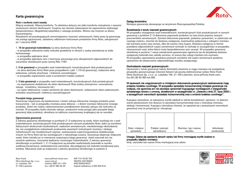 Karta gwarancyjna Roto z zaufania czyni zasadę Więcej swobody. Więcej komfortu. Ta obietnica dotyczy nie tylko komfortu mieszkania z naszymi markowymi oknami dachowymi. Czujemy się również zobowiązani do zapewnienia większego bezpieczeństwa i długoletniej satysfakcji z naszego produktu. Można nas trzymać za słowo. Gwarantujemy: Niezależnie od przysługujących zamawiającemu roszczeń ustawowych, które przez tę gwarancję nie zostają ograniczone, udzielamy odbiorcom końcowym produktów firmy Roto, zakupionych po 1 stycznia 2008 1. 15 lat gwarancji materiałowej materiałowe na okna dachowe firmy Roto - w przypadku stłuczenia szyby wskutek gradobicia w oknach z szybą zewnętrzną ze szkła hartowanego - w przypadku pęknięcia okuć - w przypadku pęknięcia ram z tworzywa sztucznego przy obciążeniach odpowiednich do warunków określonych przez normę RAL 716/1 2. 5 lat gwarancji w przypadku wad materiałowych, konstrukcyjnych i/lub produkcyjnych - na okna dachowe firmy Roto poza przypadkami z pkt. 1 (15 lat gwarancji), wyłazowe okna połaciowe, schody strychowe i kołnierze uszczelniające - w przypadku zaparowania szyb w przestrzeni między szybami 3. 2 lata gwarancji w przypadku wad materiałowych, konstrukcyjnych i/lub produkcyjnych - na wyposażenie dodatkowe do okien dachowych Roto (rolety zewnętrzne i wewnętrzne, żaluzje, moskitiery, sterowanie itd.) - na części elektryczne i części zamienne do okien dachowych, wyłazowych okien połaciowych, schodów strychowych i kołnierzy uszczelniających Początek biegu gwarancji Gwarancja rozpoczyna się każdorazowo z dniem zakupu fabrycznie nowego produktu przez konsumenta – lub w przypadku montażu przez dekarza – z dniem montażu fabrycznie nowego produktu. Dzień ten należy udokumentować przedłożeniem dowodu zakupu lub rachunku za montaż. W przypadku braku dowodu zakupu producent może przyjąć jako początek biegu gwarancji datę produkcji, określoną na tabliczce znamionowej znajdującej się na wyrobie. Ograniczenia gwarancji Z zakresu gwarancji określonego w punktach 2 i 3 wyłączone są wady, które wynikają nie z wad materiałowych, konstrukcyjnych i/lub produkcyjnych samych produktów Roto, tylko są wynikiem faktycznych okoliczności budowlanych, wpływów zewnętrznych, niewłaściwego obchodzenia się, nie uwzględnienia wskazówek producenta zawartych instrukcjach montażu i obsługi, niefachowych lub niewłaściwych napraw, zastosowania części/wyposażenia dodatkowego innych niż firmy Roto lub też wynikających z naturalnego zużycia. Gwarancja obejmuje wyłącznie wady, które istniały już w momencie rozpoczęcia biegu gwarancji. Jeżeli warunek ten nie zostanie spełniony, roszczenia będziemy rozstrzygać indywidualnie. Z zakresu gwarancji określonego w punktach 1, 2 i 3 wyłączone są ponadto wady/szkody powstałe w wyniku wadliwej konserwacji, niedostatecznej wentylacji, złej pielęgnacji lub wskutek kondensacji pary wodnej. Stłuczenia szyb są wyłączone z zakresu gwarancji określonego w punkcie 2. Roto Frank Okna Dachowe Sp. z o.o. ul. Lubelska 104 21-100 Lubartów [email protected] www.roto.pl infolinia 0801 011 470 fax +48 81 855 05 28 NIP 714-18-92-754 REGON 432735632 KRS 0000223537 Kapitał zakładowy 3 250 000 PLN Zasięg terytorialny Niniejsza gwarancja obowiązuje na terytorium Rzeczypospolitej Polskiej. Świadczenia z tytułu roszczeń gwarancyjnych: W przypadku wystąpienia wad materiałowych, konstrukcyjnych i/lub produkcyjnych w ramach gwarancji z punktów 2 i 3 dokonamy poprawek produktu na nasz koszt poprzez naszych pracowników serwisowych. Zamiast dokonania poprawek, jesteśmy uprawnieni, w zależności od naszego wyboru, również do dostawy zastępczej, ewentualnie połączonej z usługami montażu lub wymiany przez nasz serwis, albo do zwrotu ceny kupna. Dostawa zastępcza w formie przesłania odpowiednich części zamiennych wchodzi w rachubę w szczególności w przypadku nieznacznych wad, które klient może bezproblemowo sam usunąć. W przypadku gwarancji określonej w punkcie 1 nasze świadczenie gwarancyjne ogranicza się do bezpłatnej dostawy zastępczej materiału bez udziału serwisu, to znaczy bez usługi montażu lub wymiany. W przypadku zaprzestania produkcji pewnych wyrobów lub części zamiennych jesteśmy uprawnieni do dostarczenia odpowiedniego wyrobu zastępczego. Dochodzenie roszczeń gwarancyjnych: Uprawnień z tytułu gwarancji należy dochodzić pisemnie w ciągu miesiąca od wystąpienia przypadku gwarancyjnego (również faksem lub pocztą elektroniczną) wobec Roto Frank Okna Dachowe Sp. z o.o. ul. Lubelska 104, 21-100 Lubartów, [email protected], fax (81) 85 50 383 lub 582. W sprawach nie uregulowanych w niniejszym dokumencie gwarancyjnym zastosowanie mają przepisy kodeksu cywilnego. W przypadku sprzedaży konsumenckiej niniejsza gwarancja nie wyłącza, nie ogranicza ani nie zawiesza uprawnień kupującego wynikających wynikających z niezgodności sprzedanego towaru z umową, określonych w szczególności w „Ustawie z dnia 27. lipca 2002 r. o szczególnych warunkach sprzedaży konsumenckiej oraz o zmianie kodeksu cywilnego”. Kupujący oświadcza, że zakupiony wyrób odebrał w stanie kompletnym, sprawny i w dobrym stanie jakościowym (nie dotyczy to sprzedaży konsumenckiej) wraz z instrukcja montażu, obsługi i konserwacji. Kupujący oświadcza również, że zapoznał się z powyższymi warunkami gwarancji oraz że przyjmuje je i akceptuje. Data i miejsce sprzedaży Podpis i pieczęć sprzedawcy Rozmiar, typ i nazwa wyrobu Adnotacje producenta Uwaga: Zaleca się zapisanie danych osoby lub firmy montującej wyrób (ważne w przypadku błędów montażu) Imię, nazwisko lub nazwa firmy montującej oraz adres: ................................................................................................................................................ ......................................................