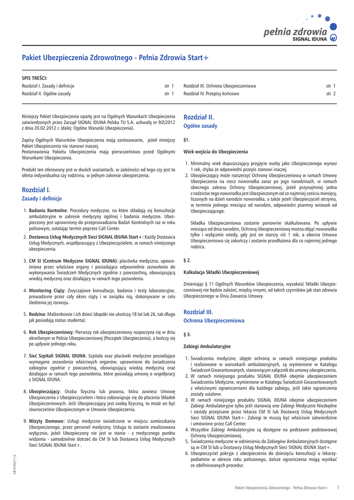 Pakiet Ubezpieczenia Zdrowotnego - Pełnia Zdrowia Start+ SPIS TREŚCI: Rozdział I. Zasady i definicje str 1 Rozdział III. Ochrona Ubezpieczeniowa str 1 Rozdział II. Ogólne zasady str 1 Rozdział IV. Przepisy końcowe str 2 Niniejszy Pakiet Ubezpieczenia oparty jest na Ogólnych Warunkach Ubezpieczenia zatwierdzonych przez Zarząd SIGNAL IDUNA Polska TU S.A. uchwałą nr 9/Z/2012 z dnia 20.02.2012 r. (dalej: Ogólne Warunki Ubezpieczenia). Rozdział II. Zapisy Ogólnych Warunków Ubezpieczenia mają zastosowanie, jeżeli niniejszy Pakiet Ubezpieczenia nie stanowi inaczej. Postanowienia Pakietu Ubezpieczenia mają pierwszeństwo przed Ogólnymi Warunkami Ubezpieczenia. §1. Produkt ten oferowany jest w dwóch wariantach, w zależności od tego czy jest to oferta indywidualna czy rodzinna, w jednym zakresie ubezpieczenia. Rozdział I. Zasady i definicje 1.Badania Kontrolne: Procedury medyczne, na które składają się konsultacje ambulatoryjne w zakresie medycyny ogólnej i badania medyczne. Ubezpieczony jest uprawniony do przeprowadzania Badań Kontrolnych raz w roku polisowym, ustalając termin poprzez Call Center. 2. Dostawca Usług Medycznych Sieci SIGNAL IDUNA Start+: Każdy Dostawca Usług Medycznych, współpracujący z Ubezpieczycielem, w ramach niniejszego ubezpieczenia. 3.CM SI (Centrum Medyczne SIGNAL IDUNA): placówka medyczna, upoważniona przez właściwe organy i posiadająca odpowiednie zezwolenia do wykonywania Świadczeń Medycznych zgodnie z powszechną, obowiązującą wiedzą medyczną oraz działający w ramach tego pozwolenia. 4.Monitoring Ciąży: Zwyczajowe konsultacje, badania i testy laboratoryjne, prowadzone przez cały okres ciąży i w związku nią, dokonywane w celu śledzenia jej rozwoju. 5. Rodzina: Małżonkowie i ich dzieci (dopóki nie ukończą 18 lat lub 26, tak długo jak posiadają status studenta). 6.Rok Ubezpieczeniowy: Pierwszy rok ubezpieczeniowy rozpoczyna się w dniu określonym w Polisie Ubezpieczeniowej (Początek Ubezpieczenia), a kończy się po upływie jednego roku. 7.Sieć Szpitali SIGNAL IDUNA: Szpitale oraz placówki medyczne posiadające wymagane zezwolenia właściwych organów, uprawnione do świadczenia zabiegów zgodnie z powszechną, obowiązującą wiedzą medyczną oraz działające w ramach tego pozwolenia, które posiadają umowę o współpracy z SIGNAL IDUNA. 8. Ubezpieczający: Osoba fizyczna lub prawna, która zawiera Umowę Ubezpieczenia z Ubezpieczycielem i która zobowiązuje się do płacenia Składek Ubezpieczeniowych. Jeśli Ubezpieczający jest osobą fizyczną, to może on być równocześnie Ubezpieczonym w Umowie Ubezpieczenia. SIR 0195/??.13 9. Wizyty Domowe: Usługi medyczne świadczone w miejscu zamieszkania Ubezpieczonego, przez personel medyczny. Usługa ta zostanie zrealizowana wyłącznie, jeżeli Ubezpieczony nie jest w stanie - z medycznego punktu widzenia - samodzielnie dotrzeć do CM SI lub Dostawca Usług Medycznych Sieci SIGNAL IDUNA Start+. Ogólne zasady Wiek wejścia do Ubezpieczenia 1.Minimalny wiek dopuszczający przyjęcie osoby jako Ubezpieczonego wynosi 1 rok, chyba że odpowiedni przepis stanowi inaczej. 2.Ubezpieczający może rozszerzyć Ochronę Ubezpieczeniową w ramach Umowy Ubezpieczenia na rzecz noworodka zaraz po jego narodzinach, w ramach obecnego zakresu Ochrony Ubezpieczeniowej, jeżeli przynajmniej jedno z rodziców tego noworodka jest Ubezpieczonym od co najmniej sześciu miesięcy, liczonych na dzień narodzin noworodka, a także jeżeli Ubezpieczyciel otrzyma, w terminie jednego miesiąca od narodzin, odpowiedni pisemny wniosek od Ubezpieczającego. Składka Ubezpieczeniowa zostanie ponownie skalkulowana. Po upływie miesiąca od dnia narodzin, Ochroną Ubezpieczeniową można objąć noworodka tylko i wyłącznie wtedy, gdy jest on starszy niż 1 rok, a obecna Umowa Ubezpieczeniowa się zakończy i zostanie przedłużona dla co najmniej jednego rodzica. § 2. Kalkulacja Składki Ubezpieczeniowej Zmieniając § 11 Ogólnych Warunków Ubezpieczenia, wysokość Składki Ubezpieczeniowej nie będzie zależeć, między innymi, od takich czynników jak stan zdrowia Ubezpieczonego w Dniu Zawarcia Umowy. Rozdział III. Ochrona Ubezpieczeniowa § 3. Zabiegi Ambulatoryjne 1.Świadczenia medyczne, objęte ochroną w ramach niniejszego produktu i realizowane w warunkach ambulatoryjnych, są wymienione w Katalogu Świadczeń Gwarantowanych, stanowiącym załącznik do umowy ubezpieczenia. 2.W ramach niniejszego produktu SIGNAL IDUNA obejmie ubezpieczeniem Świadczenia Medyczne, wymienione w Katalogu Świadczeń Gwarantowanych z właściwymi ograniczeniami dla każdego zabiegu, jeśli takie ograniczenia zostały ustalone. 3.W ramach niniejszego produktu SIGNAL IDUNA obejmie ubezpieczeniem Zabiegi Ambulatoryjne tylko jeśli stanowią one Zabiegi Medycznie Niezbędne i zostały przepisane przez lekarza CM SI lub Dostawcę Usług Medycznych Sieci SIGNAL IDUNA Start+. Zabiegi te muszą być właściwie zatwierdzone i umówione przez Call Center. 4.Wszystkie Zabiegi Ambulatoryjne są dostępne na podstawie podstawowej Ochrony Ubezpieczeniowej. 5.Świadczenia medyczne w odniesieniu do Zabiegów Ambulatoryjnych dostępne są w CM SI lub u Dostawcy Usług Medycznych Sieci SIGNAL IDUNA Start+. 6.Ubezpieczyciel pokryje z ubezpieczenia do dziesięciu konsultacji u lekarzypediatrów w okresie roku polisowego, dalsze ograniczenia mogą wynikać ze zdefiniowanych procedur. Pakiet Ubezpieczenia Zdrowotnego - Pełnia Zdrowia Start+ 1 § 4. § 7. Badania Kontrolne Zabiegi Szpitalne 1.Świadczenia medyczne objęte niniejszym produktem w odniesieniu do Badań Kontrolnych są zdefiniowane w Katalogu Świadczeń Gwarantowanych, który stanowi załącznik do Umowy Ubezpieczenia. 2.Ubezpieczyciel pokryje na podstawie Umowy Ubezpieczenia tylko Zabiegi zdefiniowane w Katalogu Świadczeń Gwarantowanych dla Badania Kontrolnego, wyłącznie dla Badań Kontrolnych dokonywanych nie częściej niż raz w roku po