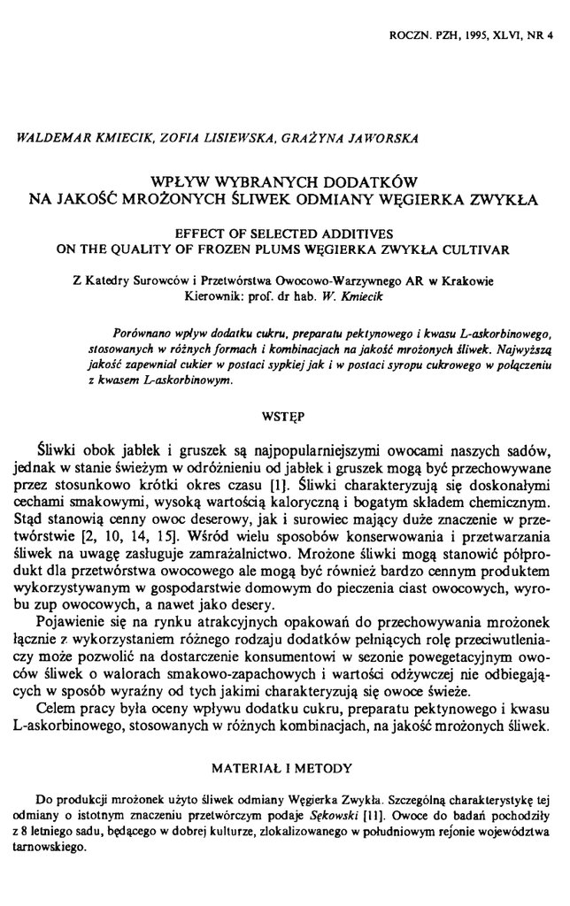ROCZN. PZH, 1995, XLVI, NR 4 W A L D E M A R K M IE C IK , ZO FIA L IS IE W S K A , G R A Ż Y N A JA W O R S K A WPŁYW WYBRANYCH DODATKÓW NA JAKOŚĆ MROŻONYCH ŚLIWEK ODMIANY W ĘGIERKA ZWYKŁA E FFEC T O F SELECTED A DD ITIVES O N T H E Q U A LITY O F FR O ZEN PLUM S W ĘG IER K A ZW YKŁA CULTIVAR Z K atedry Surowców i Przetwórstwa Owocowo-Warzywnego AR w Krakowie Kierownik: prof, d r hab. W. Kmiecik Porównano wpływ dodatku cukru, preparatu pektynowego i kwasu L-askorbinowego, stosowanych w różnych formach i kombinacjach na jakość mrożonych śliwek. Najwyższą jakość zapewniał cukier w postaci sypkiej ja k i tv postaci syropu cukrowego tv połączeniu z kwasem L-askorbinowym. WSTĘP Śliwki obok jabłek i gruszek są najpopularniejszymi owocami naszych sadów, jednak w stanie świeżym w odróżnieniu od jabłek i gruszek mogą być przechowywane przez stosunkowo krótki okres czasu [1]. Śliwki charakteryzują się doskonałymi cechami smakowymi, wysoką wartością kaloryczną i bogatym składem chemicznym. Stąd stanowią cenny owoc deserowy, jak i surowiec mający duże znaczenie w prze twórstwie [2, 10, 14, 15]. Wśród wielu sposobów konserwowania i przetwarzania śliwek na uwagę zasługuje zamrażalnictwo. Mrożone śliwki mogą stanowić półpro dukt dla przetwórstwa owocowego ale mogą być również bardzo cennym produktem wykorzystywanym w gospodarstwie domowym do pieczenia ciast owocowych, wyro bu zup owocowych, a nawet jako desery. Pojawienie się na rynku atrakcyjnych opakowań do przechowywania mrożonek łącznie z wykorzystaniem różnego rodzaju dodatków pełniących rolę przeciwutleniaczy może pozwolić na dostarczenie konsumentowi w sezonie powegetacyjnym owo ców śliwek o walorach smakowo-zapachowych i wartości odżywczej nie odbiegają cych w sposób wyraźny od tych jakimi charakteryzują się owoce świeże. Celem pracy była oceny wpływu dodatku cukru, preparatu pektynowego i kwasu L-askorbinowego, stosowanych w różnych kombinacjach, na jakość mrożonych śliwek. M A TER IA Ł I M ETOD Y D o produkcji mrożonek użyto śliwek odmiany Węgierka Zwykła. Szczególną charakterystykę tej odmiany o istotnym znaczeniu przetwórczym podaje Sękowski [11]. Owoce do badań pochodziły z 8 letniego sadu, będącego w dobrej kulturze, zlokalizowanego w południowym rejonie województwa tarnowskiego. 364 W. Kmiecik i in. Nr 4 Analizę surowca i przerób na mrożonki wykonano w ciągu 24 h od zbioru. Zabiegi przygoto wawcze do m rożenia obejmowały: sortowanie, mycie i osuszanie, usuwanie szypułek, krojenie na połówki i usuwanie pestek. O pakowaniami jednostkowymi dla mrożonek były płaskie pojemniki 0 pojemności 500 g, w ykonane z tworzywa sztucznego przeznaczonego do kontaktu z żywnością, zamykane przeźroczystym wieczkiem. Jako dodatki zastosowano cukier puder (PN-72/A-74850), pektynę niskometylowaną (LM 350) produkcji duńskiej, kwas L-askorbinowy produkcji Krakowskich Zakładów Farmaceutycznych „Polfa” . D o sporządzenia 60% syropu cukrowego użyto cukier biały rafinowany (PN-72/A-74850). W celu stwierdzenia wpływu wybranych dodatków na jakość mrożonych śliwek, z przeznacze niem jako desery, ustalono następujące próby badawcze: 1. M rożonka sucha. Owoce śliwek w ilości 500 g bez dodatków . 2. M rożonka w cukrze. 500 g owoców przesy-pano 50 g cukru pudru. 3. M rożonka w cukrze z pektyną. 500 g owoców przesypano 50 g cukru pudru z dodatkiem 0,5 g preparatu pektynowego. 4. M rożonka w cukrze z kwasem L-askorbinowym. 500 g owoców przesypano 50 g cukru z d o d at kiem 0,25 g kwasu L-askorbinowego. 5. M rożonka w syropie cukrowym. 500 g owoców zanurzono do 60% syropu cukrowego, z kolei uzupełniono w opakow aniu jego ilość do 84 g (co odpowiadało około 50 g cukru pudru). 6. M rożonka w syropie cukrowym z pektyną. 500 g owoców zanurzono do syropu w tem peraturze 50°C zawierającego 60% cukru i 0,5% preparatu pektynowego. Następnie uzupełniono jego ilość tak aby odpow iadała 50 g cukru. 7. M rożonka w syropie z kwasem L-askorbinowym. 500 g owoców zanurzono d o syropu zawierają cego 60% cukru i 0,5% kwasu L-askorbinowego. Z kolei uzupełniono w opakow aniu jego ilość do 84 g (odpowiadała około 50 g cukru i 0,4 g kwasu L-askorbinowego). 8. M rożonka w roztworze pektyny. 500 g owoców zanurzono do 1,5% roztworu pektyny. Owoce zatrzymały około 50 g roztworu. 9. M rożonka w roztworze pektyny i kwasu L-askorbinowego. 500 g owoców zanurzono d o roztworu zawierającego 1,5% pektyny i 0,5% kwasu L-askorbinowego. Owoce zatrzymały około 50 g roz tworu (zawierał on 0,25 kwasu L-askorbinowego). Wszystkie próby zam rożono w komorze klimatyzacyjnej typu Feutron (3101-01) z wymuszonym obiegiem powietrza. Czas mrożenia w tem peraturze -30°C do uzyskania w środku termicznym owoców tem peratury -20°C wynosił 90 minut. Dalsze przechowywanie mrożonek przez okres 1 roku odbywało się w komorze chłodniczej o tem peraturze -20°C. Analizy fizykochemiczne surowca oraz mrożonek wykonano w 4 powtórzeniach, dotyczyły one suchej masy, cukrów ogółem, kwasów ogółem, kwasowości czynnej, witaminy С i antocyjanów. Pierwsze 5 wskaźników oznaczano w oparciu o Polską Norm ę PN-90/A-75101, zaś antocyjany m etodą Fuleki i Francis’a [4]. Poziom witaminy С i antocyjanów w m rożonkach oznaczono bezpośrednio po zamrożeniu oraz po 3, 6, 9 i 12 miesiącach zamrażalniczego składowania. Pozostałe wskaźniki analizowano bezpośred nio po zamrożeniu i po 12 miesiącach. Analizę organoleptyczną rozm rożonego produktu wykonano po 12 miesiącach zamrażalniczego przechowywania. Przeprowadził ją 5-osobowy zespół w oparciu o metodę oceny bezpośredniej przy zastosowaniu 5 punktowej skali ocen dla następujących wyróżników jakości: ogólny wygląd owoców, w tym zachowanie kształtu i wyciek soku, jednolitość wielkości i barw a oraz konsystencja, zapach 1 sma!:. Ocenę koń