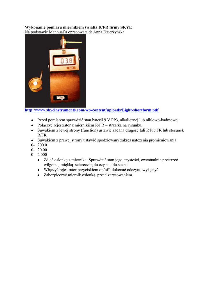 Wykonanie pomiaru miernikiem światła R/FR firmy SKYE Na podstawie Mannual`a opracowała dr Anna Dzierżyńska http://www.skyeinstruments.com/wp-content/uploads/Light-shortform.pdf Przed pomiarem sprawdzić stan baterii 9 V PP3, alkalicznej lub niklowo-kadmowej. Połączyć rejestrator z miernikiem R/FR – strzałka na rysunku. Suwakiem z lewej strony (function) ustawić żądaną długość fali R lub FR lub stosunek R/FR Suwakiem z prawej strony ustawić spodziewany zakres natężenia promieniowania 0- 200.0 0- 20.00 0- 2.000 Zdjąć osłonkę z miernika. Sprawdzić stan jego czystości, ewentualnie przetrzeć wilgotną, miękką ściereczką do czysta i do sucha. Włączyć rejestrator przyciskiem on/off, dokonać odczytu, wyłączyć Zabezpieczyć miernik osłonką przed zarysowaniem.