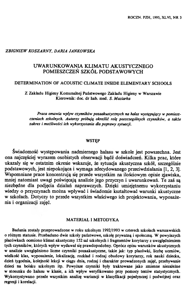 ROCZN. PZH, 1995, XLVI, N R 3 Z B IG N IE W K O S Z A R N Y , D A R IA JA N K O W SK A UW ARUNKOW ANIA KLIM ATU AKUSTYCZNEGO POMIESZCZEŃ SZKÓŁ PODSTAWOWYCH D ET E R M IN A T IO N O F A CO U STIC CLIM A TE IN S ID E E L E M E N T A R Y SCHOOLS Z Z akładu Higieny K om unalnej Państwowego Zakładu Higieny w Warszawie Kierow nik: doc. d r hab. med. S. M aziarka Praca omawia wpływ czynników pozaakustycznych na hałas występujący h> pomiesz czeniach szkolnych. A utorzy próbują określić rolę poszczególnych czynników, a także zakres i możliwości ich wykorzystania dla poprawy sytuacji. W STĘP Świadomość występowania nadmiernego hałasu w szkole jest powszechna. Jest ona najczęściej wyrazem osobistych obserwacji bądź doświadczeń. Kilka prac, które ukazały się w ostatnim okresie wskazuje, że sytuacja akustyczna szkół, szczególnie podstawowych, jest niepokojąca i wymaga zdecydowanego przeciwdziałania [1, 2, 3]. Wspomniane prace koncentrują się przede wszystkim na ilościowym opisie zjawiska, mniej natomiast uwagi poświęcają analizie jego przyczyn i uwarunkowań. Te zaś są niezbędne dla podjęcia działań naprawczych. Dzięki umiejętnemu wykorzystaniu wiedzy o przyczynach można wpływać i świadomie kształtować warunki akustyczne w szkołach. Dotyczy to przede wszystkim właściwego ich projektowania, wyposaże nia i organizacji zajęć. M A T ER IA Ł 1 M ETO D Y K A B adania zostały przeprowadzone w roku szkolnym 1992/1993 w czterech szkołach warszawskich o różnym statusie. Przebadano dwie szkoły państwowe, szkołę pryw atną i społeczną. W powyższych placówkach oceniono klim at akustyczny 152 sal szkolnych i fragmentów korytarzy z uwzględnieniem tych czynników, których wpływ wydawał się praw dopodobny. Oprócz opisu warunków akustycznych w analizie uwzględniono liczne czynniki pozaakustyczne, takie jak: typ placówki, liczbę uczniów, wielkość klas, wyposażenie, lokalizację, rozkład i rodzaj obudow y korytarzy, rok nauki dziecka, dzień tygodnia, kolejność lekcji w ciągu dnia, rodzaj i charakter prow adzonych zajęć, przebywanie dzied na boisku szkolnym itp. Powyższe czynniki były traktow ane jak o zmienne niezależne w stosunku do hałasu w klasie, a ich wpływ weryfikowano przy pom ocy testów statystycznych. W ykorzystywano przede wszystkim analizę wariancji w klasyfikacji pojedynczej i podwójnej oraz regresji i korelacji. 306 Z. K oszam y, D . Jankow ska Nr 3 W Y N IK I I ICH O M Ó W IEN IE Klimat akustyczny w salach szkolnych Analiza porównawcza hałasu występującego w salach szkolnych wskazuje na znaczne zróżnicowanie poziomu dźwięku zarówno podczas trwania poszczególnych lekcji, jak również między klasami. Poziom dynamiki zmian hałasu podczas lekcji został przedstawiony na rye. 1. Przeciętnie zakres tych zmian waha się w granicach ok. 30 dB. Rye. 1. Rozkład param etrów hałasu A występującego podczas lekcji w kolejnych odcinkach jej trwania D istribution of param eters А -weighted sound level in following intervals of lesson Znaczne różnice zachodzą również między ogólnym klimatem akustycznym wy stępującym w poszczególnych klasach. Obraz tych zmian, charakteryzowany równo ważnym poziomem dźwięku A wyraża się wartością 24 dB. W klasie o najniższym z zaobserwowanych poziomów zarejestrowano hałas o wartości 59 dB, maksymalna zaś głośność wyniosła 83 dB. Jeżeli wymienioną wyżej minimalną wartość uzna się za bliską granicy komfortu akustycznego możliwego do osiągnięcia podczas prowadzonych zajęć szkolnych to potrzeby, a zarazem możliwości obniżenia hałasu wydają się być bardzo duże. W odniesieniu do przeciętnego poziomu notowanego w klasach szkół podstawowych Nr 3 U warunkow ania hałasu w szkołach 307 można by uzyskać poprawę sytuacji akustycznej o ok. 8-10 dB. Warunkiem powo dzenia jest uwzględnienie czynników, których udział w kształtowaniu wypadkowego poziomu hałasu jest znaczny. Rola tych czynników została przedstawiona w tabeli I. T a b e l a I. Wpływ pozaak u stycznych czynników kształtujących poziom hałasu w czasie prow adzo nej lekcji ElTect o f non-acoustic factors on noise level during lesson 308 Z. K oszam y, D . Jankow ska Nr 3 Z analizy danych wynika, że sytuacja akustyczna w klasach jest uzależniona od kompleksu różnorodnych, wzajemnie powiązanych i uzupełniających się czynników. Do najważniejszych z nich należy zaliczyć liczebność klasy oraz rodzaj prowadzonych podczas lekcji zajęć. Zależność między liczbą uczniów w klasie a równoważnym poziomem dźwięku podczas prowadzonej lekcji przedstawia ryc 2. Najkorzystniejsze warunki akustyczne występują w klasach mniej licznych do 15 uczniów, natomiast w klasach, w których przebywa ponad 20 dzieci hałas w klasie wzrasta przeciętnie o ok. 4 dB. Znacznie podnosi się również poziom hałasu w klasie podczas zajęć grupowych, gdy kontrola nauczyciela nad uczniami jest mniejsza. Przeciętnie podczas tego rodzaju zajęć poziom hałasu w klasie wzrasta o ok. 8 dB Nr 3 U w arunkow ania hałasu w szkołach 309 w stosunku do lekcji prowadzonej przez nauczyciela. Z tego powodu najbardziej hałaśliwe są zajęcia prowadzone w świetlicy, podczas lekcji muzyki, plastyki i zpt. Szczególne pod tym względem znaczenie mają lekcje wf odbywające się w salach gimnastycznych podczas gier zbiorowych. W czasie tych zajęć równoważny poziom hałasu zwykle przekracza 90 dB, stanowiąc realne zagrożenie narządu słuchu, szcze gólnie nauczyciela. W klasach, gdzie prowadzone są zajęcia z innych przedmiotów nie związanych z pracą zespołową poziom hałasu jest niższy. Zróżnicowanie głośności na lekcjach z różnych przedmiotów wynosi ok. 6 dB. Najmniej głośne okazały się lekcje informatyki, języka polskiego, matematyki i biologii. Na lekcjach z pozostałych przedmiotów hałas był o 1-3 dB wyższy. Prawdopodobnie pewną rolę 