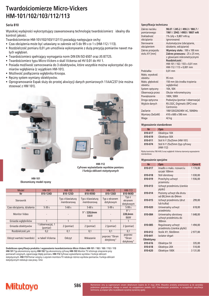 Twardościomierze Micro-Vickers HM-101/102/103/112/113 Specyfikacja techniczna Seria 810 Wysokiej wydajności wykorzystujący zaawansowaną technologię twardościomierz idealny dla kontroli jakości. Twardościomierze HM-101/102/103/112/113 posiadają następujące cechy: • Czas obciążenia może być ustawiany w zakresie od 5 do 99 s co 1 s (HM-112 / 113). • Rozdzielczość pomiaru 0,01 µm umożliwia wykonywanie z dużą precyzją pomiarów nawet małych wgłębień. • Twardościomierz spełniający wymagania norm DIN EN ISO 6507 oraz JIS B7725. • Twardościomierz typu Micro-Vickers o skali Vickersa od HV 0.01 do HV 1. • Posiada możliwość zamocowania do 3 obiektywów, które wszystkie można wykorzystać do pomiarów wgłębienia (z wyjątkiem HM-101). • Możliwość podłączenia wgłębnika Knoopa. • Ręczny system wymiany obiektywów. • Oprogramowanie Expak służy do prostej akwizycji danych pomiarowych 11AAC237 (nie można stosować z HM 101). Zakres nacisku pomiarowego Dokładność obciążania Sterowanie obciążeniem Zakres przejazdu stołu XY [mm] Podziałka Maks. wysokość obiektu Maks. głębokość obiektu System optyczny Obserwacja przez Powiększenie Droga optyczna Wyjście danych Zasilanie Wymiary (SxGxW) Waga 98.07 / 245.2 / 490.3 / 980.7 / 1961 / 2942 / 4903 / 9807 mN 1% (siły < 9,807 mN są ignorowane) Automatyczne (obciążanie, działanie, odciążanie) Wymiary stołu : 100 x 100 mm Zakres przesuwu : 25 x 25 mm, z głowicami mikrometrycznymi Rozdzielczość : HM-101 / 102 / 103 = 0,01 mm HM-112 / 113 = 0,001 mm 0,01 mm 95 mm 150 mm (do środka trzpienia wgłębnika) 10X, 50X Okular mikrometryczny 100X, 500X Podwójna (pomiar / obserwacja) RS-232C, Digimatic (SPC) oraz Centronics 100/120/220/240V AC, 50/60Hz 410 x 600 x 590 mm 42 kg Wyposażenie standardowe Nr 810-617 810-619 810-011 810-074 Opis Obiektyw 10X Obiektyw 50X Stół X-Y 25x25mm (HM-101) Stół X-Y 25x25mm (typ cyfrowy (HM-112) Płytka kontrolna 700 HV0.3 oraz wgłębnik Vickersa stanowią wyposażenie standardowe. Wyposażenie specjalne HM-112 Cyfrowe wyświetlanie wyników pomiaru i funkcja obliczeń statystycznych Nr 810-017 810-018 810-019 HM-101 Ekonomiczny model ręczny 810-013 Model Nr HM-101 810-124D HM-102 810-125D HM-103 810-959D HM-112 810-126D Monitor Video - - 9" / 228,6mm B&W Gniazda wgłębników 1 1 (obserwacja), 1 (pomiar) 0,2 1 1 1 HM-113 810-969D Typ z ekranem dotykowym 5-99 s 9" / 228,6mm B&W 1 Sterownik - Typ z klawiaturą membranową Typ z klawiaturą membranową Typ z ekranem dotykowym Czas obciążania, działania 5-30 s 5-60 s 5-60 s 5-99 s - 2 (pomiar) 2 (pomiar) 2 (pomiar) 2 (pomiar) 0,1 0,1 0,1 Wskazanie poprzez "Ekran dotykowy" 0,1 poprzez "Ekran dotykowy" Gniazda obiektywów Rozdzielczość µm Odczyt wartości twardości w tabeli Vickersa Odczyt Dodatkowa specyfikacja produktu i wyposażenia twardościomierza Micro Vickers HM-101 / 102 / 103 / 112 / 113 HM-101 Typ ekonomiczny ręczny HM-102 Typ ekonomiczny cyfrowy HM-103 Monitor TV eliminuje zmęczenie przy pomiarach wizyjnych, ograniczając błędy pomiaru. HM-112 Cyfrowe wyświetlanie wyników i funkcje obliczeń statystycznych. HM-113 Pomiar wizyjny z użyciem monitora TV redukuje różnice wyników pomiarów. Funkcja obliczeń statystycznych redukuje czas pracy. time 586 810-014 810-015 810-020 810-084 810-085 Opis Imadło o maks. rozwarciu szczęk 100mm Stół obrotowy Przechylny uchwyt przemiotu Uchwyt przedmiotu (cienkie płytki) Poziomy uchwyt dla drutu od Ø0,3mm do Ø4mm Uchwyt przedmiotu (drut lub kulka) Uniwersalny uchwyt przedmiotu Uniwersalny obrotowy uchwyt przedmiotu do 300mm Regulowany uchwyt przedmiotu (cienkie płytki) Stolik XY, 50x50mm Izolator drgań 810-012 810-641 Obiektywy 810-616 Obiektyw 5X 810-618 Obiektyw 20X 810-620 Obiektyw 100X Cena € 1 174,00 1 030,00 1 936,00 299,00 618,00 1 648,00 1 494,00 2 977,00 335,00 510,00 3 131,00 Wymienione ceny są sugerowanymi cenami detalicznymi (ważne do 31 maja 2014). Wszystkie produkty przeznaczone są do sprzedaży podmiotom gospodarczym, dlatego w cenach nie uwzględniono podatku VAT. Charakterystyki produktów, w szczególności specyfikacje techniczne, są wiążące tylko na podstawie wyraźnej wyrażonej zgody.