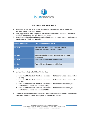 REGULAMIN BLUE MEDICA CLUB 1. Blue Medica Club jest programem partnerskim skierowanym do pacjentów sieci placówek medycznych Blue Medica. 2. Wystawcą i właścicielem Karty Blue Medica jest Blue Medica Sp. z o.o. z siedzibą w Łodzi, ul. Traktorowej 126 lok. 303, 91-204 Łódź. 3. Karty Blue Medica Club wydawane są bezpłatnie. Aby otrzymać kartę – należy spełnić wymienione w Tabeli nr 1 warunki: Rodzaj Karty BMC Warunki otrzymania Karty PS BMC Skorzystanie min. 1 raz z dowolnej usługi w dowolnej placówce sieci Blue Medica PP BMC BS BMC Zakup usług Blue Medica jednorazowo na kwotę min. 160 zł Warunki negocjowane indywidualnie BP BMC Warunki negocjowane indywidualnie Tabela nr 1 4. Istnieje kilka rodzajów kart Blue Medica Club: a) Karta Blue Medica Club Standard przeznaczona dla Pacjentów i oznaczona kodem PS BMC, b) Karta Blue Medica Club Premium przeznaczona dla Pacjentów i oznaczona kodem PP BMC, c) Karta Blue Medica Club Standard przeznaczona dla Partnerów Biznesowych i Kontrahentów, oznaczona kodem BS BMC, d) Karta Blue Medica Club Premium przeznaczona dla Partnerów Biznesowych i Kontrahentów, oznaczona kodem BP BMC. 5. Karta Blue Medica upoważnia posiadacza do skorzystania ze zniżek oraz profitów wg tabeli nr 2, obowiązujących w całej sieci Blue Medica w Polsce: Rodzaj Karty BMC PS BMC Przysługujące zniżki 5% na wszystkie usługi Blue Medica w całej sieci PP BMC 2% na zabiegi operacyjne 10% na wszystkie usługi Blue Medica w całej sieci BS BMC 3% na zabiegi operacyjne Zniżki ustalane indywidualnie BP BMC Zniżki ustalane indywidualnie Dodatkowe benefity Newsletter z nowościami Zaproszenia na bezpłatne badania Newsletter z nowościami Zaproszenia na bezpłatne badania Newsletter Zaproszenia na bezpłatne badania profilaktyczne Newsletter Zaproszenia na bezpłatne badania profilaktyczne Tabela nr 2 6. Karta upoważnia jej Użytkownika do korzystania ze zniżek wskazanych dla danego rodzaju Karty na stronie: www.bluemedica.pl w zakładce Blue Medica Club. 7. Karta upoważnia jej Użytkownika do korzystania ze zniżek przed wcześniejszym okazaniem jej pracownikowi rejestracji placówki Blue Medica. Nie okazanie karty przed wystawieniem paragonu przez pracownika Blue Medica skutkuje nie uwzględnieniem rabatu pomimo posiadania karty. 8. Kartę Premium mogą otrzymać osoby, które wydały min. 160 zł jednorazowo, korzystając z usług dostępnych w sieci Blue Medica. 9. Karta upoważnia do dedykowanych zniżek od momentu złożenia kolejnej wizyty w sieci Blue Medica. Zniżki nie obowiązują w dniu otrzymania karty. 10. Karta jest kartą na okaziciela, oznaczona dedykowanym numerem identyfikacyjnym. Niedozwolone jest korzystanie z Kart przez Użytkowników w celach zarobkowych. 11. Zabronione jest dokonywanie wszelkich zmian w wyglądzie Karty. 12. W celu korzystania z Karty wymagana jest zgoda Użytkownika na przetwarzanie danych osobowych. Zgodę można wyrazić za pośrednictwem przedstawiciela Blue Medica Sp. z o.o. lub rejestratorki w placówce Blue Medica (lista placówek dostępna na stronie www.bluemedica.pl), wypełniając oraz podpisując czytelnie formularz „Zgoda na przetwarzanie danych osobowych”. 13. Korzystanie z karty jest równoznaczne z akceptacją niniejszego regulaminu. 14. Odmowa wyrażenia zgody przez Użytkownika na przetwarzanie danych osobowych w celu korzystania z Karty lub żądanie zaprzestania przetwarzania danych jest równoznaczne z rezygnacją tego Użytkownika z członkostwa w Blue Medica Club. W takiej sytuacji zaprzestanie przetwarzania danych osobowych Blue Medica Sp. z o.o. w celu realizacji usług w ramach Blue Medica Club oraz zablokowanie Karty nastąpi z końcem miesiąca, w którym złożono rezygnację. 15. Pracownik Blue Medica Sp. z o.o. jest upoważniony do weryfikacji Karty pod względem przysługujących zniżek oraz benefitów, a także do zatrzymania Karty użytkowanej niezgodnie z jej przeznaczeniem lub postanowieniami Regulaminu. 16. Użytkownik zobowiązany jest do przestrzegania zasad działania placówki, w której się znajduje. 17. Użytkownik może zgłosić Blue Medica Sp. z o.o. reklamację w związku z członkostwem w Blue Medica Club lub dotyczącą zamówionych lub nabytych Kart. Reklamacja może być złożona w formie elektronicznej i przesłana na adres elektroniczny Blue Medica Sp. z o.o. [email protected] albo w formie pisemnej i przesłana na adres Blue Medica Sp. z o.o.: ul. Traktorowa 126 lok. 303, 91-204 Łódź z dopiskiem „Reklamacja Karta Blue Medica”. W zgłoszeniu reklamacyjnym Użytkownik winien zawrzeć swoje imię i nazwisko, numer Karty oraz opis zaistniałego problemu, a także żądanie określonego działania ze strony Blue Medica Sp. z o.o. (żądanie Użytkownika). Blue Medica Sp. z o.o. niezwłocznie, lecz nie później niż w terminie 14 dni od dnia otrzymania reklamacji, rozpatruje reklamacje i udziela odpowiedzi na adres poczty elektronicznej albo korespondencyjny Użytkownika, podany w zgłoszeniu reklamacji. 18. Wszelkie informacje związane z dostępem do usług można otrzymać dzwoniąc pod numer infolinii 801 100 111. 19. Fakt zgubienia, zniszczenia lub kradzieży Karty należy niezwłocznie zgłosić do Blue Medica Sp. z o.o. 20. Karta jest własnością Blue Medica Sp. z o.o. Blue Medica Sp. z o.o. ma prawo do dezaktywacji lub zatrzymania Karty w przypadku stwierdzenia naruszenia treści niniejszego Regulaminu. O dezaktywacji lub zatrzymaniu Karty w przypadku stwierdzenia jej użytkowania niezgodnego z treścią niniejszego Regulaminu, a także o fakcie znalezienia pozostawionej Karty w placówce Blue Medica informowany jest Klient. 21. Blue Medica Sp. z o.o. zastrzega sobie prawo do zmiany niniejszego Regulaminu w każdym czasie, z wyprzedzeniem co najmniej 14 dniowym. Regulamin oraz jego zmiany dostępne są na stronie internetowej www.bluemedica.pl w zakładce: Blue Medica Club. Regulamin wchodzi w życie w dniu 1 marca 2016 roku.