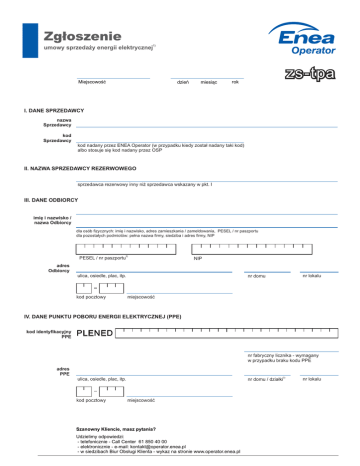 Zgłoszenie 1) umowy sprzedaży energii elektrycznej Miejscowość dzień miesiąc zs-tpa rok I. DANE SPRZEDAWCY nazwa Sprzedawcy kod Sprzedawcy kod nadany przez ENEA Operator (w przypadku kiedy został nadany taki kod) albo stosuje się kod nadany przez OSP II. NAZWA SPRZEDAWCY REZERWOWEGO sprzedawca rezerwowy inny niż sprzedawca wskazany w pkt. I III. DANE ODBIORCY imię i nazwisko / nazwa Odbiorcy dla osób fizycznych: imię i nazwisko, adres zamieszkania / zameldowania, PESEL / nr paszportu dla pozostałych podmiotów: pełna nazwa firmy, siedziba i adres firmy, NIP PESEL / nr paszportu 2) NIP adres Odbiorcy ulica, osiedle, plac, itp. kod pocztowy nr lokalu nr domu miejscowość IV. DANE PUNKTU POBORU ENERGII ELEKTRYCZNEJ (PPE) kod identyfikacyjny PPE PLENED nr fabryczny licznika - wymagany w przypadku braku kodu PPE adres PPE ulica, osiedle, plac, itp. kod pocztowy nr domu / działki miejscowość Szanowny Kliencie, masz pytania? Udzielimy odpowiedzi: - telefonicznie - Call Center 61 850 40 00 - elektronicznie - e-mail: [email protected] - w siedzibach Biur Obsługi Klienta - wykaz na stronie www.operator.enea.pl 3) nr lokalu V. DATA ROZPOCZĘCIA OBOWIĄZYWANIA UMOWY SPRZEDAŻY miesiąc dzień rok VI. PLANOWANA ILOŚĆ ENERGII ELEKTRYCZNEJ DLA PPE4) w MWh, z dokładnością do 0,001 Mwh VII. KOD MB, DO KTÓREGO MA BYĆ PRZYPISANY ODBIORCA MB _ 5) _ E N E _ _ 6) ZAŁĄCZNIK DO ZGŁOSZENIA Lista punktów poboru energii (PPE) W imieniu i na rzecz Odbiorcy oraz nowego Sprzedawcy Oświadczamy, że dane przedstawione w niniejszym zgłoszeniu odpowiadają stanowi faktycznemu. .................................................................................... czytelny podpis lub podpis i pieczęć Sprzedawcy .................................................................................... czytelny podpis lub podpis i pieczęć Odbiorcy WERYFIKACJA ZGŁOSZENIA (WYPEŁNIA ENEA OPERATOR) pozytywna negatywna Uwagi/uzasadnienie negatywnej weryfikacji: dzień miesiąc rok .................................................................................... podpis i pieczęć przedstawiciela ENEA Operator Administratorem danych osobowych zawartych w zgłoszeniu oraz uzyskanych w związku z jego realizacją jest ENEA Operator Spółka z ograniczoną odpowiedzialnością z siedzibą w Poznaniu, ul. Strzeszyńska 58, kod pocztowy: 60-479 Poznań. Pani/Pana dane osobowe są przetwarzane na zasadach określonych w ustawie z dnia 29 sierpnia 1997 r. o ochronie danych osobowych (Dz.U. z 2016 r., poz. 922 z późniejszymi zmianami), w celu realizacji zgłoszenia oraz mogą być udostępniane innym podmiotom w tym celu.Odbiorca ma prawo dostępu do treści swoich danych oraz do ich poprawiania. Podanie danych jest dobrowolne, ale konieczne do realizacji zgłoszenia. OBJAŚNIENIA 1) 2) 3) 4) 5) 6) zgłoszenie dotyczy jednej umowy sprzedaży energii elektrycznej i jest wypełniane przez Odbiorcę oraz przez nowego Sprzedawcę z którym Odbiorca zawarł umowę sprzedaży nr paszportu dotyczy obcokrajowców wypełnia się w przypadku braku administracyjnego numeru budynku planowana średnioroczna ilość energii elektrycznej objętej umową sprzedaży w podziale na poszczególne punkty PPE w MWh, z dokładnością do 0,001 MWh; w przypadku nie podania tej wartości lub gdy podana wartość odbiega od historycznego zużycia, zostanie ona określona przez ENEA Operator i traktowana według takich samych zasad jak podana przez Odbiorcę i/lub Sprzedawcę, wówczas ENEA Operator nie ponosi żadnej odpowiedzialności za skutki określenia tej wartości kod MB jest to nadawany przez OSP kod Miejsca Bilansowania Energii Elektrycznej Rynku Bilansującego, w ramach którego jest realizowane bilansowanie handlowe Odbiorcy załącznik dołączany do zgłoszenia w przypadku, gdy zgłoszenie obejmuje więcej niż jedno PPE