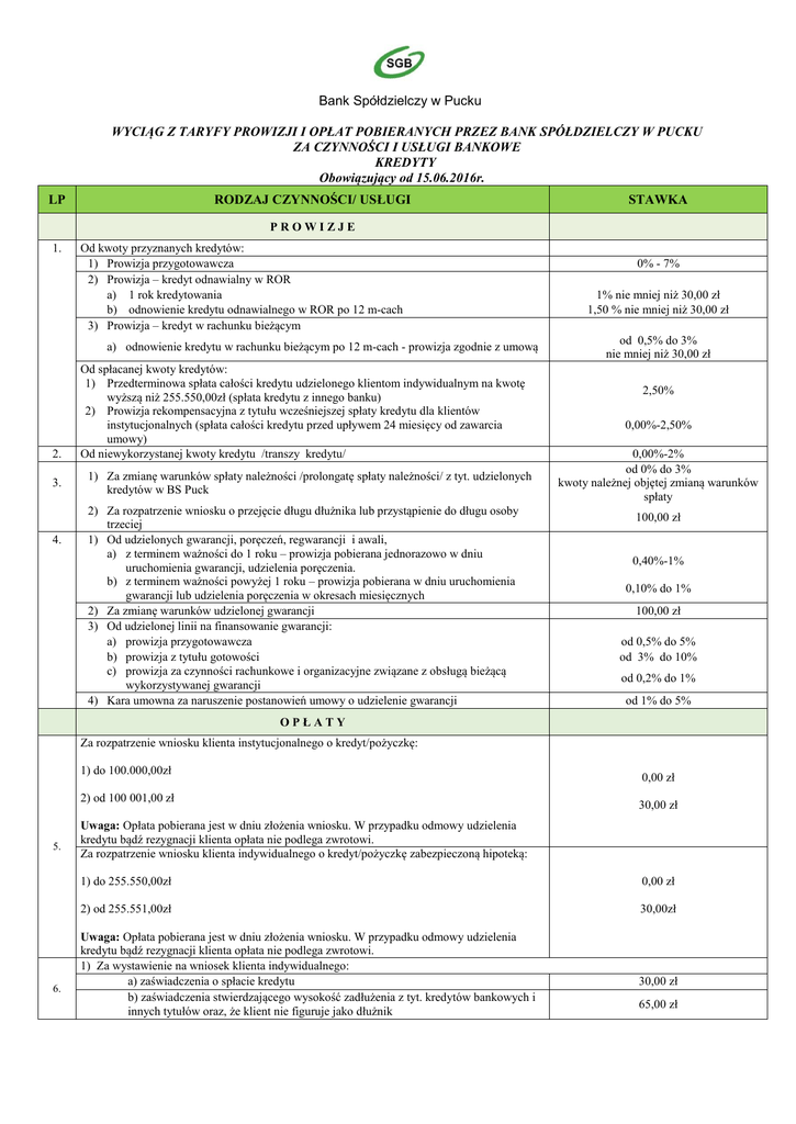 Bank Spółdzielczy w Pucku WYCIĄG Z TARYFY PROWIZJI I OPŁAT POBIERANYCH PRZEZ BANK SPÓŁDZIELCZY W PUCKU ZA CZYNNOŚCI I USŁUGI BANKOWE KREDYTY Obowiązujący od 15.06.2016r. RODZAJ CZYNNOŚCI/ USŁUGI LP STAWKA PROWIZJE 1. Od kwoty przyznanych kredytów: 1) Prowizja przygotowawcza 2) Prowizja – kredyt odnawialny w ROR a) 1 rok kredytowania b) odnowienie kredytu odnawialnego w ROR po 12 m-cach 3) Prowizja – kredyt w rachunku bieżącym a) odnowienie kredytu w rachunku bieżącym po 12 m-cach - prowizja zgodnie z umową 2. 3. 4. Od spłacanej kwoty kredytów: 1) Przedterminowa spłata całości kredytu udzielonego klientom indywidualnym na kwotę wyższą niż 255.550,00zł (spłata kredytu z innego banku) 2) Prowizja rekompensacyjna z tytułu wcześniejszej spłaty kredytu dla klientów instytucjonalnych (spłata całości kredytu przed upływem 24 miesięcy od zawarcia umowy) Od niewykorzystanej kwoty kredytu /transzy kredytu/ 1) Za zmianę warunków spłaty należności /prolongatę spłaty należności/ z tyt. udzielonych kredytów w BS Puck 2) Za rozpatrzenie wniosku o przejęcie długu dłużnika lub przystąpienie do długu osoby trzeciej 1) Od udzielonych gwarancji, poręczeń, regwarancji i awali, a) z terminem ważności do 1 roku – prowizja pobierana jednorazowo w dniu uruchomienia gwarancji, udzielenia poręczenia. b) z terminem ważności powyżej 1 roku – prowizja pobierana w dniu uruchomienia gwarancji lub udzielenia poręczenia w okresach miesięcznych 2) Za zmianę warunków udzielonej gwarancji 3) Od udzielonej linii na finansowanie gwarancji: a) prowizja przygotowawcza b) prowizja z tytułu gotowości c) prowizja za czynności rachunkowe i organizacyjne związane z obsługą bieżącą wykorzystywanej gwarancji 4) Kara umowna za naruszenie postanowień umowy o udzielenie gwarancji 0% - 7% 1% nie mniej niż 30,00 zł 1,50 % nie mniej niż 30,00 zł od 0,5% do 3% nie mniej niż 30,00 zł 2,50% 0,00%-2,50% 0,00%-2% od 0% do 3% kwoty należnej objętej zmianą warunków spłaty 100,00 zł 0,40%-1% 0,10% do 1% 100,00 zł od 0,5% do 5% od 3% do 10% od 0,2% do 1% od 1% do 5% OPŁATY Za rozpatrzenie wniosku klienta instytucjonalnego o kredyt/pożyczkę: 1) do 100.000,00zł 2) od 100 001,00 zł 5. 6. 0,00 zł 30,00 zł Uwaga: Opłata pobierana jest w dniu złożenia wniosku. W przypadku odmowy udzielenia kredytu bądź rezygnacji klienta opłata nie podlega zwrotowi. Za rozpatrzenie wniosku klienta indywidualnego o kredyt/pożyczkę zabezpieczoną hipoteką: 1) do 255.550,00zł 0,00 zł 2) od 255.551,00zł 30,00zł Uwaga: Opłata pobierana jest w dniu złożenia wniosku. W przypadku odmowy udzielenia kredytu bądź rezygnacji klienta opłata nie podlega zwrotowi. 1) Za wystawienie na wniosek klienta indywidualnego: a) zaświadczenia o spłacie kredytu b) zaświadczenia stwierdzającego wysokość zadłużenia z tyt. kredytów bankowych i innych tytułów oraz, że klient nie figuruje jako dłużnik 30,00 zł 65,00 zł c) zaświadczenia/opinii innej niż powyżej 2) Za wystawienie na wniosek klienta instytucjonalnego: a) zaświadczenia o spłacie kredytu b) zaświadczenia stwierdzającego wysokość zadłużenia z tyt. kredytów bankowych i innych tytułów oraz, że klient nie figuruje jako dłużnik c) zaświadczenia/opinii innej niż powyżej 7. 8. 9. Inne czynności związane z obsługą kredytów Wydanie promesy, inne Sporządzenie na wniosek klienta oceny jego sytuacji ekonomiczno-finansowej /zdolności kredytowej / Sporządzenie i wysłanie wezwania/upomnienia do spłaty raty / rat kredytu/ lub odsetek od każdego wezwania/ upomnienia do klienta indywidualnego Uwaga: Opłatę pobiera się od kredytobiorcy za wysłanie wezwania zarówno do kredytobiorcy jak i do poręczycieli 10. Sporządzenie i wysłanie wezwania/upomnienia do spłaty raty / rat kredytu/ lub odsetek od każdego wezwania/ upomnienia do klienta instytucjonalnego Uwaga: Opłatę pobiera się od kredytobiorcy za wysłanie wezwania zarówno do kredytobiorcy jak i do poręczycieli. 11. 12. 13. 100,00 zł 35,00 zł 90,00 zł 120,00 zł 30,00 zł 0% do 3% 50,00 zł -500,00 zł 6,40 zł (koszt listu poleconego zgodnie z cennikiem Poczty Polskiej S.A.) 20,00 zł 1) Zezwolenie na wykreślenie z hipoteki 25,00 zł 2) Zezwolenie na wykreślenie cesji z polisy ubezpieczeniowej 3) Za rozpatrzenie wniosku o bezciężarowe odłączenie części nieruchomości Na wniosek Kredytobiorcy za sporządzenie i wydrukowanie harmonogramu spłaty kredytu: 1) kredyty udzielone do kwoty 255.550,-zł, z wyłączeniem kredytów zabezpieczonych hipotecznie 2) kredyty inne niż wskazane w pkt.1 Opłata jednorazowa za przeprowadzone inspekcje na terenie budowy lub inwestycji będącej przedmiotem kredytowania, dokonywana w celu weryfikacji wykorzystania wypłaconego kredytu/transzy 25,00 zł 50,00 zł 14. Opłata za sporządzenie operatu szacunkowego 15. Przygotowanie i sporządzenie duplikatu umowy/aneksu lub innego dokumentu Bez opłat 20,00 zł 50,00 zł 650,00 zł -1.200,00 zł 20,00 zł
