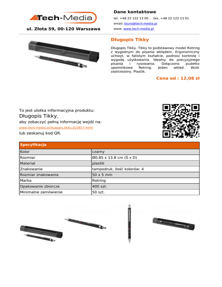 Dane kontaktowe tel. +48 22 122 13 00 , fax. +48 22 122 13 01 email: [email protected] ul. Złota 59, 00-120 Warszawa www: www.tech-media.pl Długopis Tikky Długopis Tikky. Tikky to podstawowy model Rotring z wygodnym do pisania wkładem. Ergonomiczny uchwyt, w falistym kształcie, podnosi kontrolę i wygodę użytkowania. Idealny do precyzyjnego pisania i rysowania. Dołączono pudełko upominkowe Rotring. Jeden wkład. Wzór zastrzeżony. Plastik. Cena od : 12,08 zł To jest ulotka informacyjna produktu: Długopis Tikky, aby zobaczyć pełną informację wejdź na: www.tech-media.pl/dugopis,tikky,022817.html lub zeskanuj kod QR. Specyfikacja Kolor czarny Rozmiar Ø0.85 x 13.8 cm (Ś x D) Materiał plastik Znakowanie tampodruk, ilość kolorów: 4 Rozmiar znakowania 50 x 5 mm Marka Rotring Opakowanie zbiorcze 400 szt. Minimalne zamówienie 50 szt.