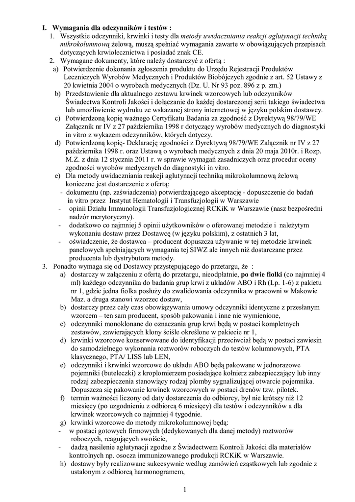 I. Wymagania dla odczynników i testów : 1. Wszystkie odczynniki, krwinki i testy dla metody uwidaczniania reakcji aglutynacji techniką mikrokolumnową żelową, muszą spełniać wymagania zawarte w obowiązujących przepisach dotyczących krwiolecznictwa i posiadać znak CE. 2. Wymagane dokumenty, które należy dostarczyć z ofertą : a) Potwierdzenie dokonania zgłoszenia produktu do Urzędu Rejestracji Produktów Leczniczych Wyrobów Medycznych i Produktów Biobójczych zgodnie z art. 52 Ustawy z 20 kwietnia 2004 o wyrobach medycznych (Dz. U. Nr 93 poz. 896 z p. zm.) b) Przedstawienie dla aktualnego zestawu krwinek wzorcowych lub odczynników Świadectwa Kontroli Jakości i dołączanie do każdej dostarczonej serii takiego świadectwa lub umożliwienie wydruku ze wskazanej strony internetowej w języku polskim dostawcy. c) Potwierdzoną kopię ważnego Certyfikatu Badania za zgodność z Dyrektywą 98/79/WE Załącznik nr IV z 27 października 1998 r dotyczący wyrobów medycznych do diagnostyki in vitro z wykazem odczynników, których dotyczy. d) Potwierdzoną kopię- Deklarację zgodności z Dyrektywą 98/79/WE Załącznik nr IV z 27 października 1998 r. oraz Ustawą o wyrobach medycznych z dnia 20 maja 2010r. i Rozp. M.Z. z dnia 12 stycznia 2011 r. w sprawie wymagań zasadniczych oraz procedur oceny zgodności wyrobów medycznych do diagnostyki in vitro. e) Dla metody uwidaczniania reakcji aglutynacji techniką mikrokolumnową żelową konieczne jest dostarczenie z ofertą: - dokumentu (np. zaświadczenia) potwierdzającego akceptację - dopuszczenie do badań in vitro przez Instytut Hematologii i Transfuzjologii w Warszawie - opinii Działu Immunologii Transfuzjologicznej RCKiK w Warszawie (nasz bezpośredni nadzór merytoryczny). - dodatkowo co najmniej 5 opinii użytkowników o oferowanej metodzie i należytym wykonaniu dostaw przez Dostawcę (w języku polskim), z ostatnich 3 lat, - oświadczenie, że dostawca – producent dopuszcza używanie w tej metodzie krwinek panelowych spełniających wymagania tej SIWZ ale innych niż dostarczane przez producenta lub dystrybutora metody. 3. Ponadto wymaga się od Dostawcy przystępującego do przetargu, że : a) dostarczy w załączeniu z ofertą do przetargu, nieodpłatnie, po dwie fiolki (co najmniej 4 ml) każdego odczynnika do badania grup krwi z układów ABO i Rh (Lp. 1-6) z pakietu nr 1, gdzie jedna fiolka posłuży do zwalidowania odczynnika w pracowni w Makowie Maz. a druga stanowi wzorzec dostaw, b) dostarczy przez cały czas obowiązywania umowy odczynniki identyczne z przesłanym wzorcem – ten sam producent, sposób pakowania i inne nie wymienione, c) odczynniki monoklonane do oznaczania grup krwi będą w postaci kompletnych zestawów, zawierających klony ściśle określone w pakiecie nr 1, d) krwinki wzorcowe konserwowane do identyfikacji przeciwciał będą w postaci zawiesin do samodzielnego wykonania roztworów roboczych do testów kolumnowych, PTA klasycznego, PTA/ LISS lub LEN, e) odczynniki i krwinki wzorcowe do układu ABO będą pakowane w jednorazowe pojemniki (buteleczki) z kroplomierzem posiadające kołnierz zabezpieczający lub inny rodzaj zabezpieczenia stanowiący rodzaj plomby sygnalizującej otwarcie pojemnika. Dopuszcza się pakowanie krwinek wzorcowych w postaci drenów tzw. pilotek. f) termin ważności liczony od daty dostarczenia do odbiorcy, był nie krótszy niż 12 miesięcy (po uzgodnieniu z odbiorcą 6 miesięcy) dla testów i odczynników a dla krwinek wzorcowych co najmniej 4 tygodnie. g) krwinki wzorcowe do metody mikrokolumnowej będą: - w postaci gotowych firmowych (dedykowanych dla danej metody) roztworów roboczych, reagujących swoiście, - dadzą nasilenie aglutynacji zgodne z Świadectwem Kontroli Jakości dla materiałów kontrolnych np. osocza immunizowanego produkcji RCKiK w Warszawie. h) dostawy były realizowane sukcesywnie według zamówień cząstkowych lub zgodnie z ustalonym z odbiorcą harmonogramem, 1 i) dopuści możliwość modyfikacji dostaw w zależności od zmiennych potrzeb, j) zapewni możliwość realizacji zamówienia do 3 dni oraz telefonicznego lub internetowego składania zamówień i realizacji w ciągu 24 godzin, k) zorganizuje na własny koszt i ryzyko transport dostaw do magazynu zamawiającego zgodny z wymaganymi warunkami temperatury i czasu dla danego odczynnika, l) każdą serię odczynnika, krwinek lub kart z testami mikrokolunowymi dostarczy z dołączoną specyfikacją w języku polskim zawierającą instrukcję wykonania oraz opis profilu odczynników w mikrokolumnach. II. Wymagania dla sprzętu do mikrokolumnowej techniki żelowej: 1. Dzierżawa udostępnionego sprzętu zamawiającemu. 2. Łatwość pracy i obsługi. 3. Posiada instrukcję obsługi w języku polskim. 4. Sprzęt w postaci: a) Wirówka - 24 karty lub dwie po 12 kart, b) Inkubator - do 24 kart z możliwością inkubacji probówek lub dodatkowo oddzielnie inkubator do probówek , c) Dozownik (dyspenser) do buforu LISS, d) Pipetor nastawny manualny, dozujący po 10 μl ,25 μl i nie mniej niż 6 x 50 μl, e) Pipetor elektroniczny nastawny, dozujący po 10 μl ,25 μl i nie mniej niż 6x50 μl - nowy, Sprzęt wymieniony w punktach a – d może być nowy lub używany nie dłużej niż 3 lata. 5. Dostawca przystępując do przetargu jednocześnie oświadcza , że : a) Przeglądy, serwis i coroczna walidacja będzie wykonana na koszt dostawcy, b) Naprawa lub wymiana na inny sprzęt zwalidowany będzie dokonana do 24 godz. od zgłoszenia w dni robocze i do 48 godz. w dni ustawowo wolne od pracy i jest możliwość zgłaszania 24 godz. na dobę. c) Sprzęt używany po trzeciej awarii będzie wymieniony na nowy, sprawny i zwalidowany. d) Dokona szkolenia, w zakresie obsługi sprzętu do wykonania badań , na własny koszt. Uwagi do umieszczenia w umowie, w punktach dotyczących odszkodowań za opóźnienia lub złą jakość dostaw. 1. Nie spełnienie dowolnego punktu wymagań spowo